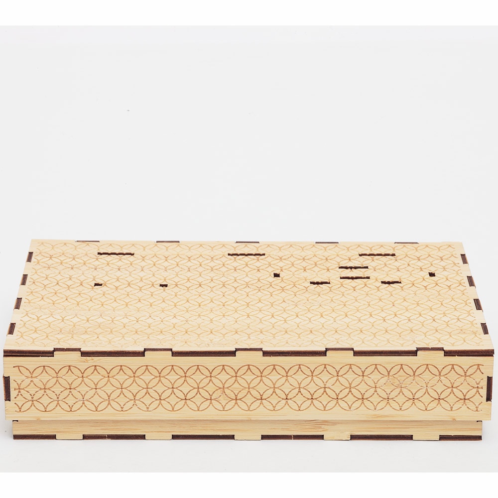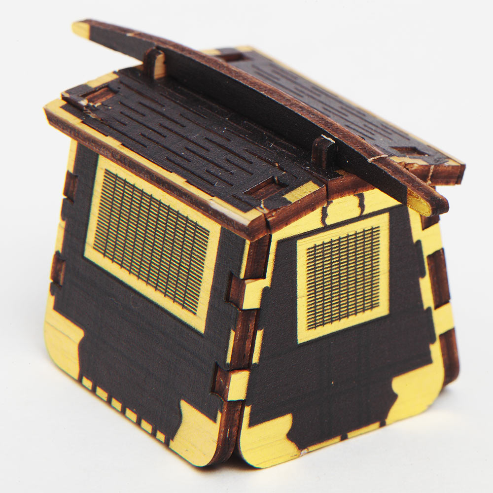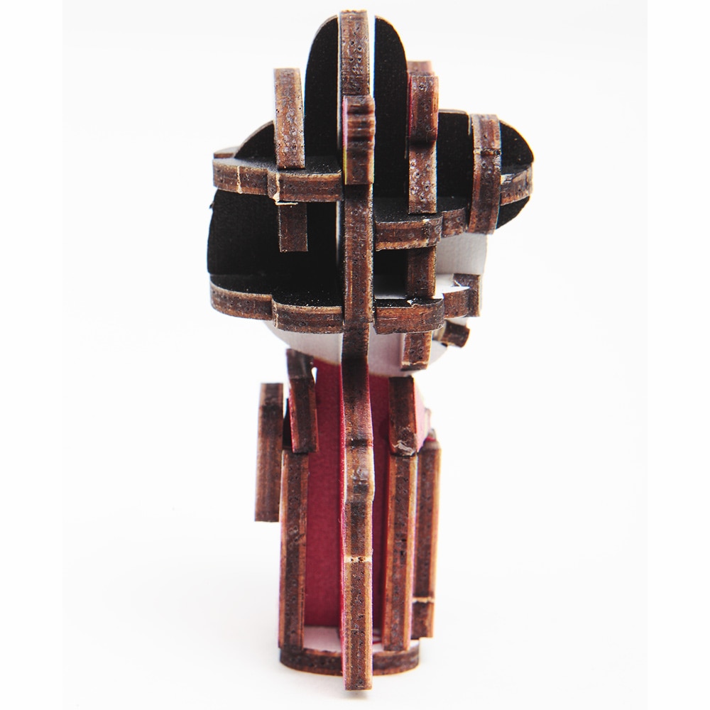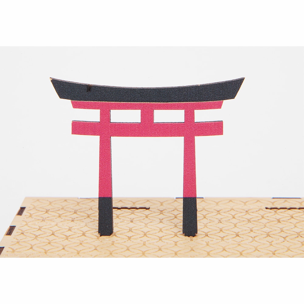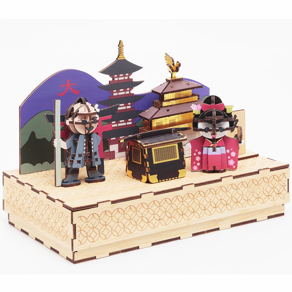 京都を思わせる金閣寺や五重塔のパーツが目を引く手軽に組み立てられる竹製のパズルです。