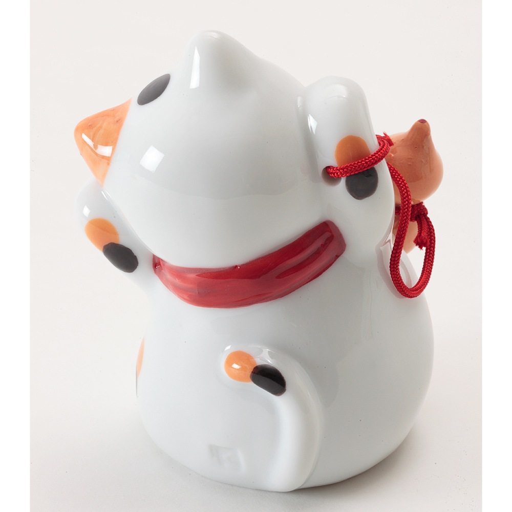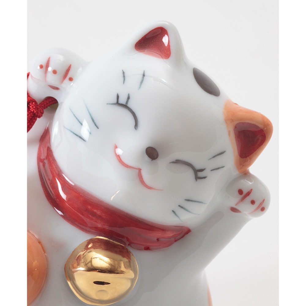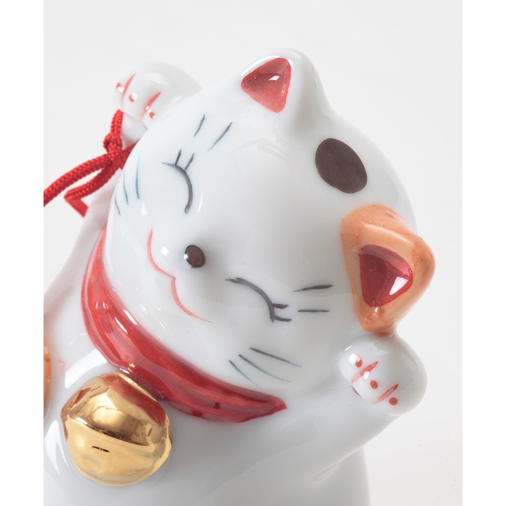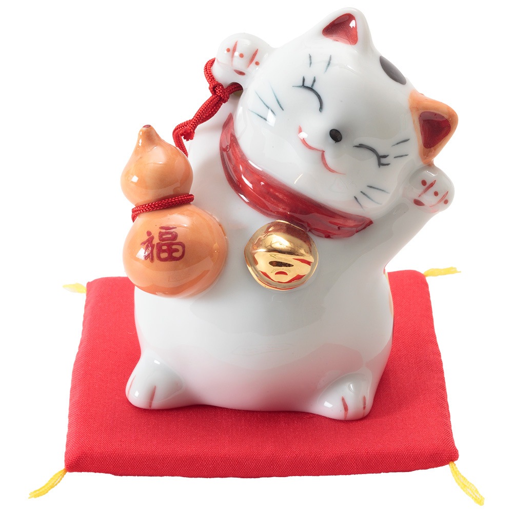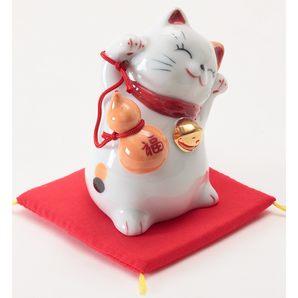 招き猫の右手は幸福や金運を、左手は人を招くといわれています。両手を挙げた猫はその両方を招くとされ、大変縁起が良いものです。