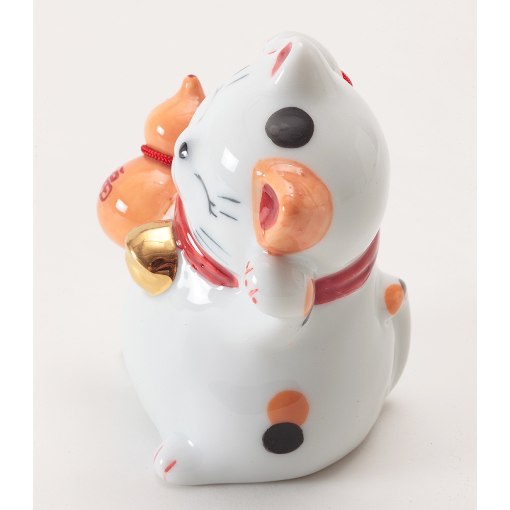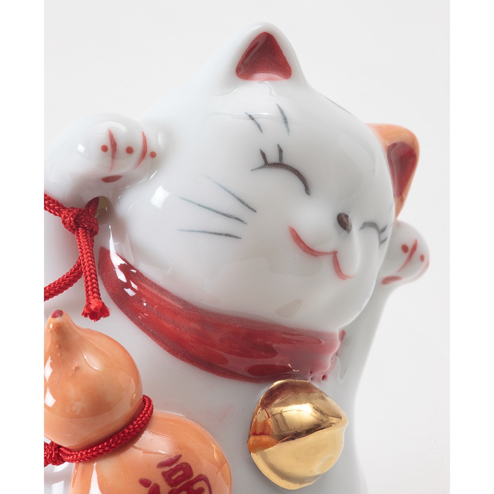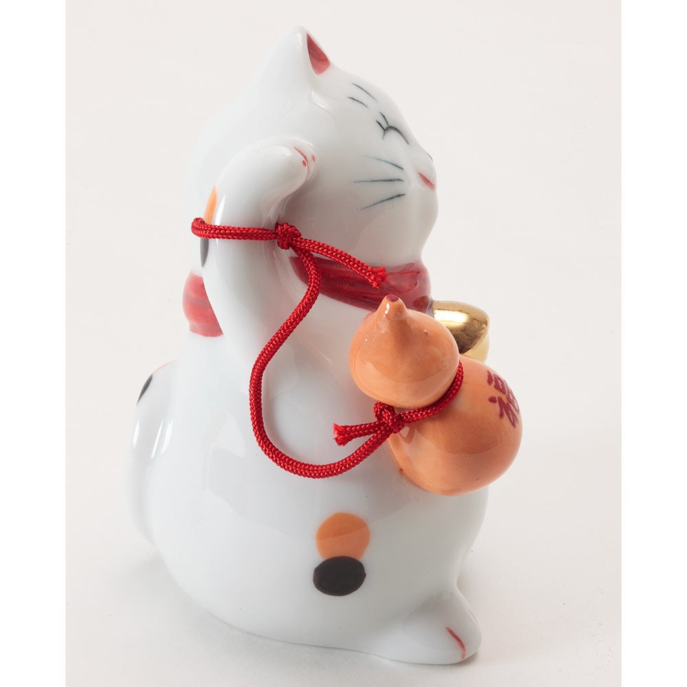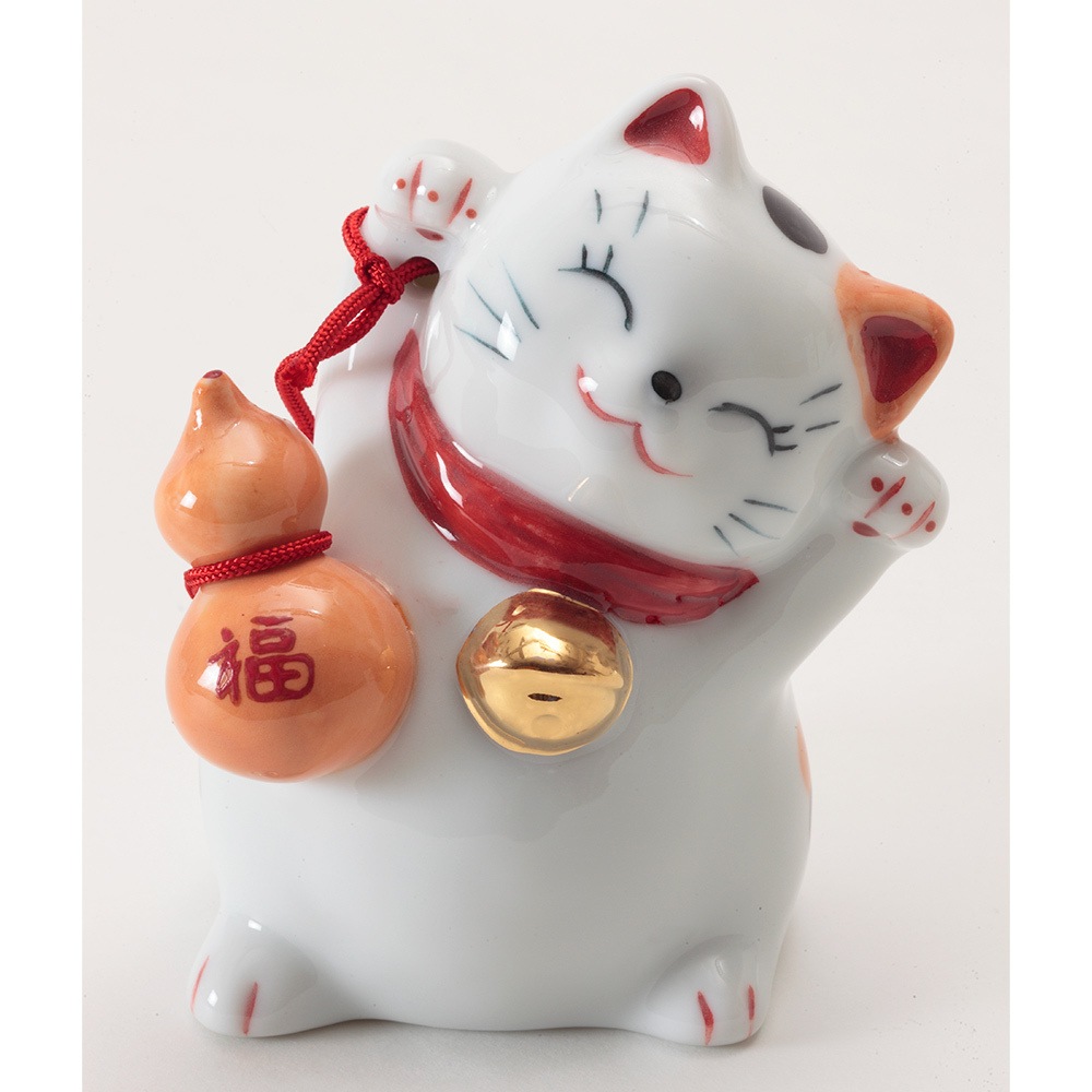 右手に瓢箪を持ち、両手を挙げた姿が特徴的な磁器製の招き猫です。