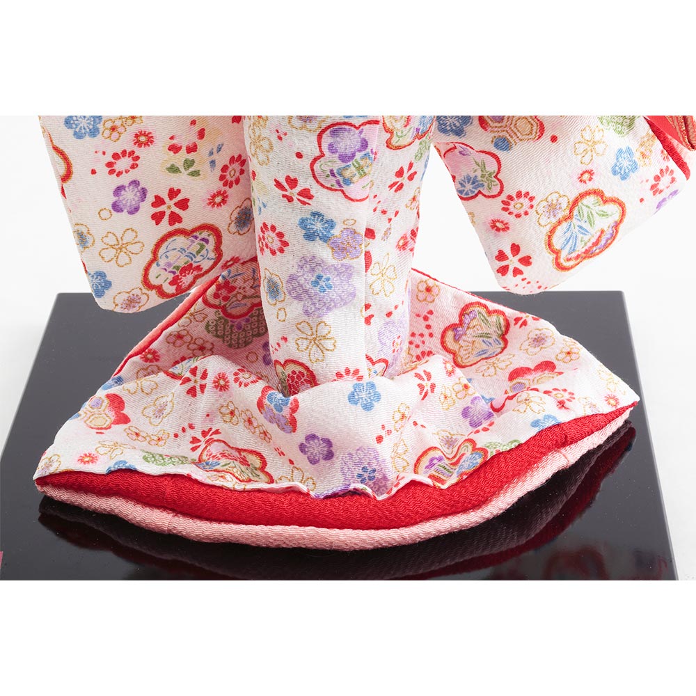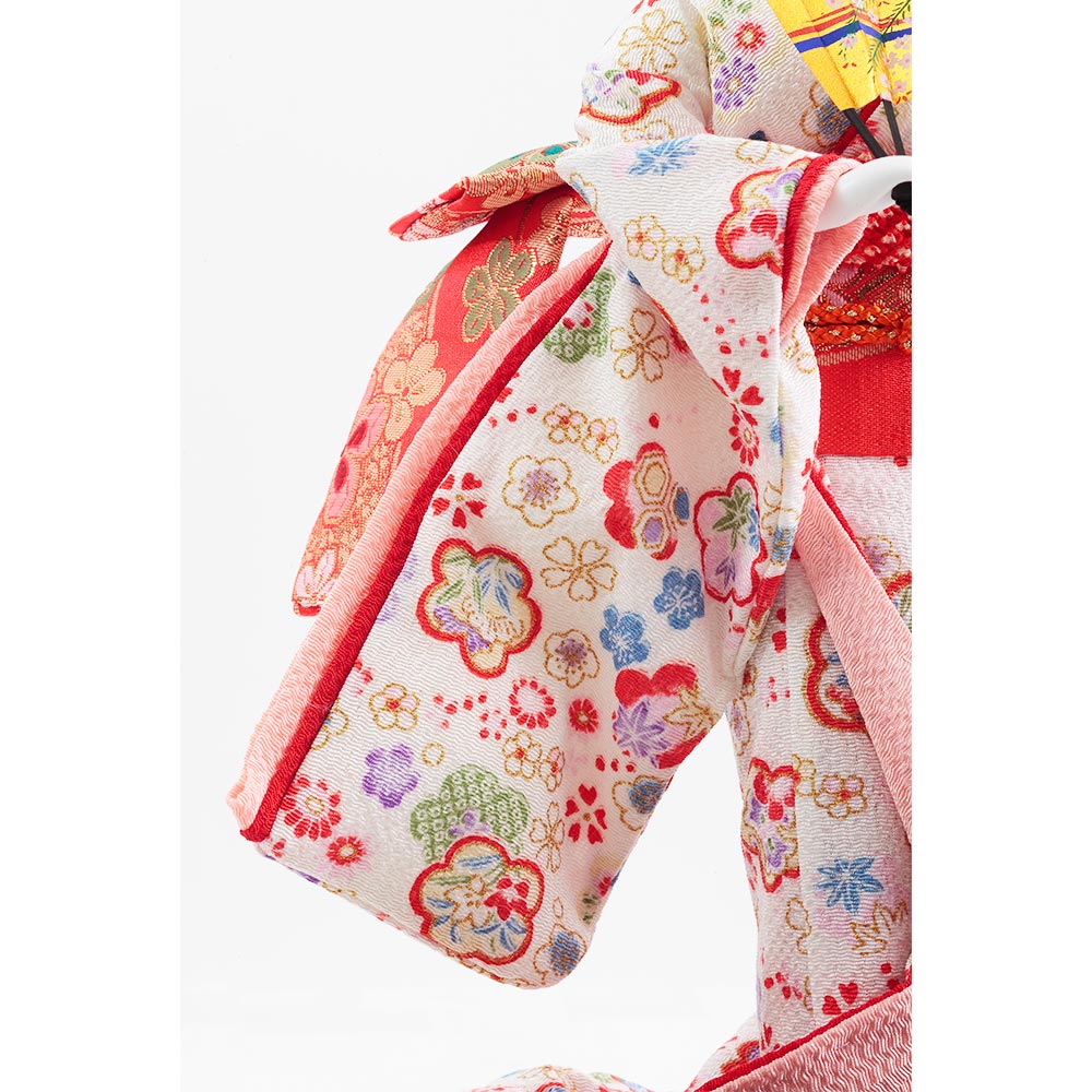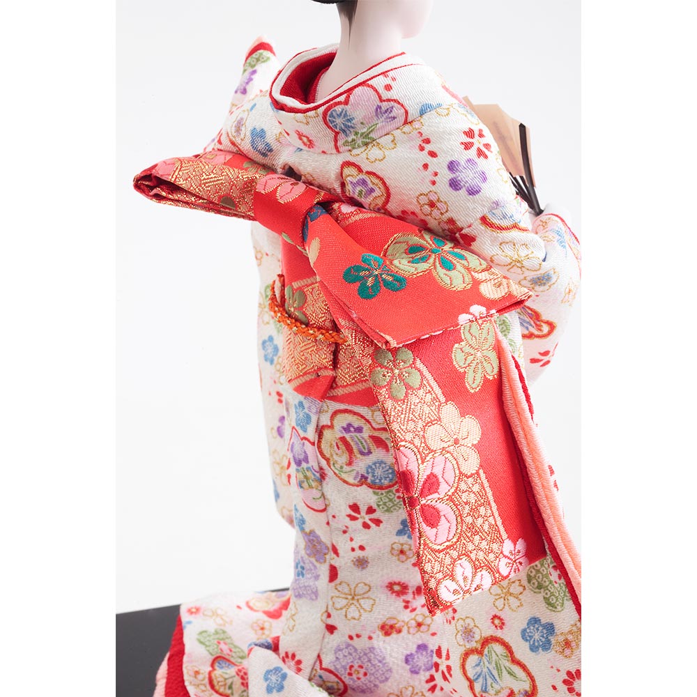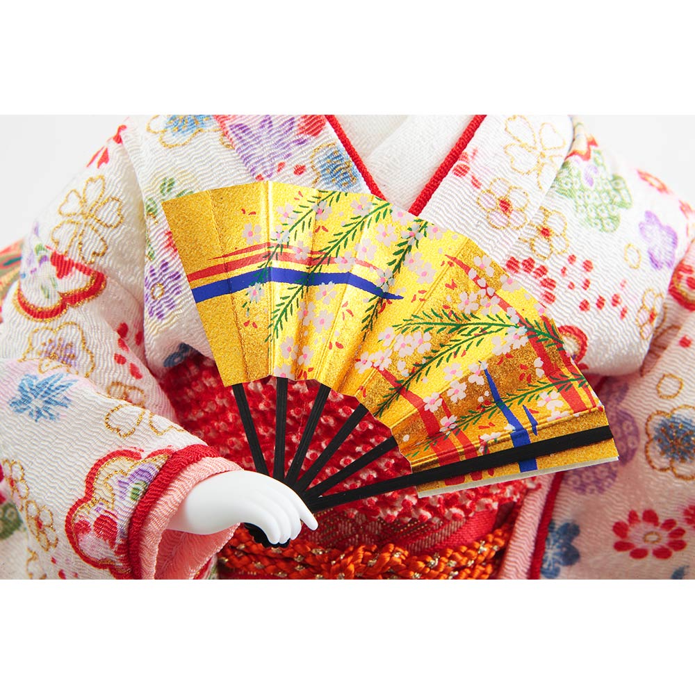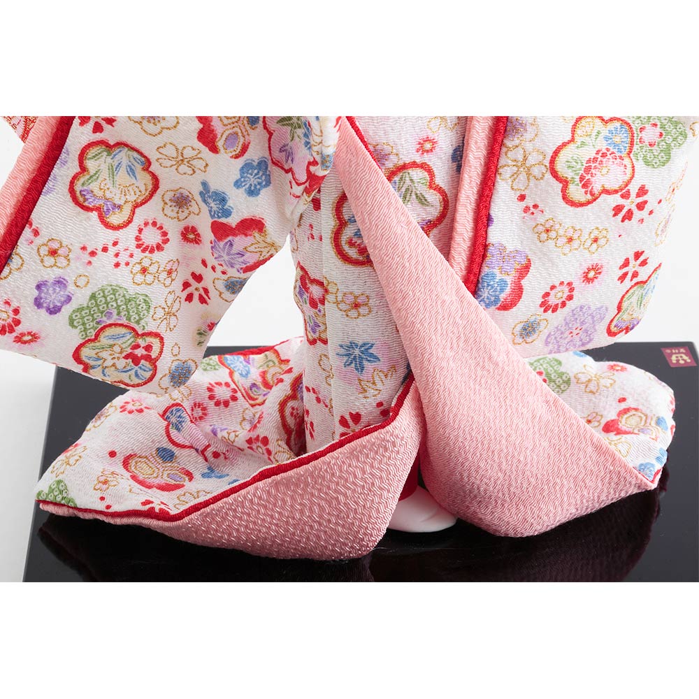 花の柄が上品にちりばめられた白色のちりめん友禅の生地を使用した衣裳に身を包んだ優美な佇まいの尾山人形です。