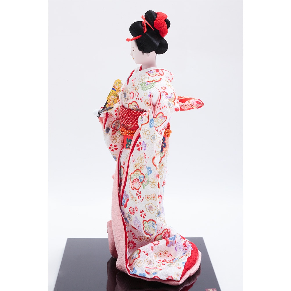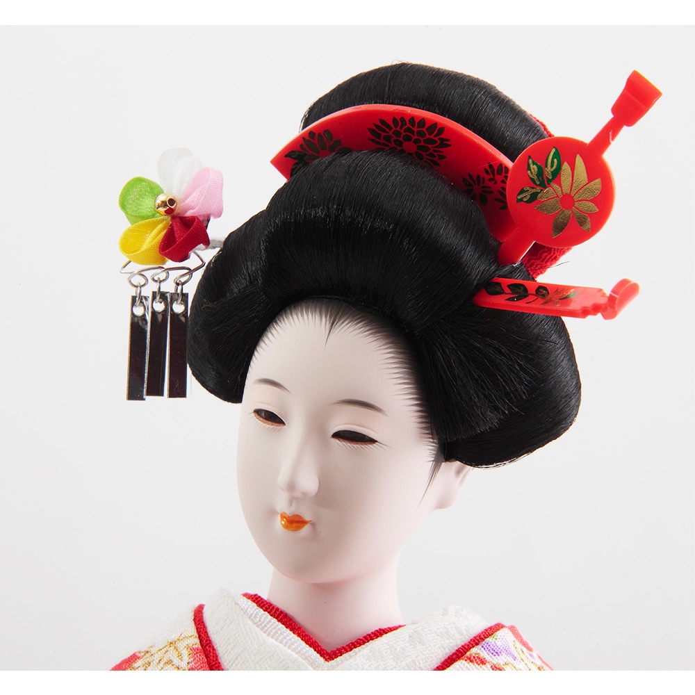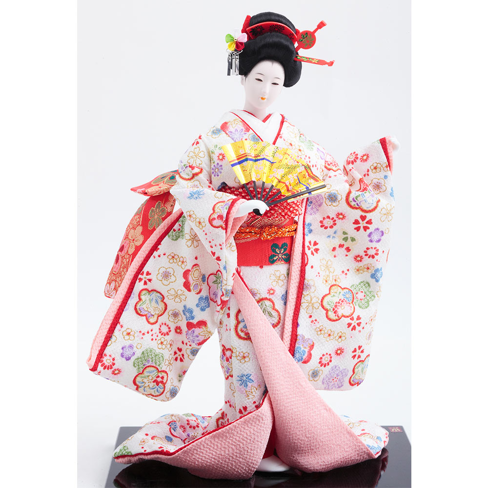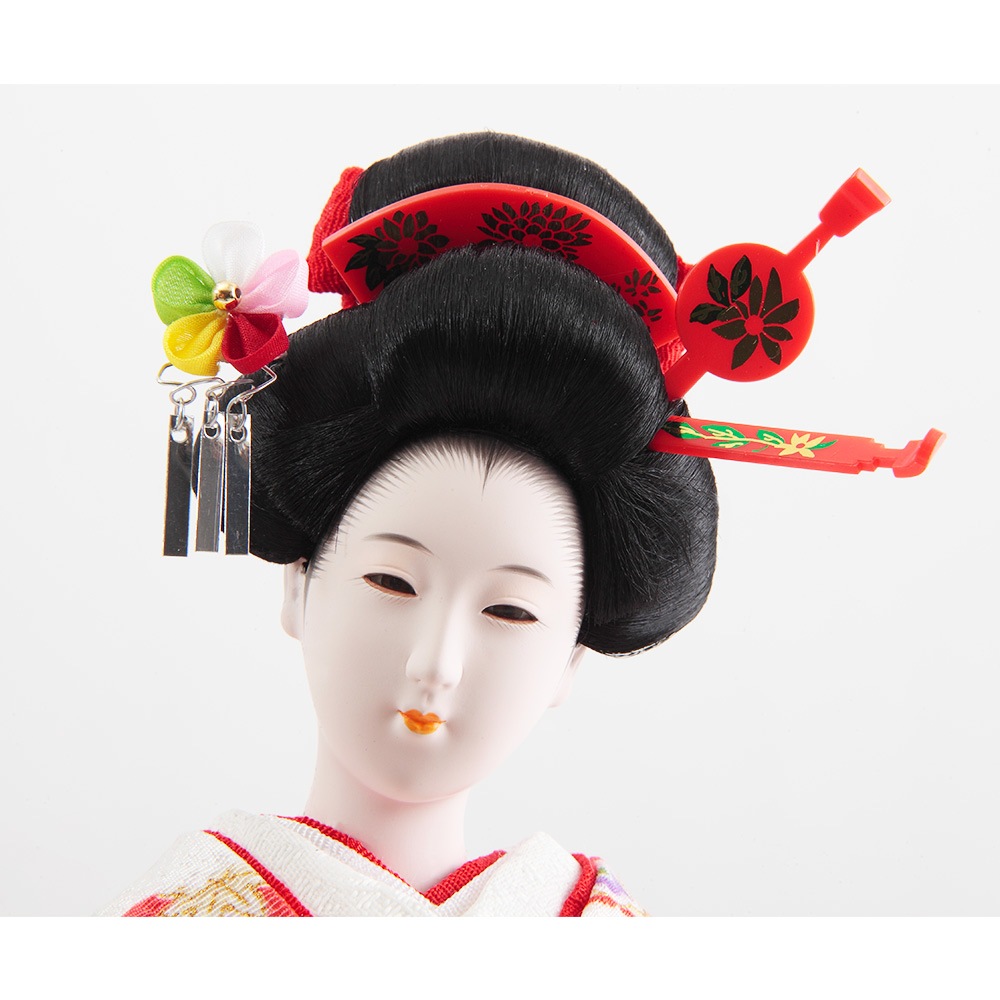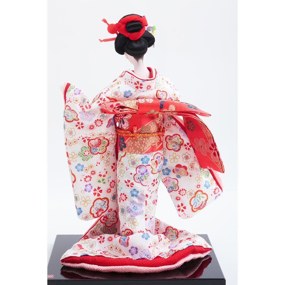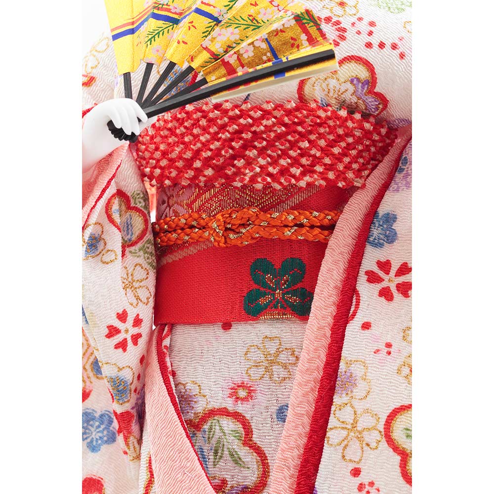 花の柄が上品にちりばめられた白色のちりめん友禅の生地を使用した衣裳に身を包んだ優美な佇まいの尾山人形です。