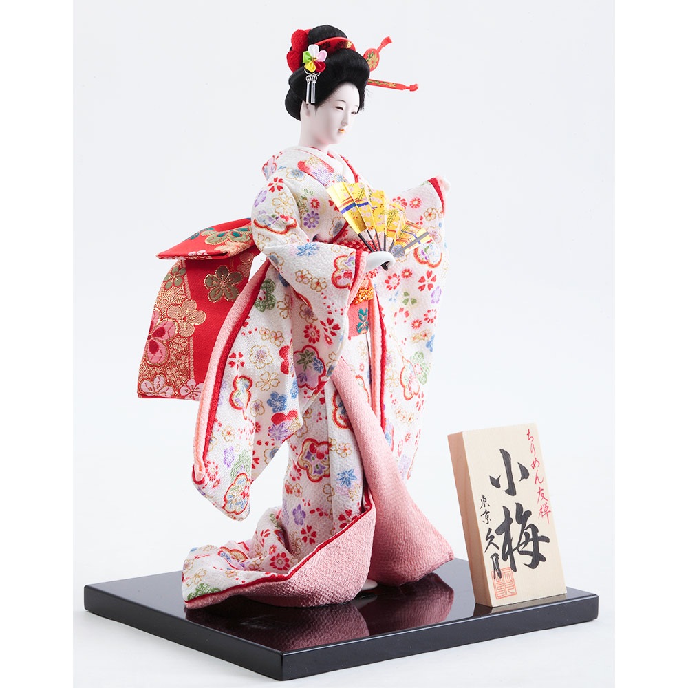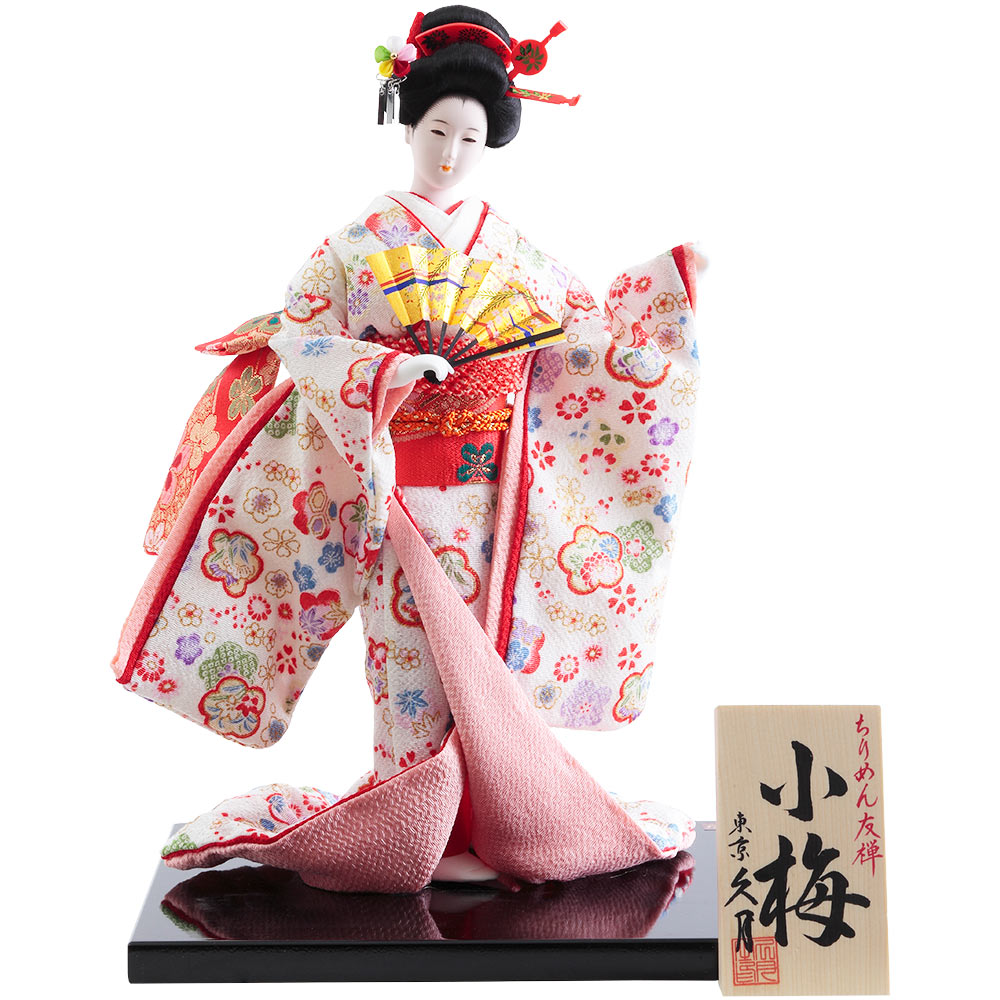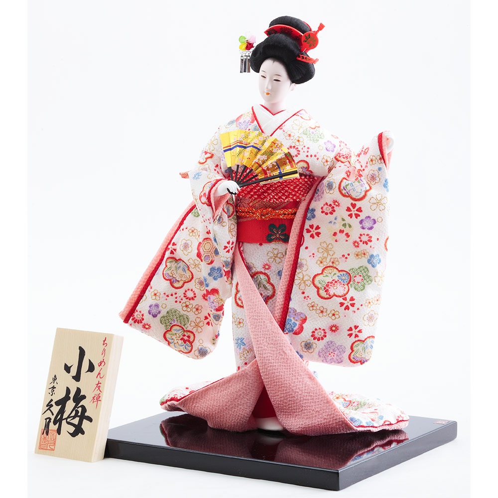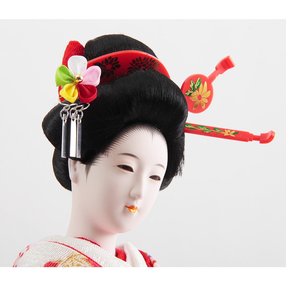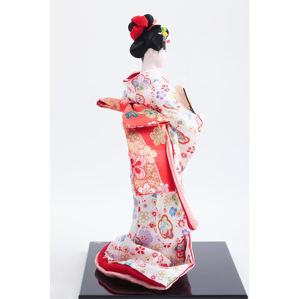 花の柄が上品にちりばめられた白色のちりめん友禅の生地を使用した衣裳に身を包んだ優美な佇まいの尾山人形です。