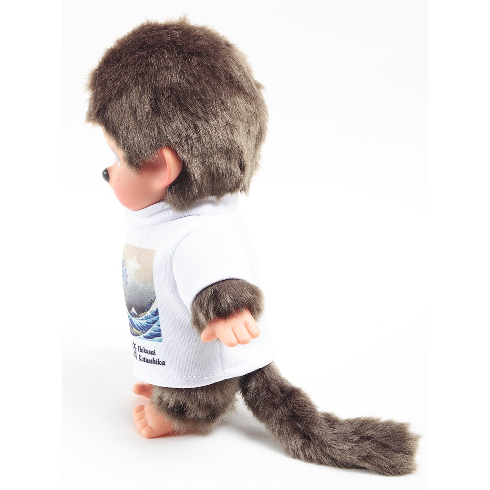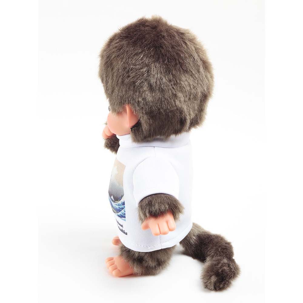 日本を代表する浮世絵師の葛飾北斎の名画がプリントされたTシャツを着たモンチッチです。