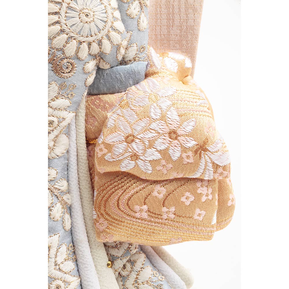 アイボリーと水色の模様が合わさった爽やかなケースに、刺繍のレースが印象的なオリエンタルテイストの羽子板が見事にマッチしたオリジナリティ溢れる優雅なお飾りです。