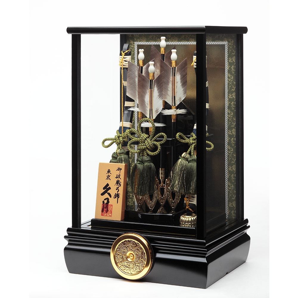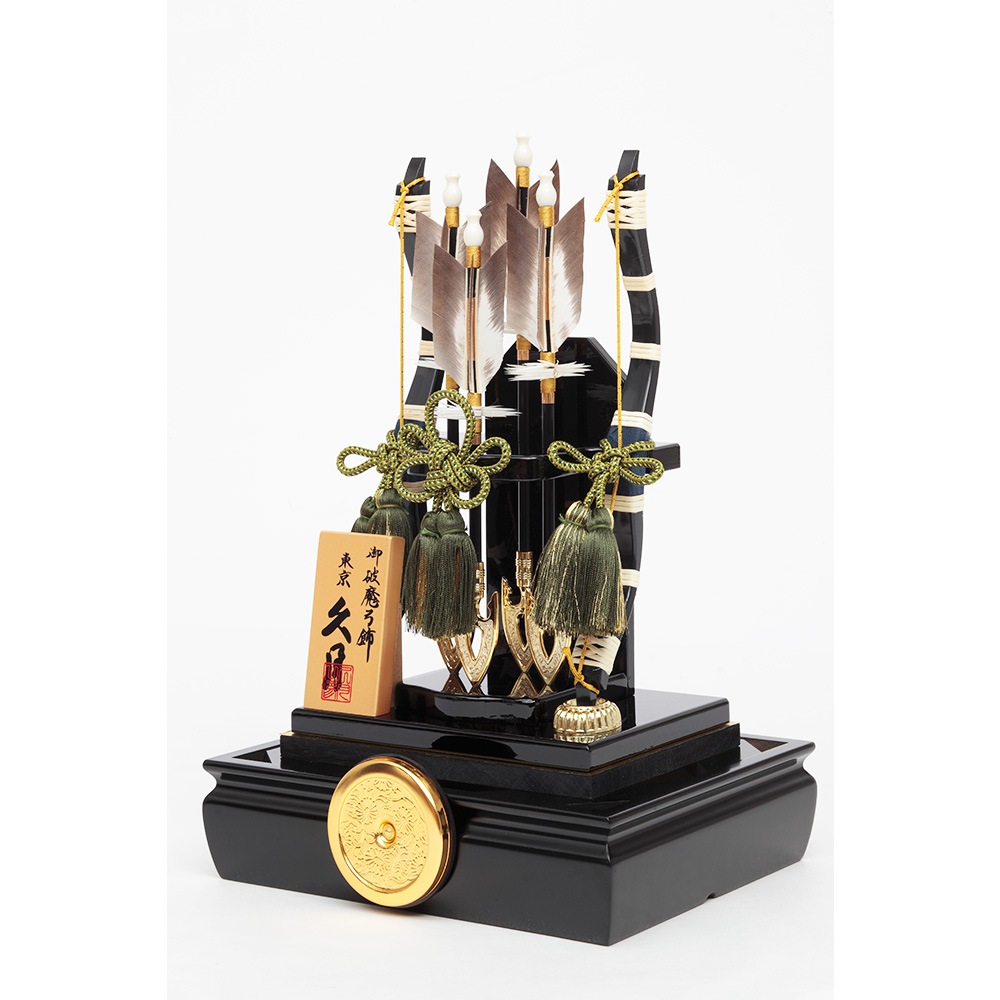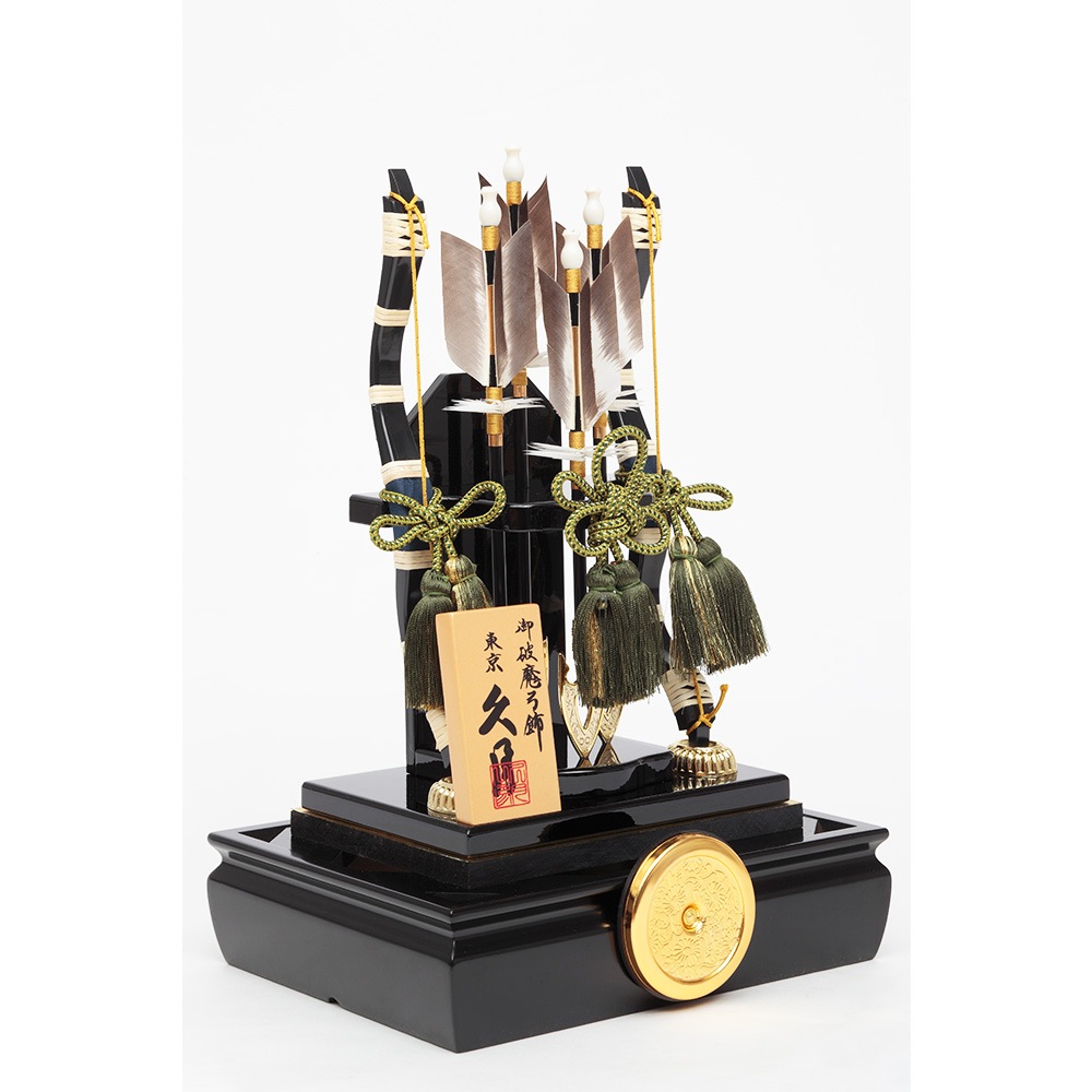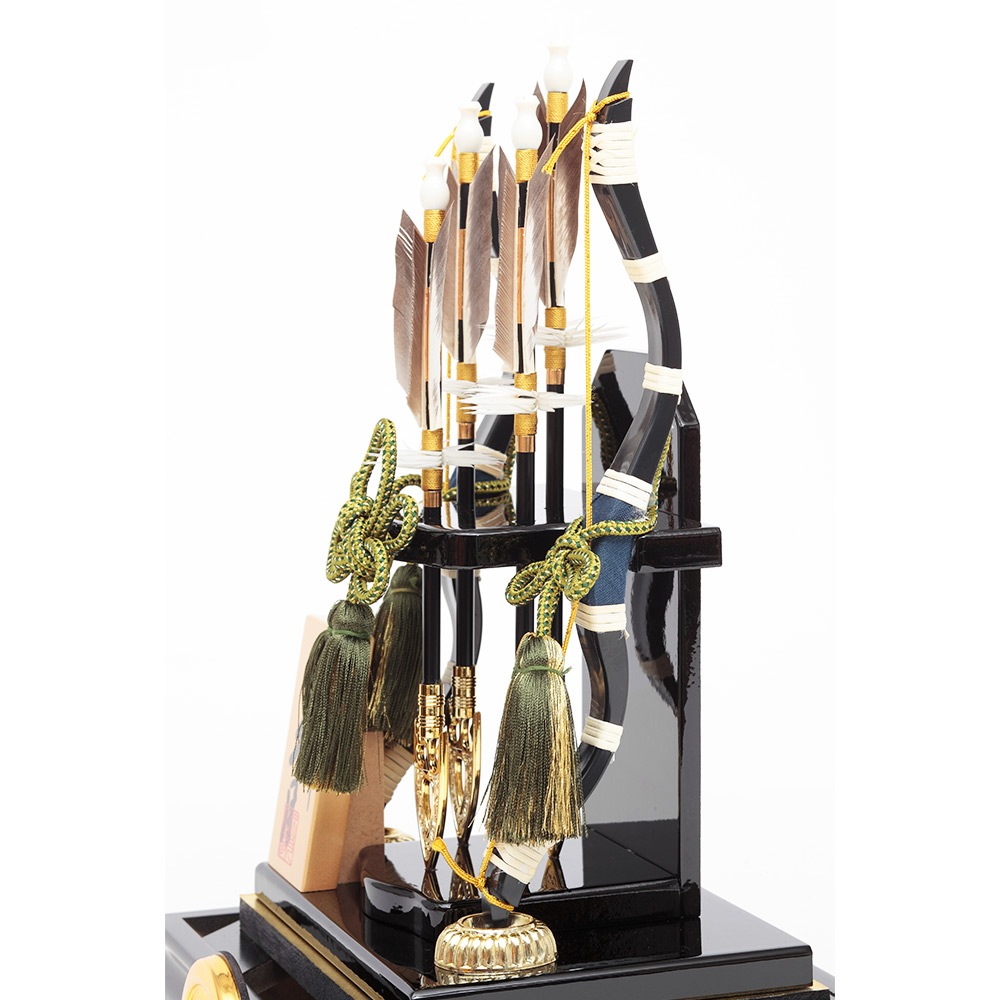 黒塗りのシックなケースが飽きのこない魅力を感じさせる、根強い人気を誇る破魔弓飾りです。