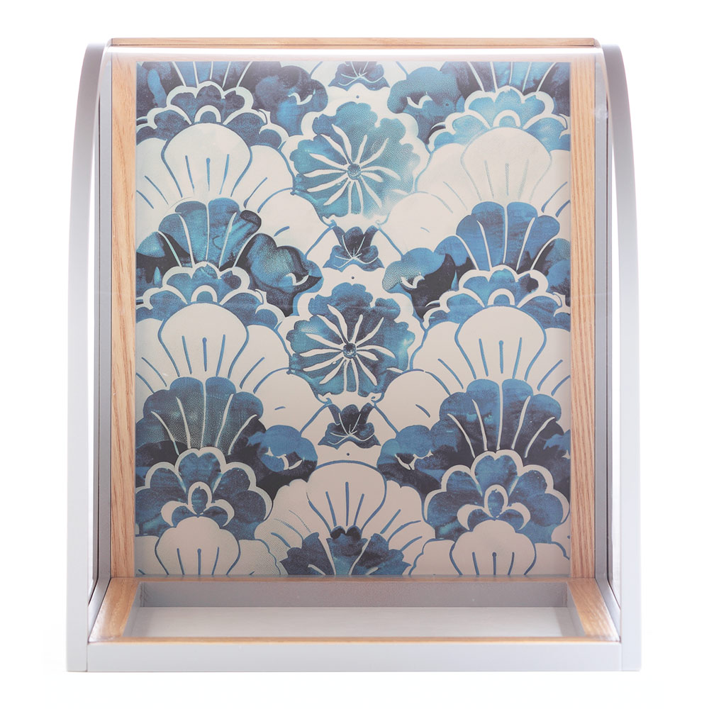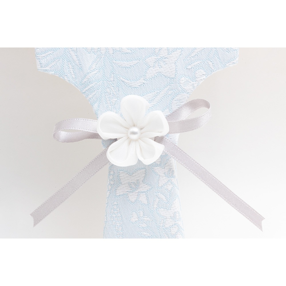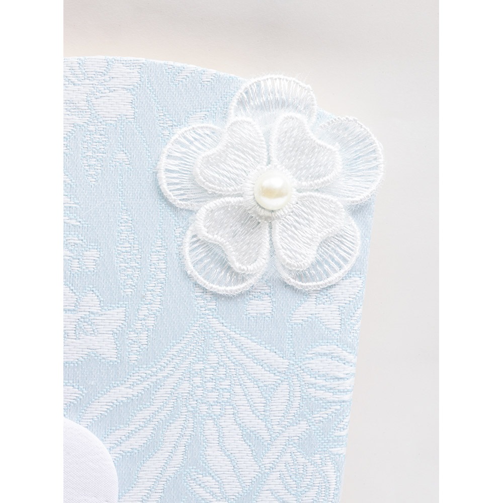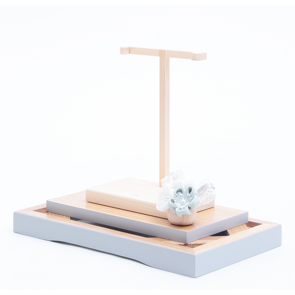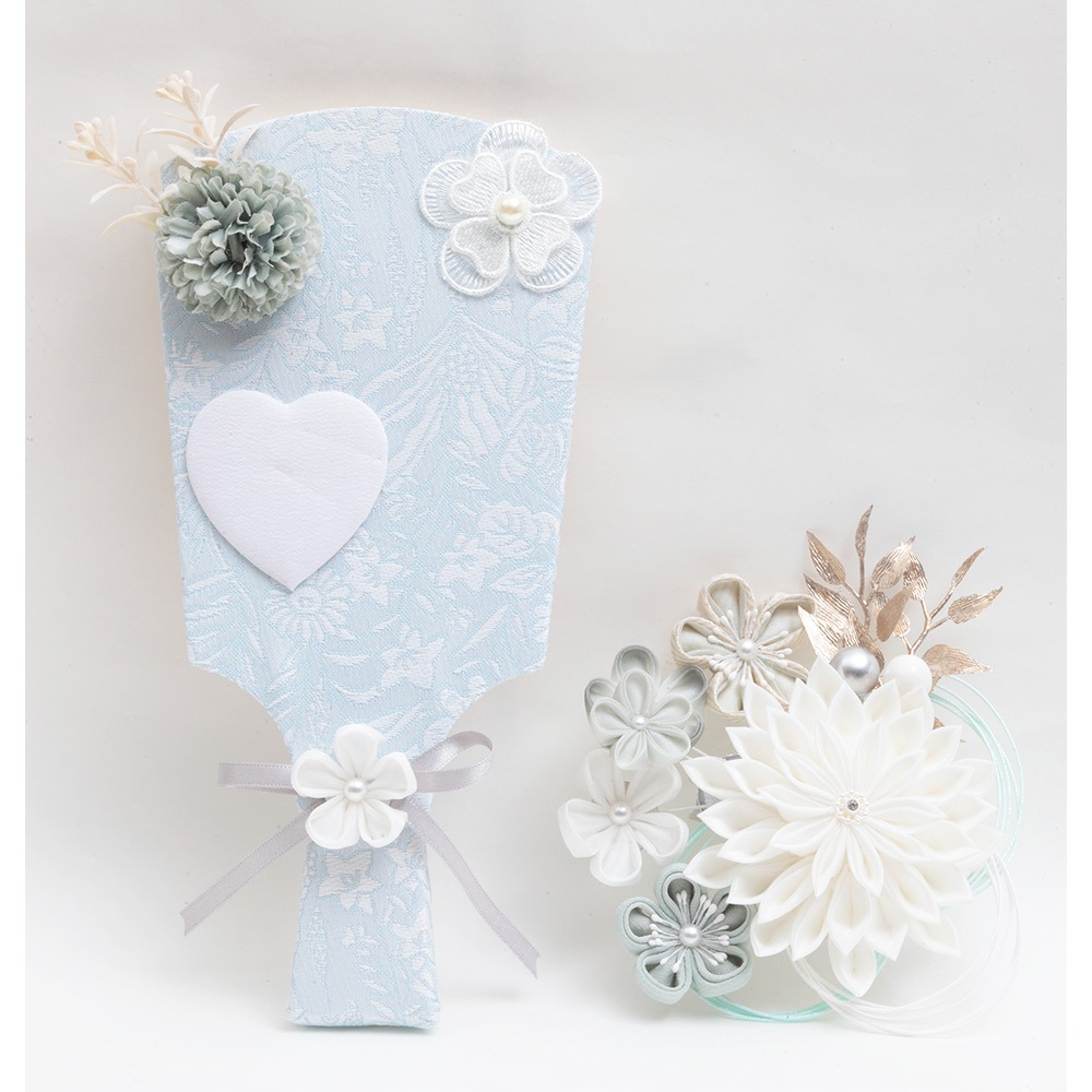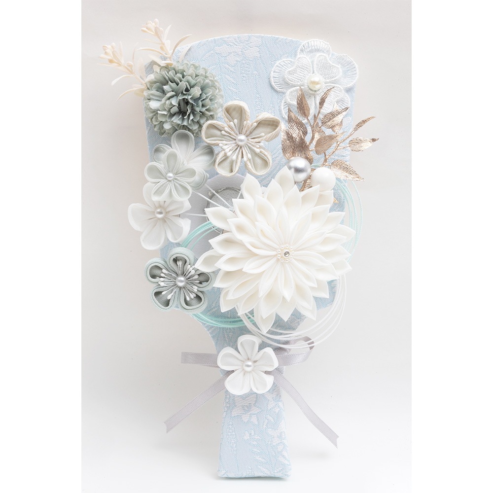 水色と白色の組み合わせがケース背景に見事にマッチした上品で洗練された雰囲気を醸し出すつまみ羽子板飾りです。