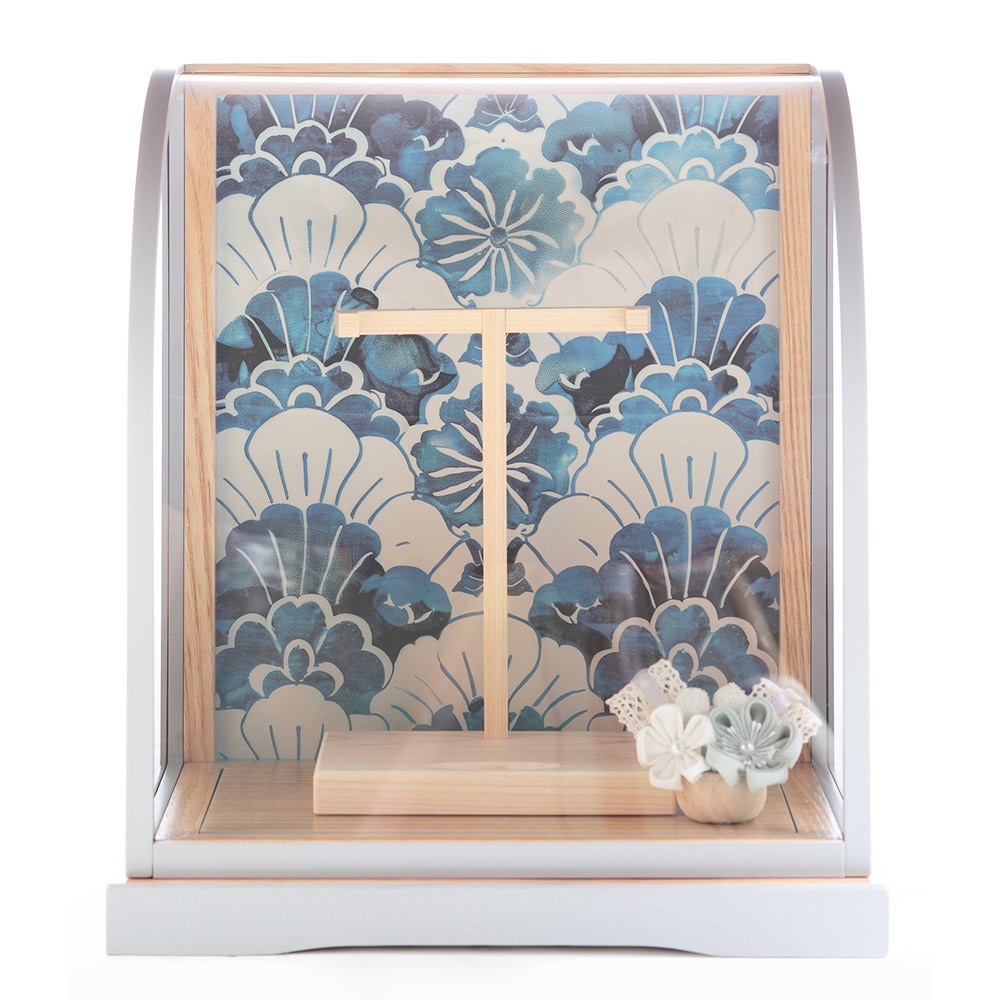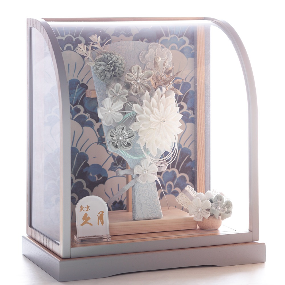 久月オリジナルの丸みを帯びたR型のケースに、つまみ細工や洋花をふんだんにあしらった羽子板飾りが映えます。