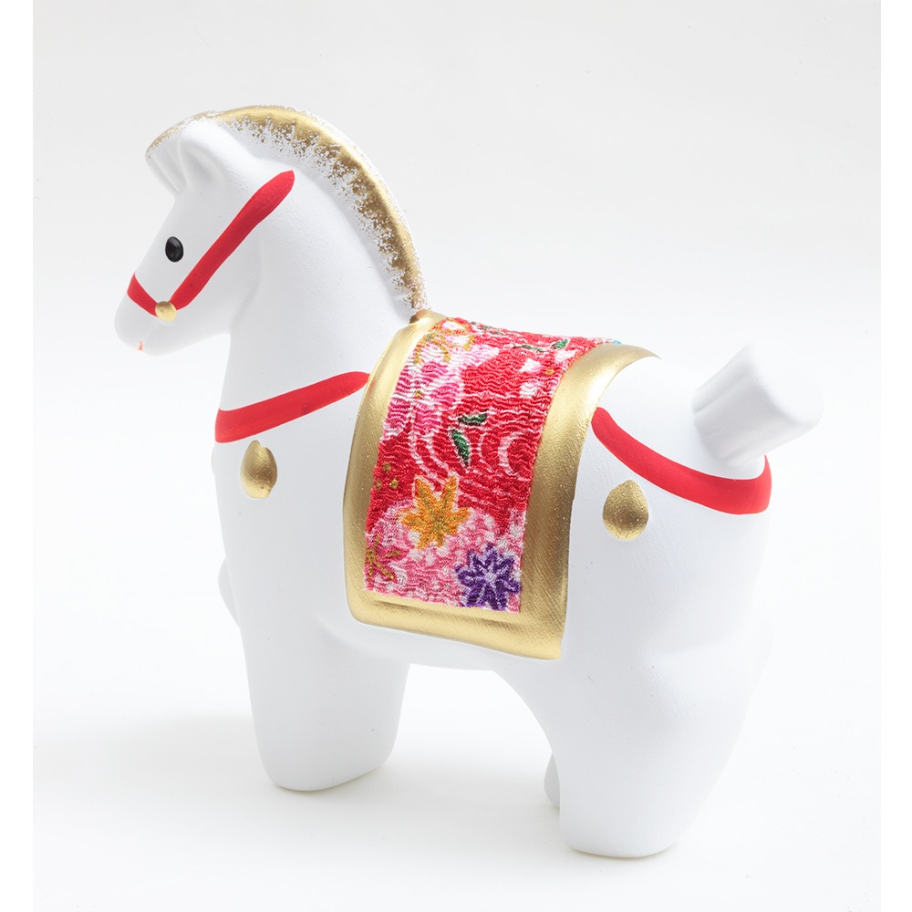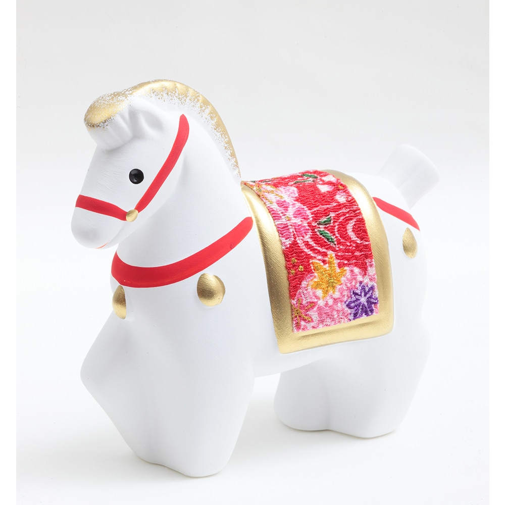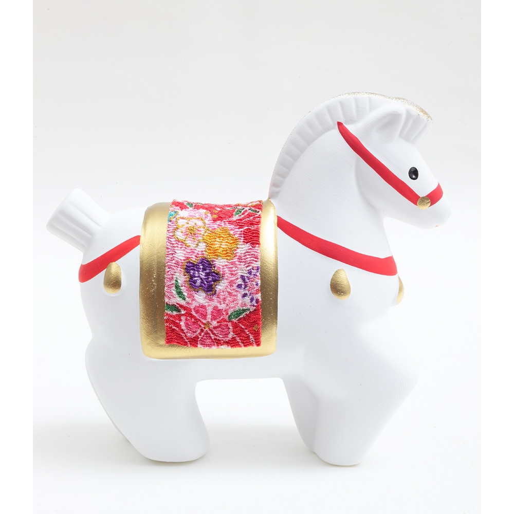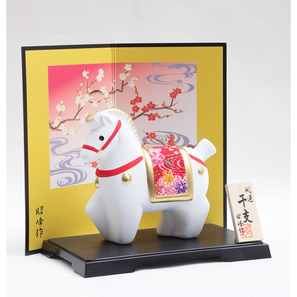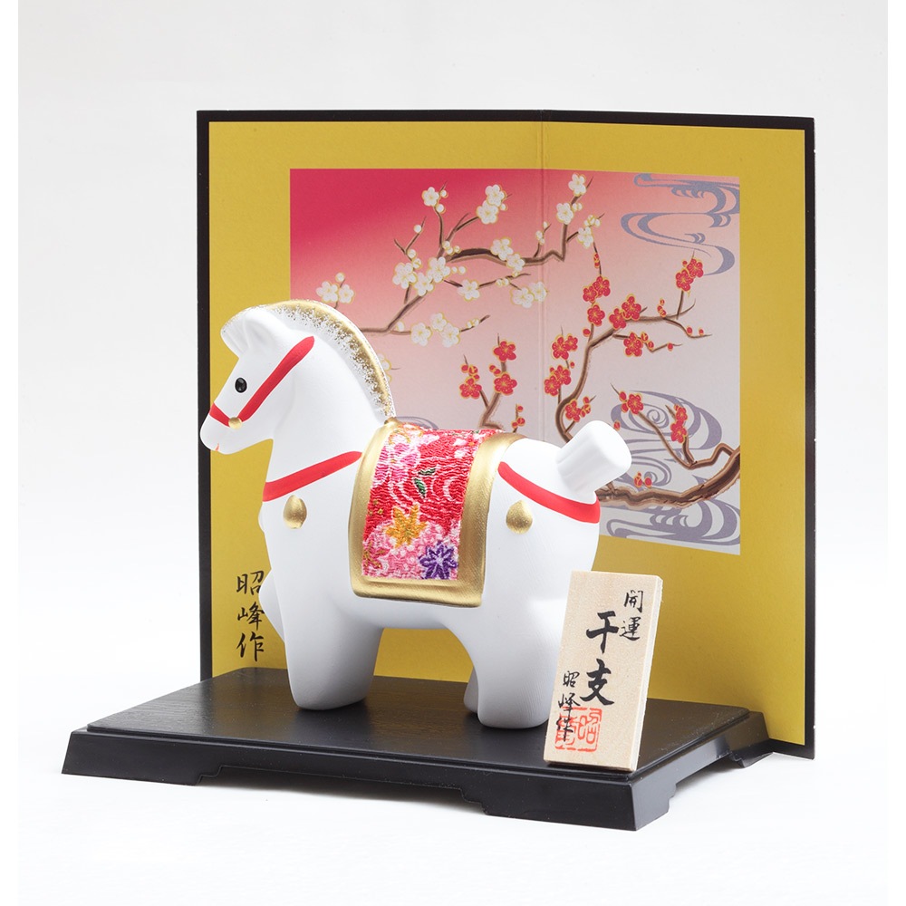 厳しい寒さに耐えた後にどの花よりも早く咲き、春の訪れを告げる喜びを意味する梅柄の屏風に白色の午が映える、縁起のよい午の干支飾りです。