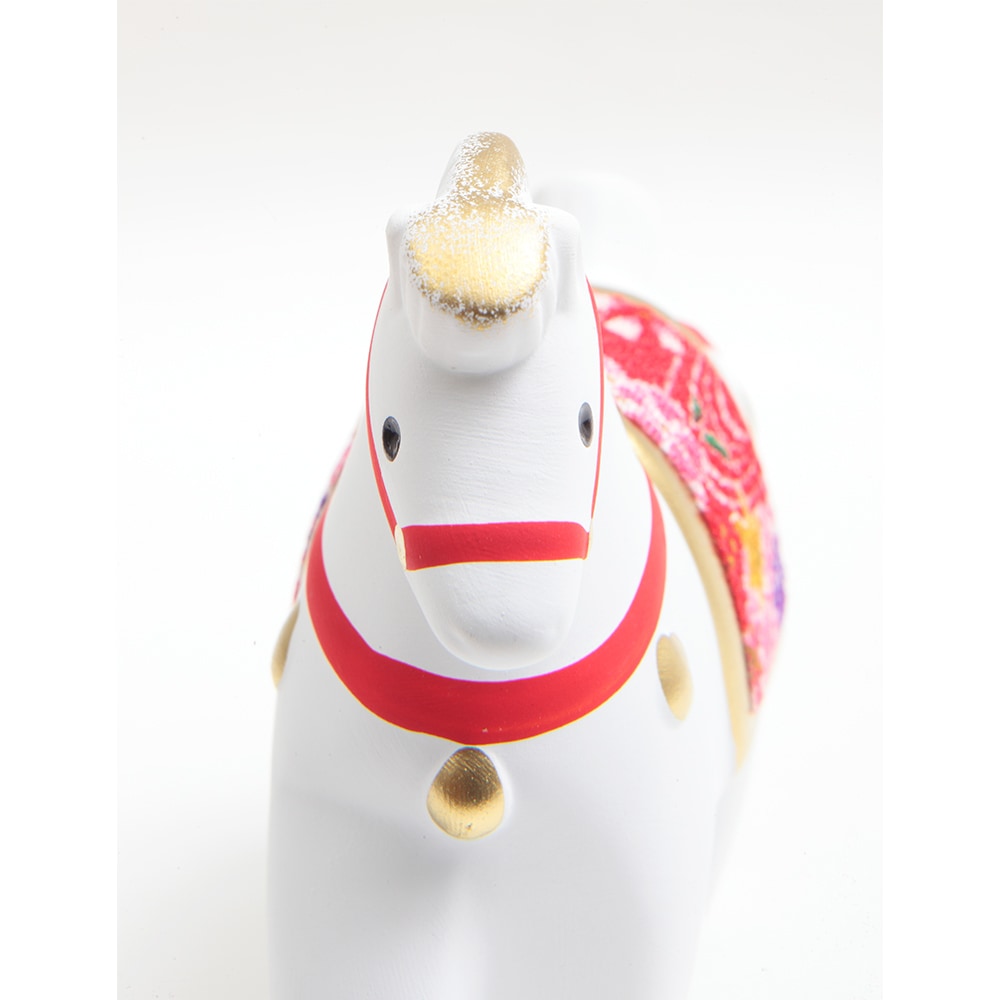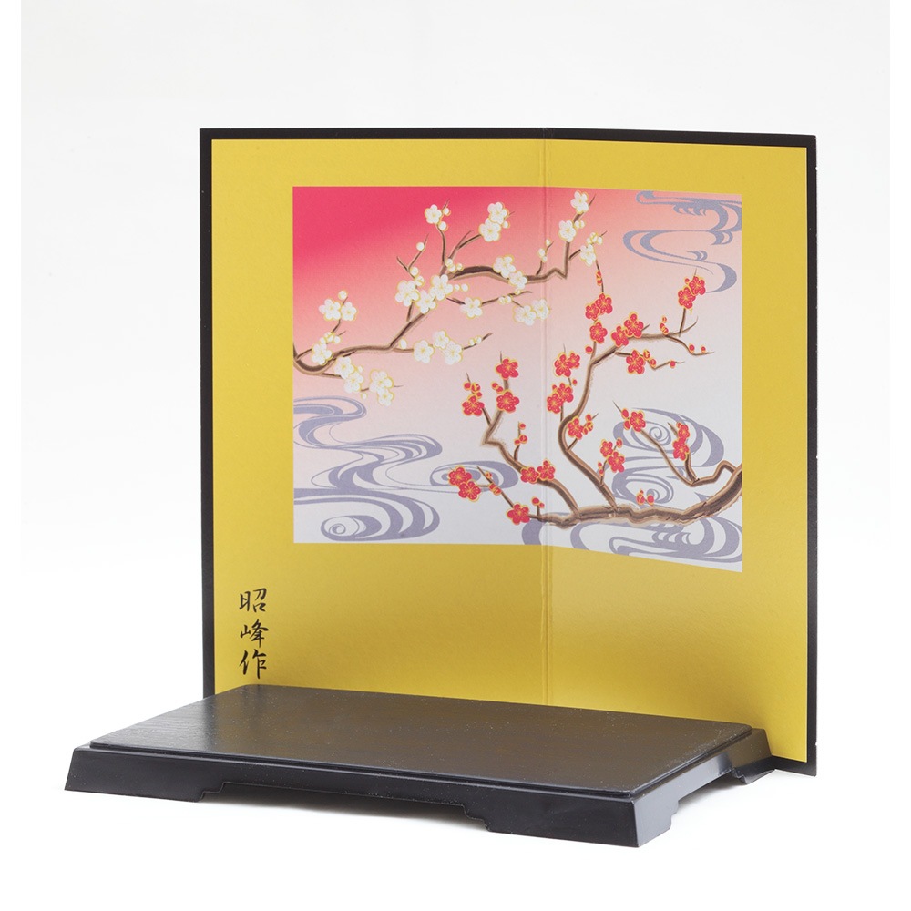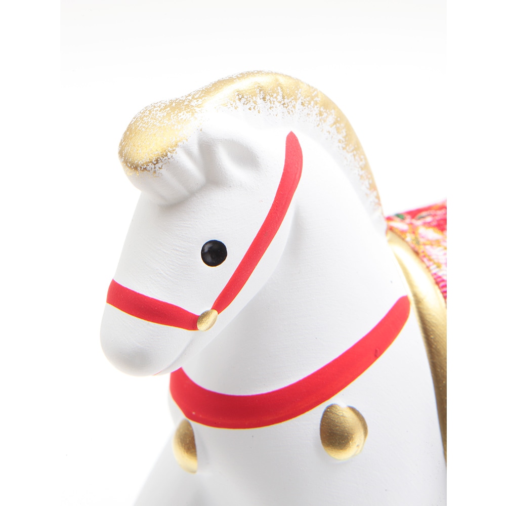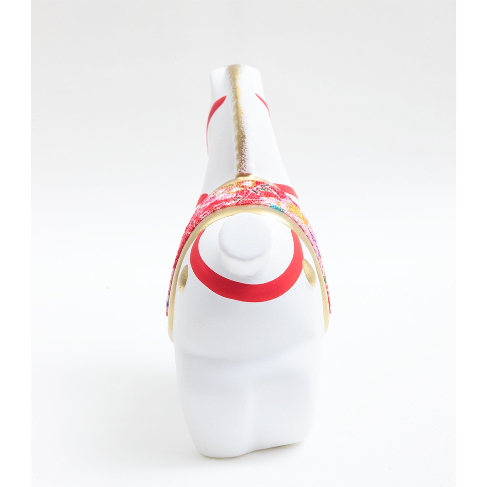 厳しい寒さに耐えた後にどの花よりも早く咲き、春の訪れを告げる喜びを意味する梅柄の屏風に白色の午が映える、縁起のよい午の干支飾りです。