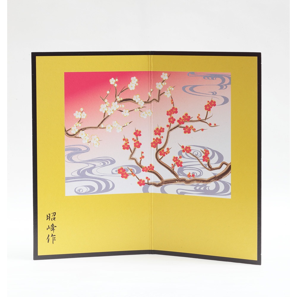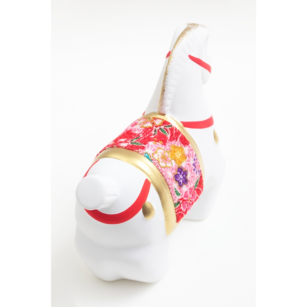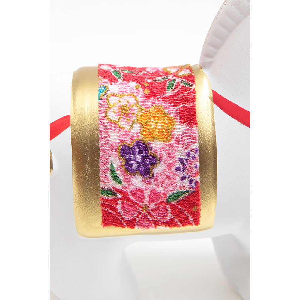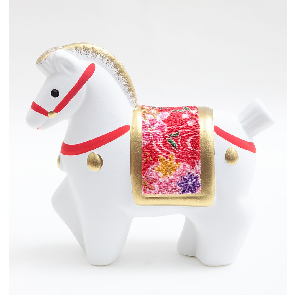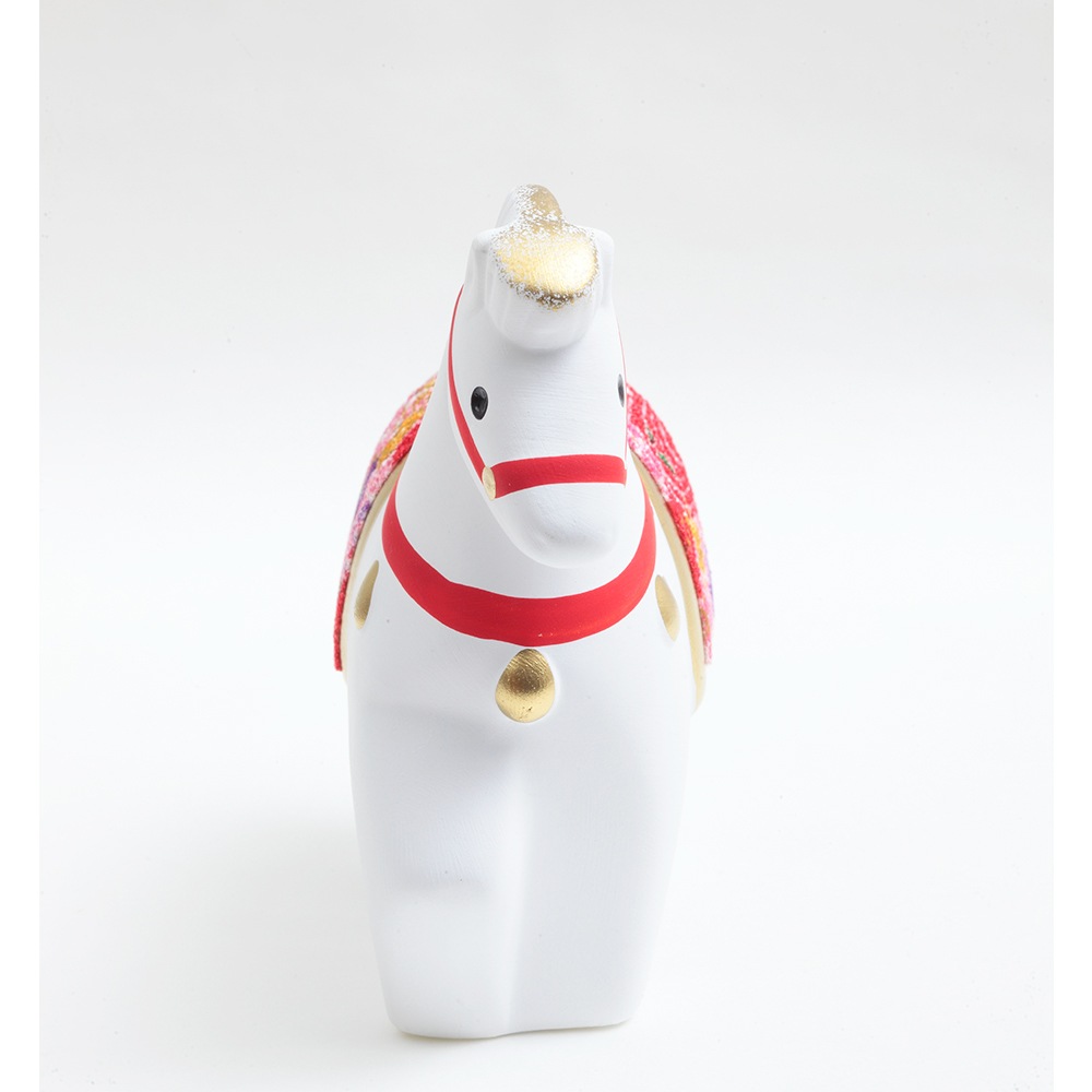 厳しい寒さに耐えた後にどの花よりも早く咲き、春の訪れを告げる喜びを意味する梅柄の屏風に白色の午が映える、縁起のよい午の干支飾りです。