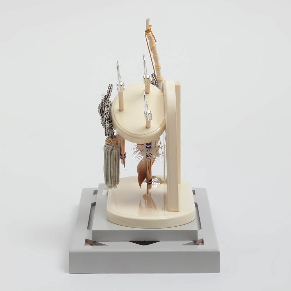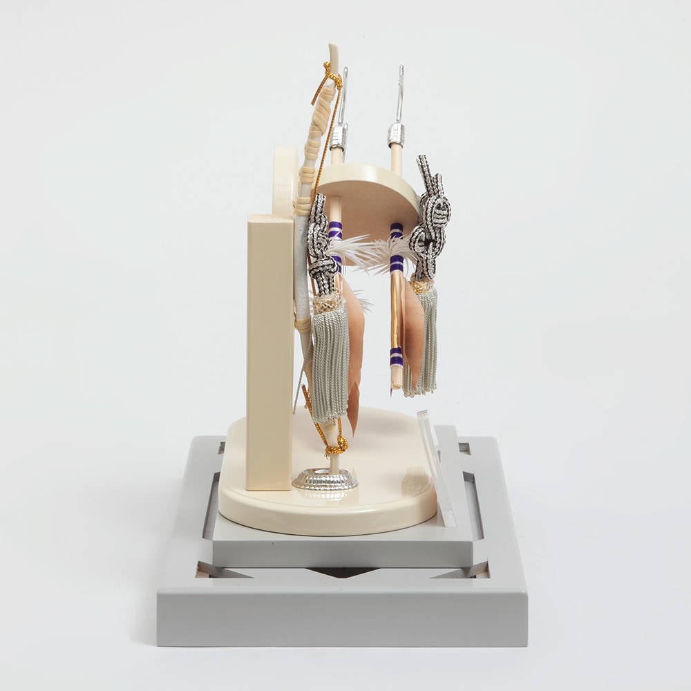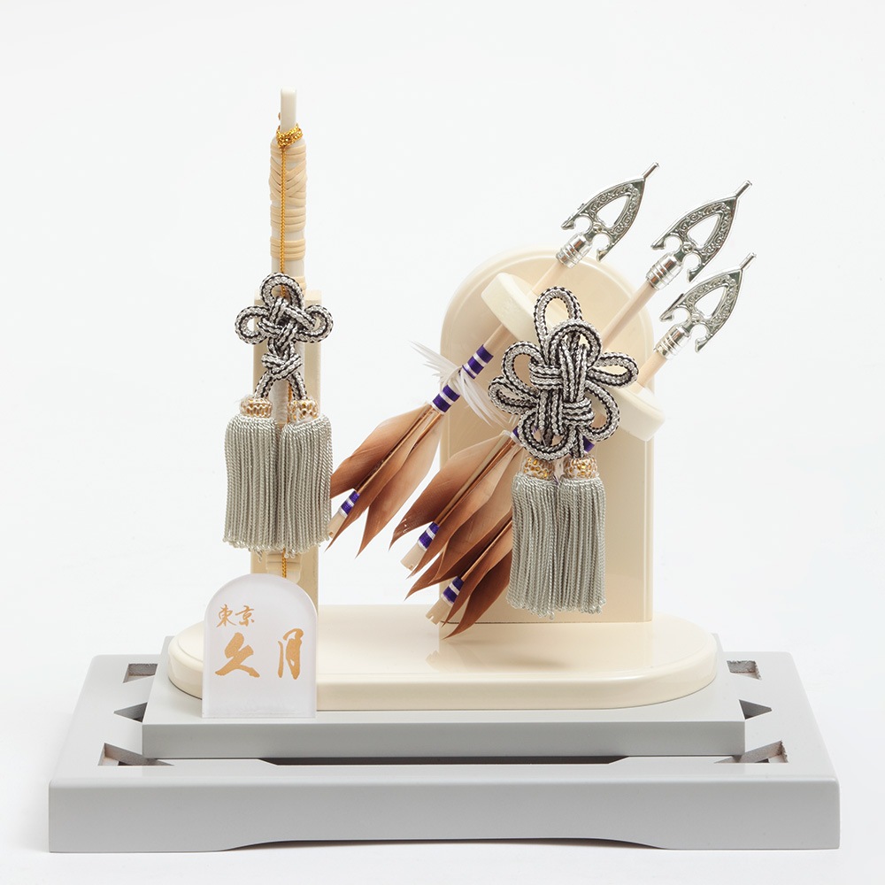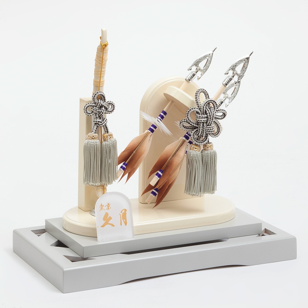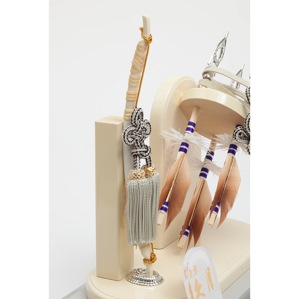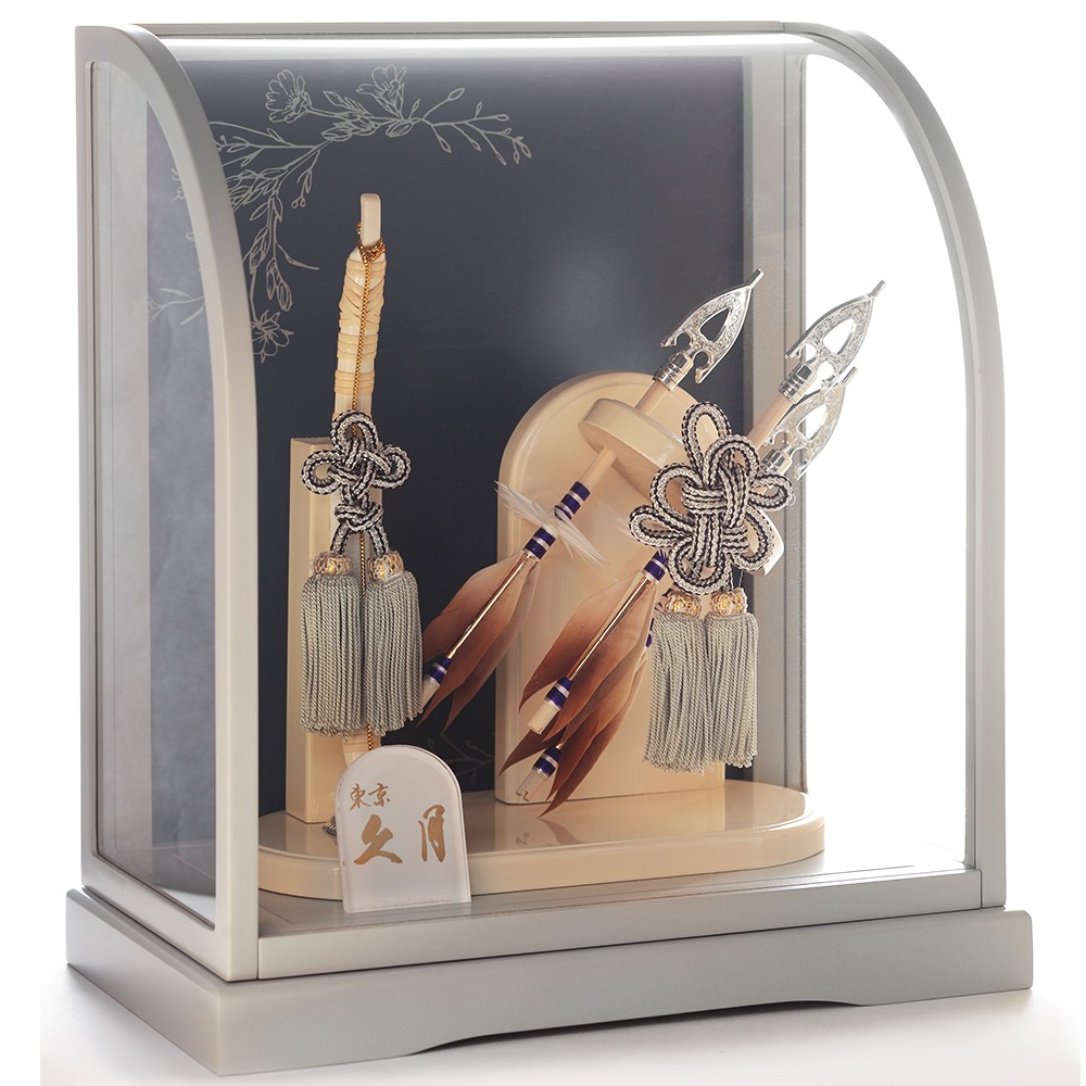 アイボリーとブルーのコントラストが斬新なケースに、中造りの斜めに配された躍動感あふれる矢が映える破魔弓飾りです。