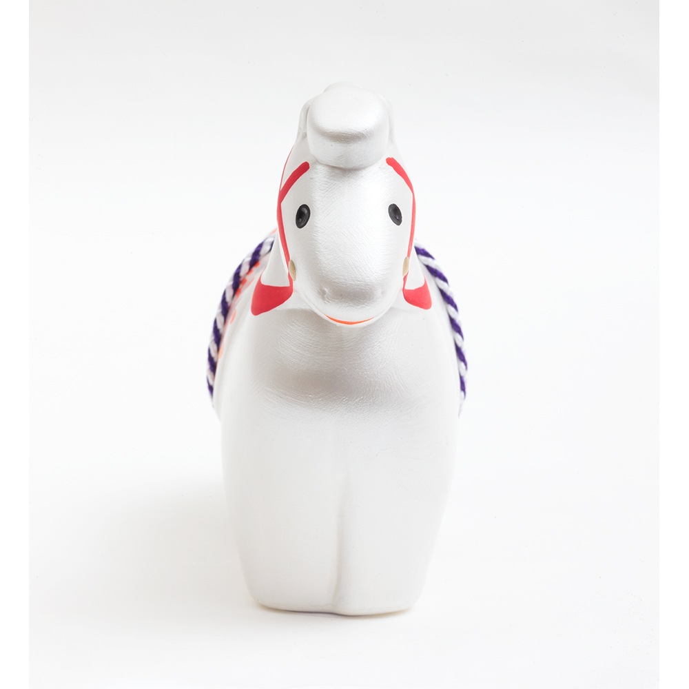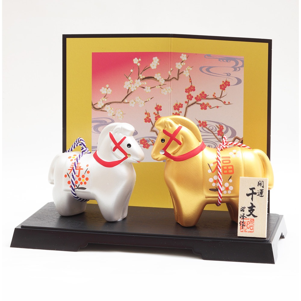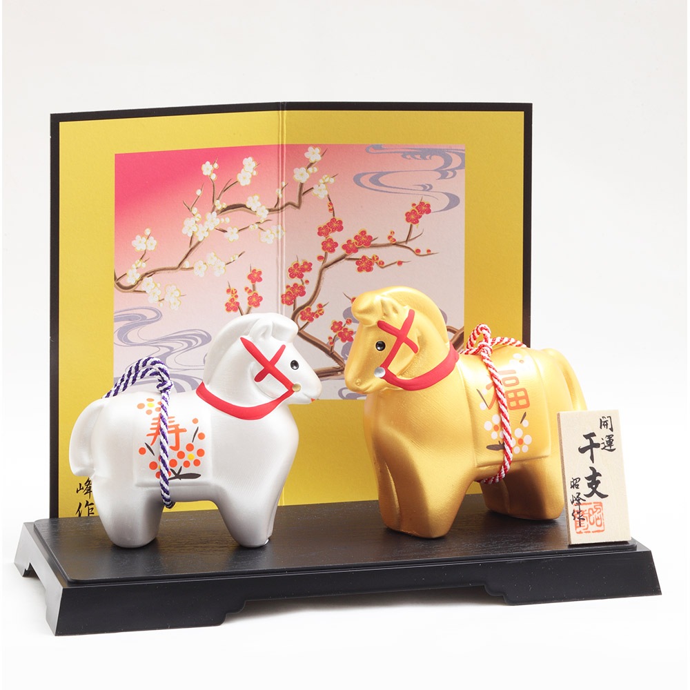 厳しい寒さに耐えた後にどの花よりも早く咲き、春の訪れを告げる喜びを意味する梅柄が二匹の午の体と屏風にあしらわれた縁起のよい午の干支飾りです。