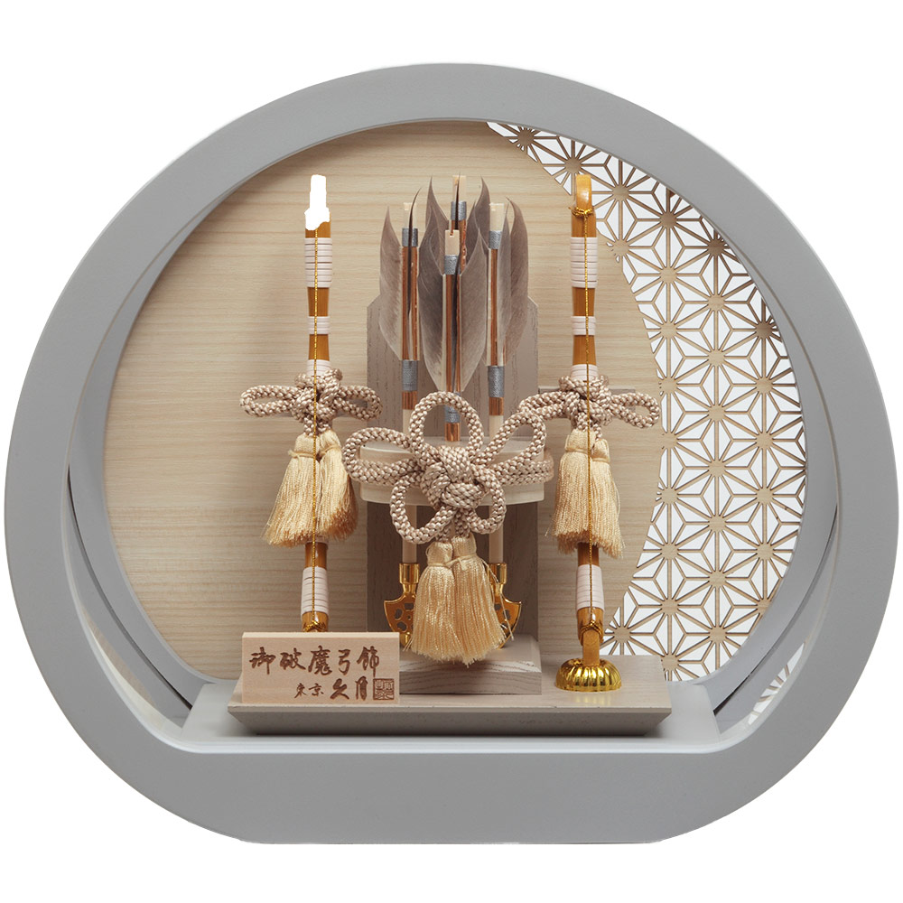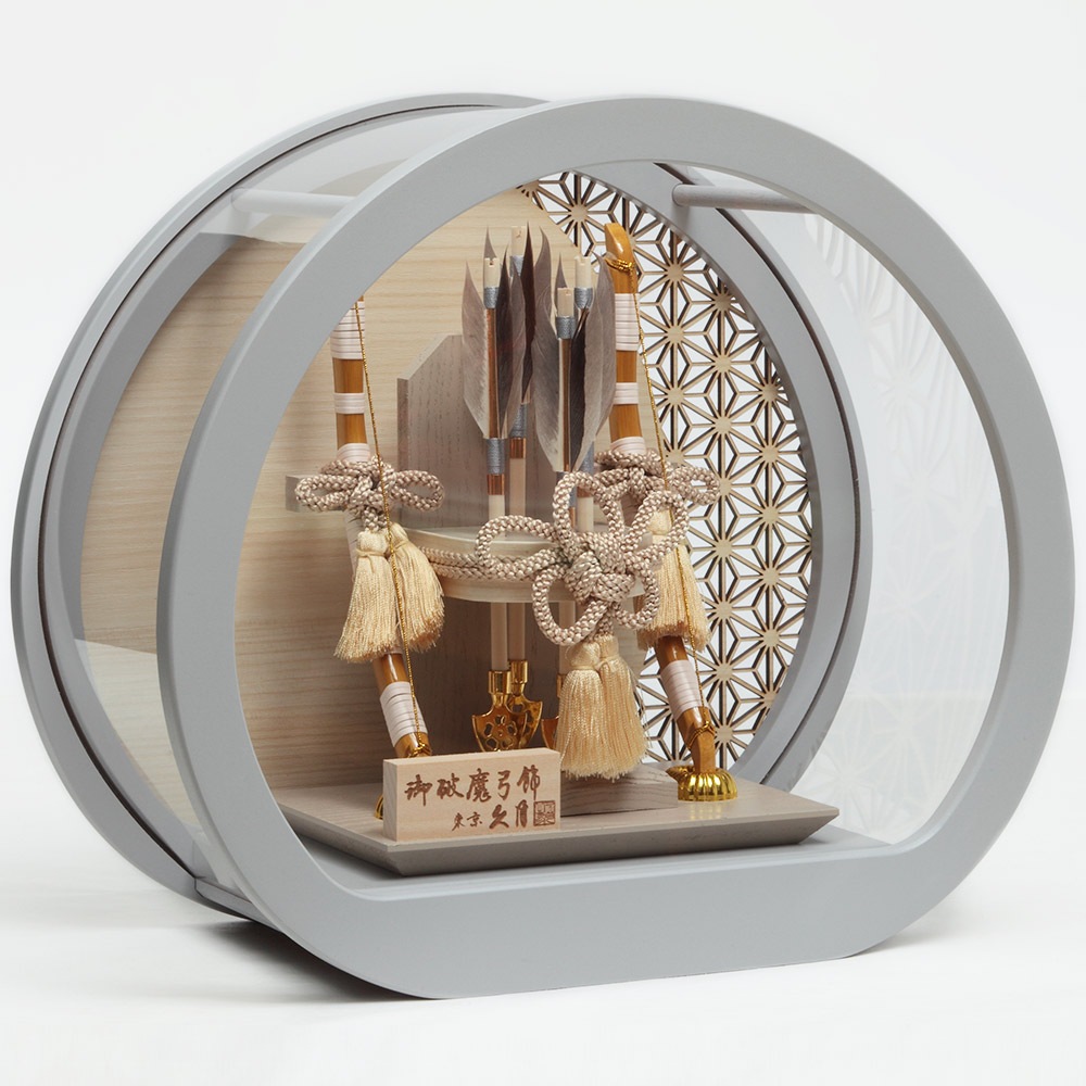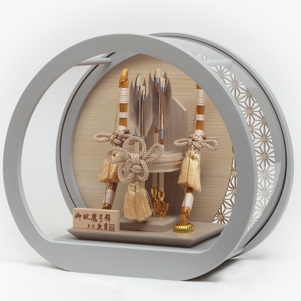 趣のある柔らかな雰囲気が魅力のブルーグレーの円形ケースがモダンで存在感のある破魔弓飾りです。