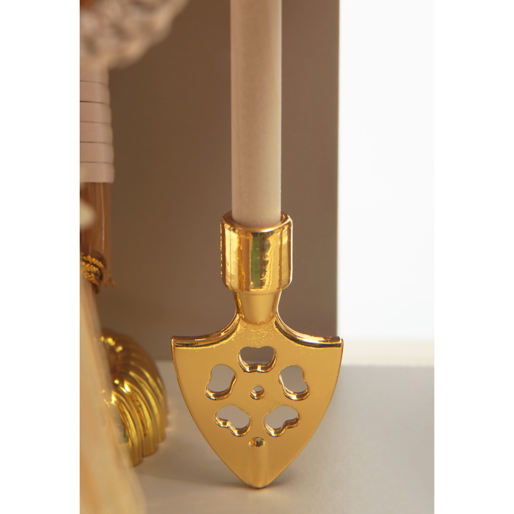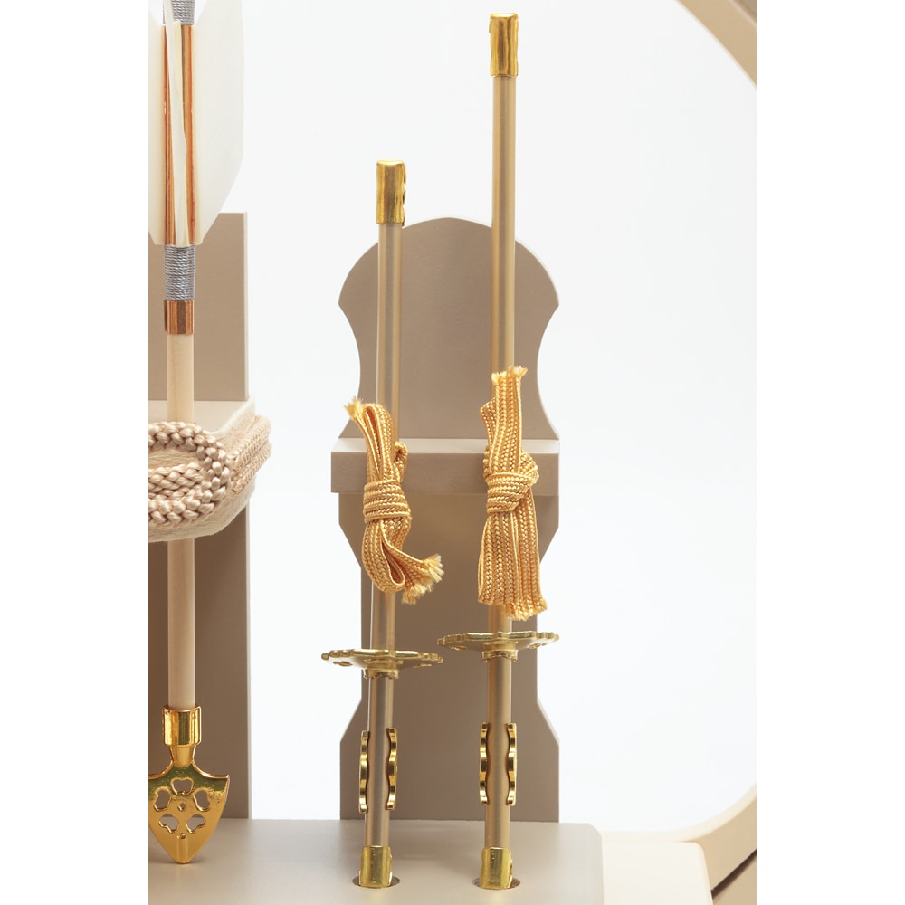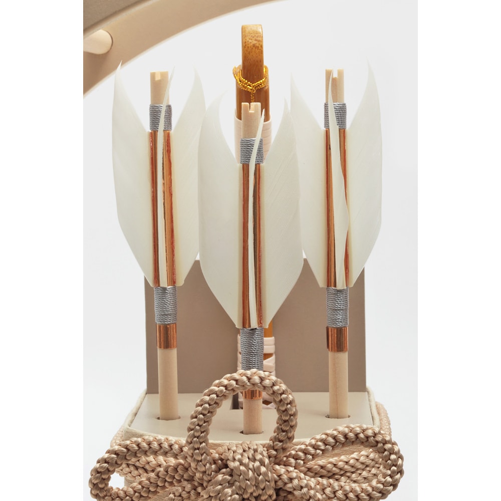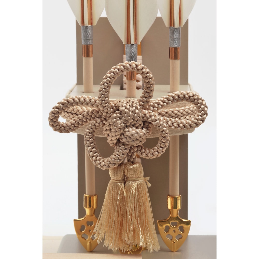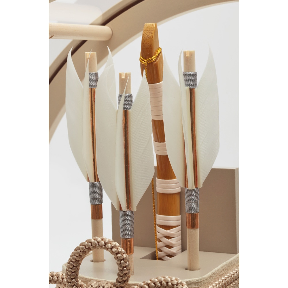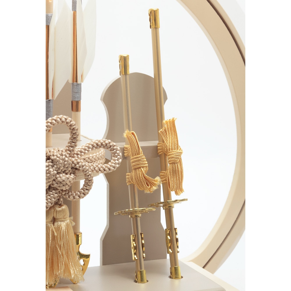 太刀や矢羽根など細部にいたるまで淡いテイストの色合いで全体を仕立てた、和室はもちろん洋間にも違和感なくマッチする、お祝いに相応しい逸品です。