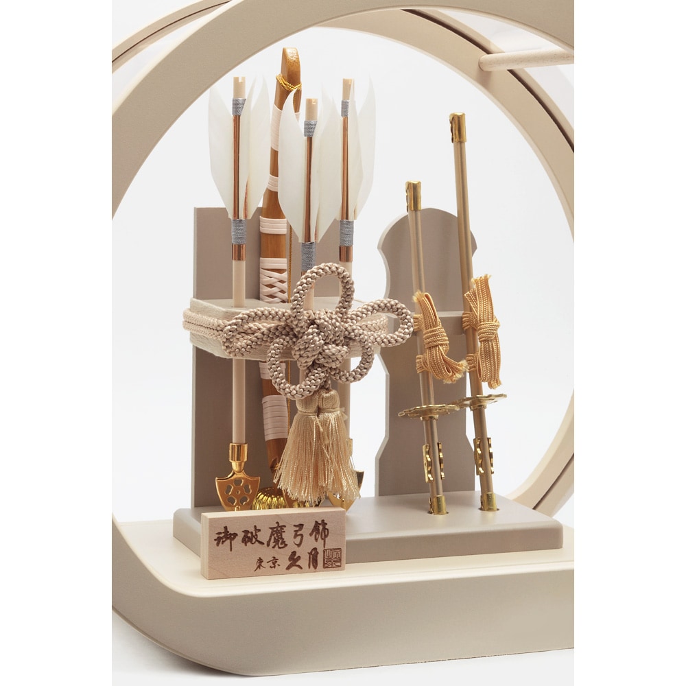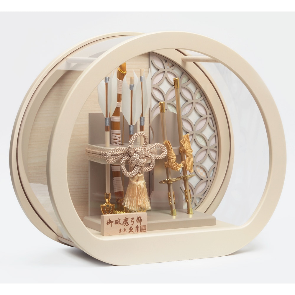 アイボリーを基調とした柔らかい雰囲気が魅力の、モダンな円形ケースの破魔弓飾りです。