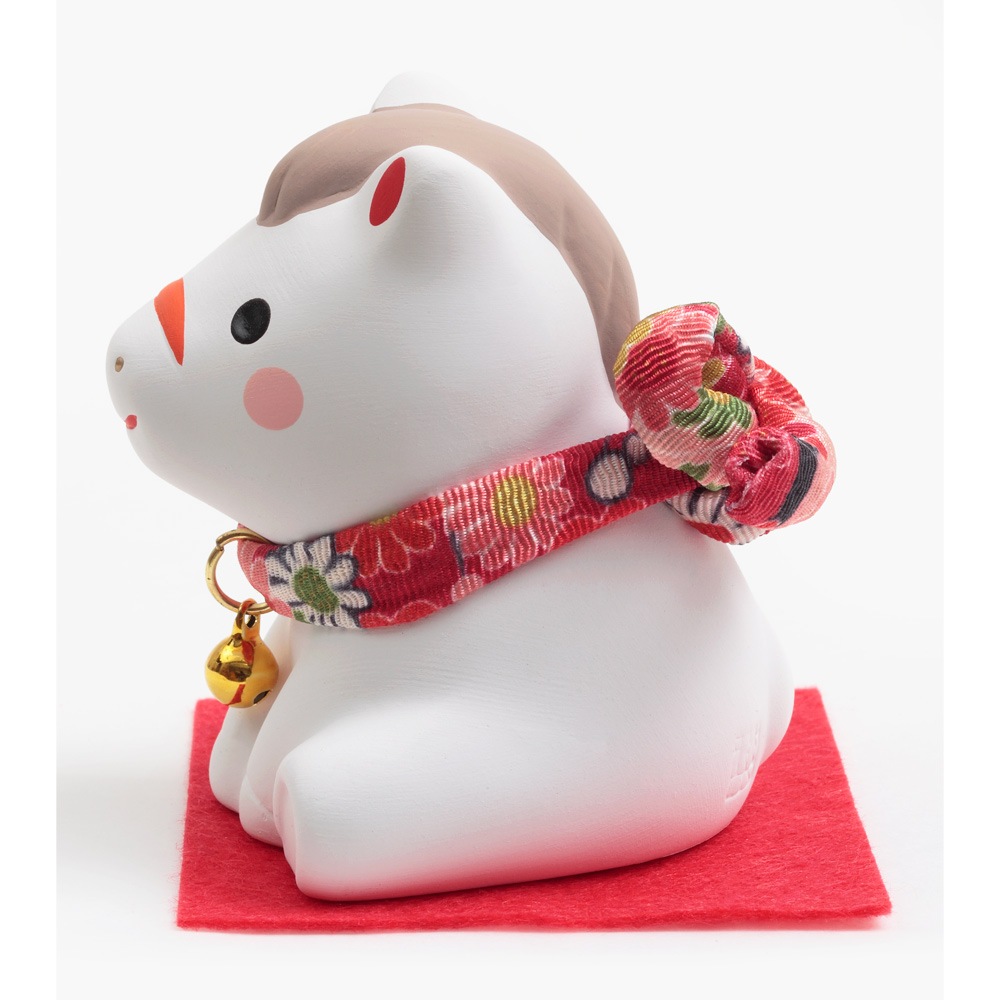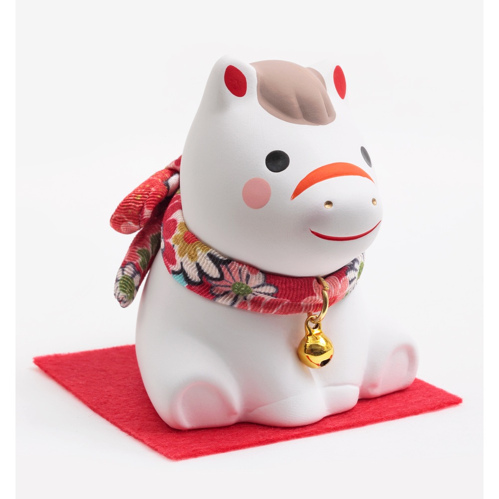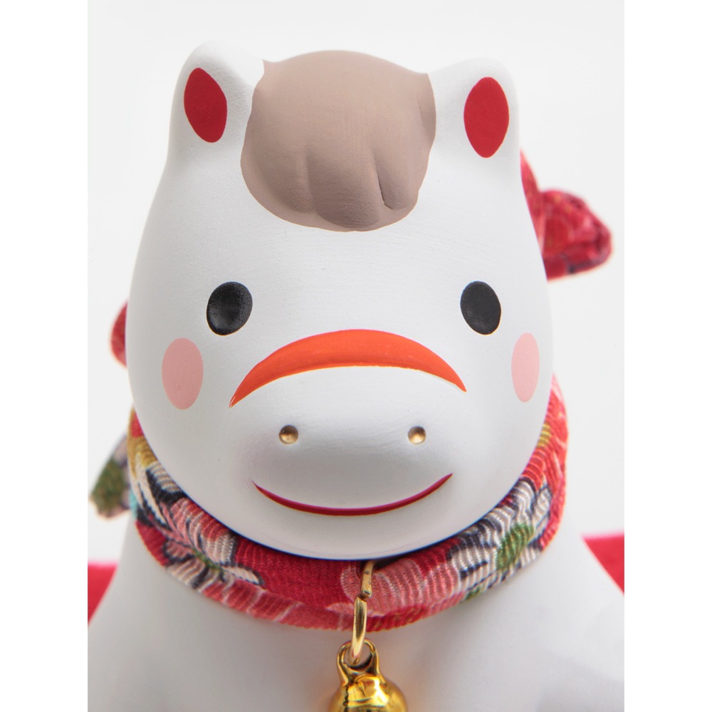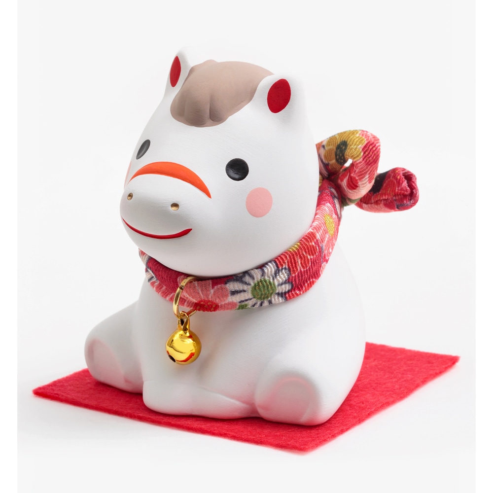 赤い毛氈の上にちょこんと座る姿がかわいらしい、陶器の午の干支飾りです。