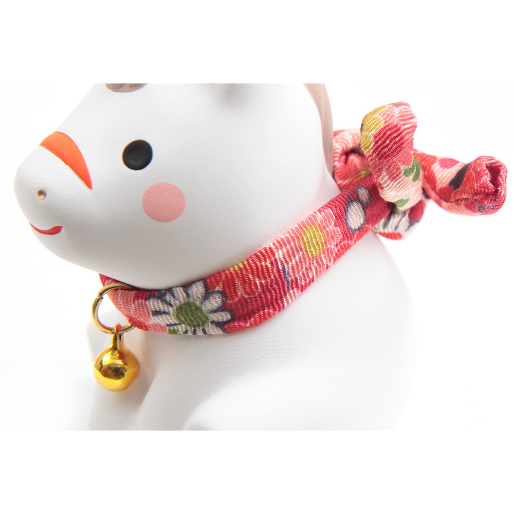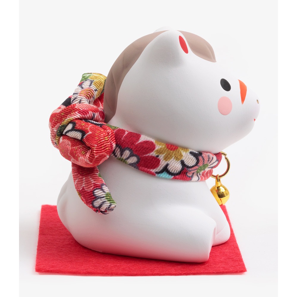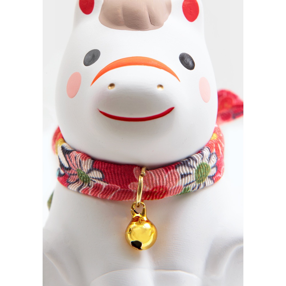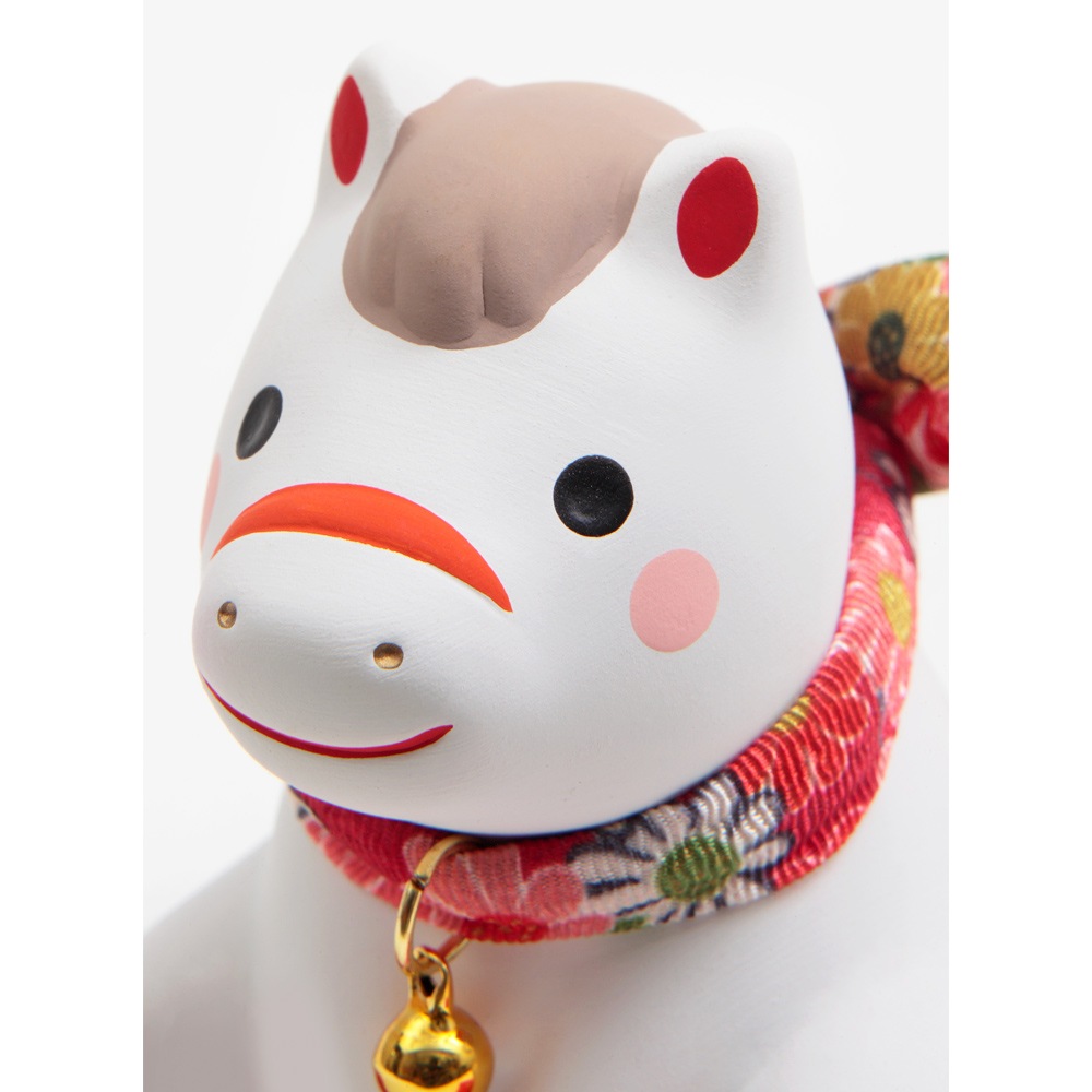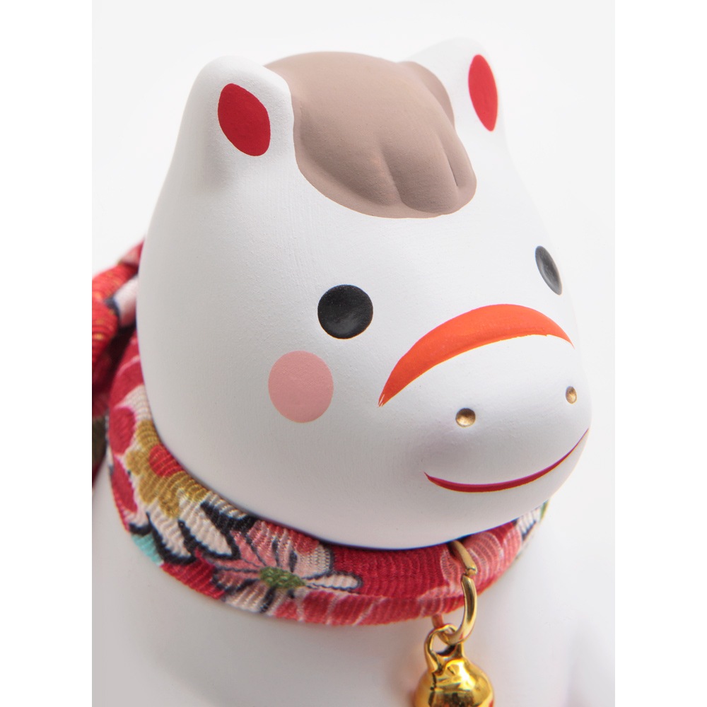 赤い毛氈の上にちょこんと座る姿がかわいらしい、陶器の午の干支飾りです。