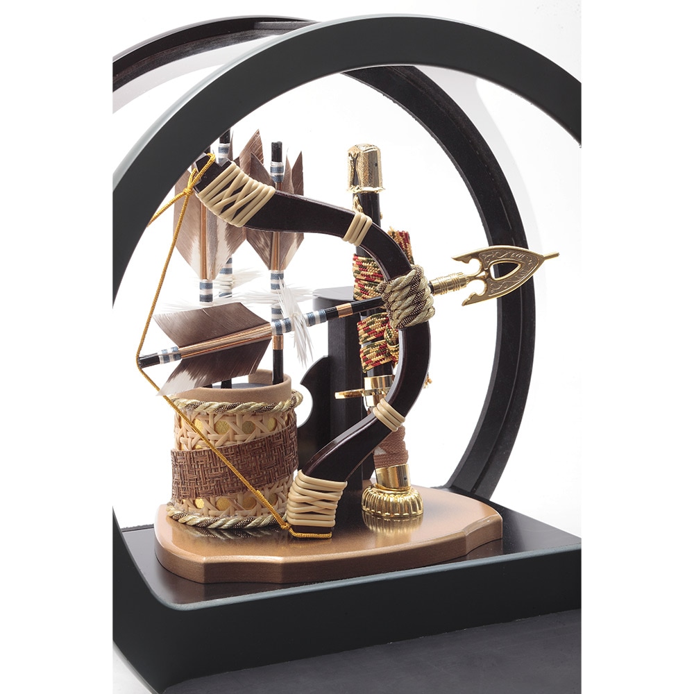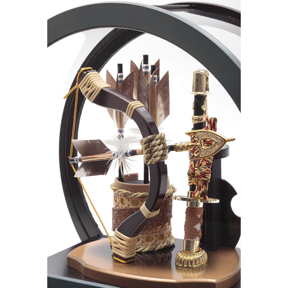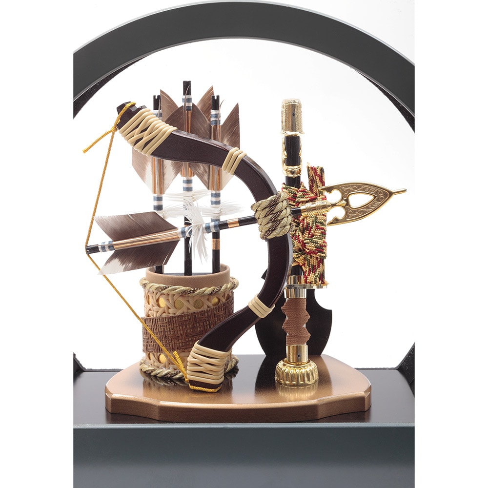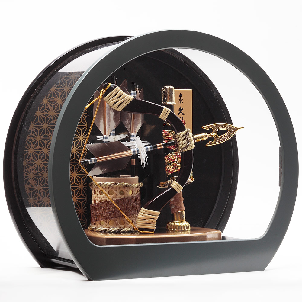 落ち着きのあるシックなカーキ色の円形ケースがモダンで存在感のある破魔弓飾りです。