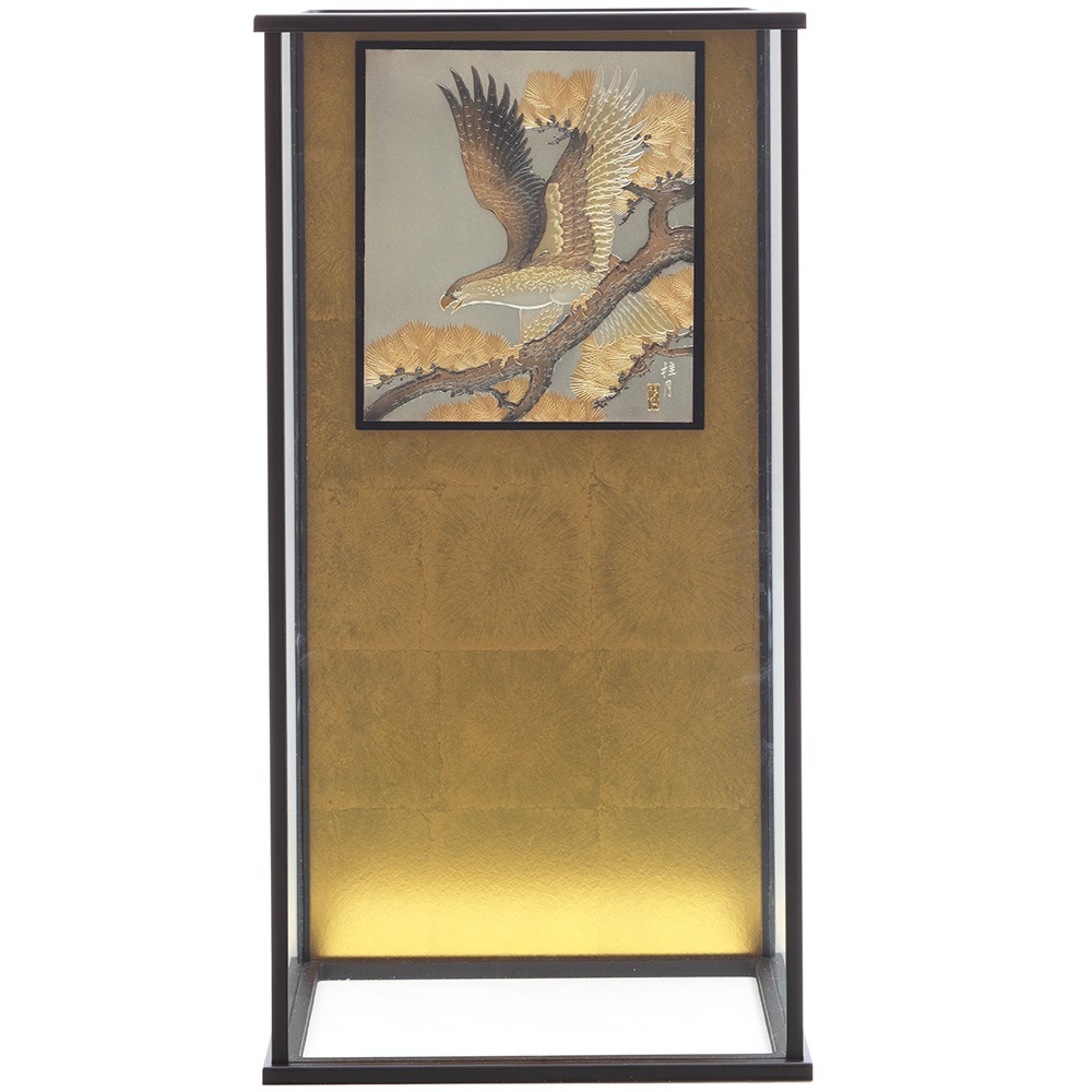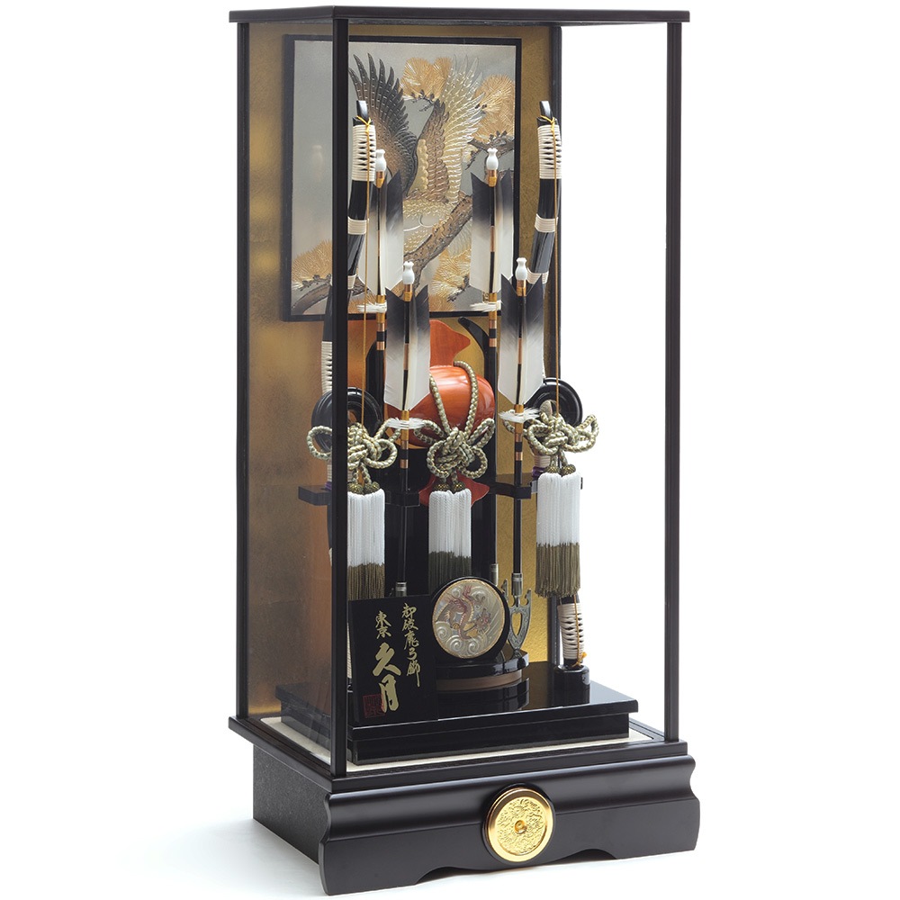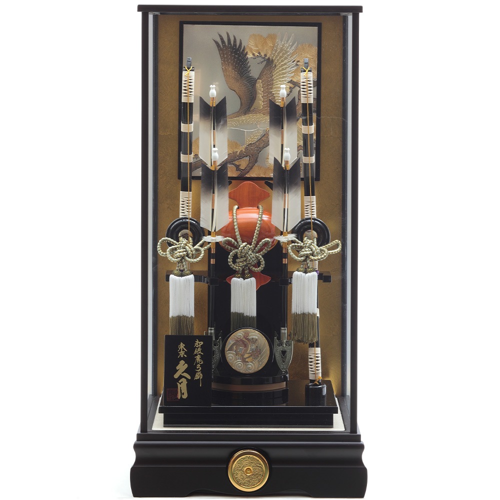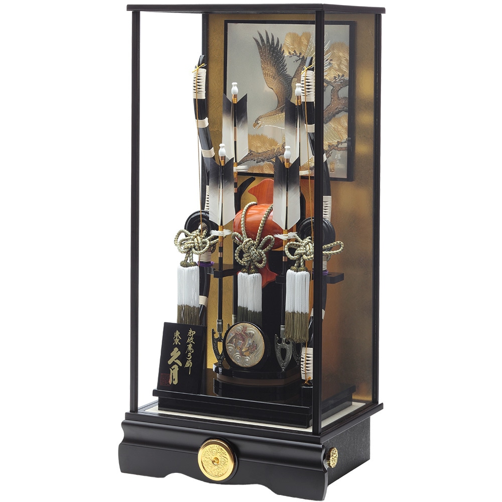 勇壮な鷹と趣のある松を描いたケース背景に落ち着きある中造りが見事に映える迫力ある破魔弓飾りです。