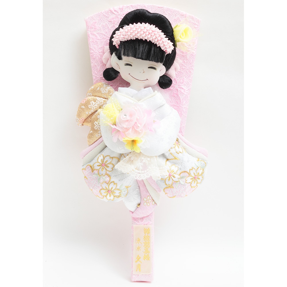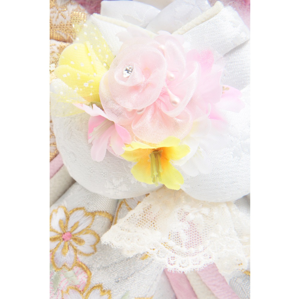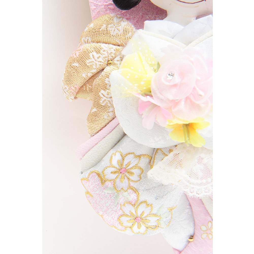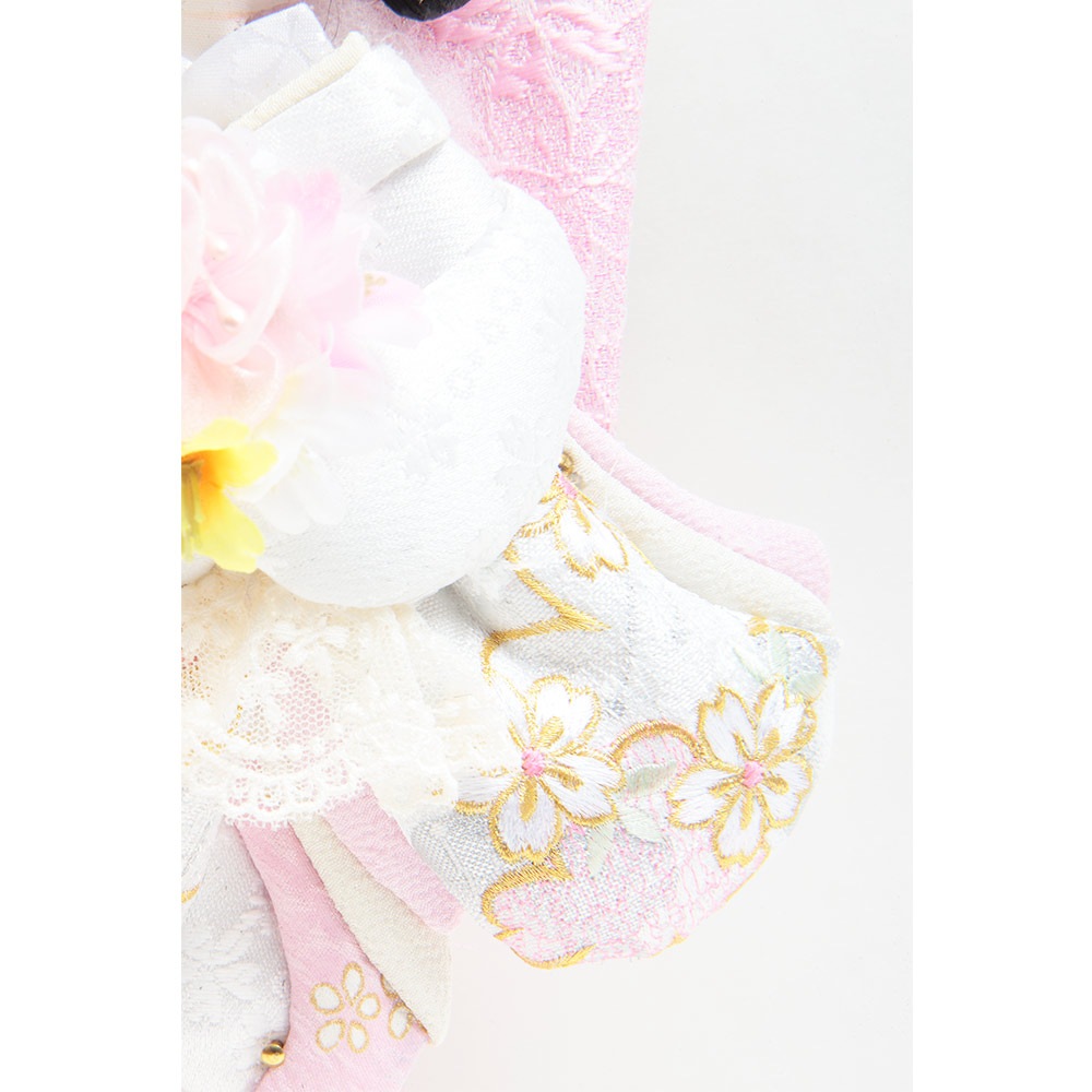 桜の刺繍があしらわれた目を引く衣裳や羽子板が、全体的に白とピンクを基調としたパステルカラーで統一され、優し気で上品な印象を感じさせます。