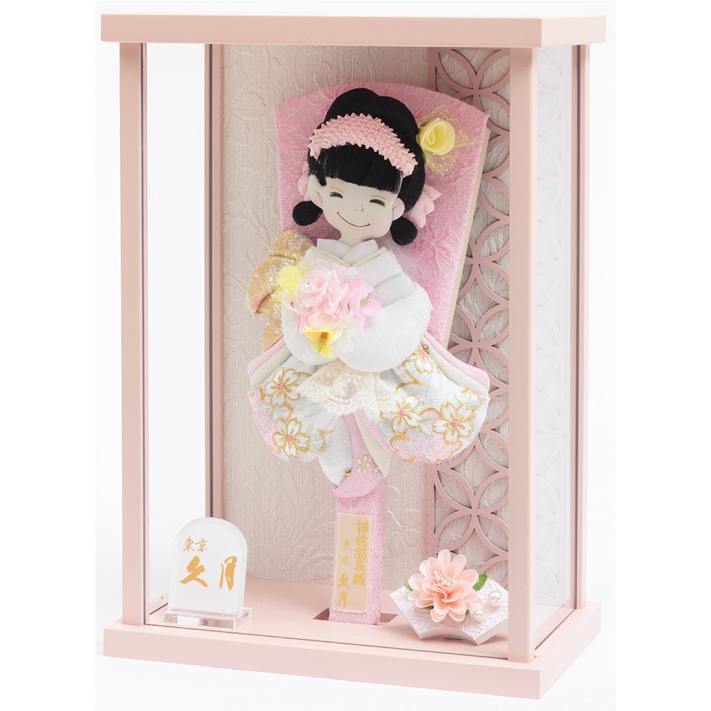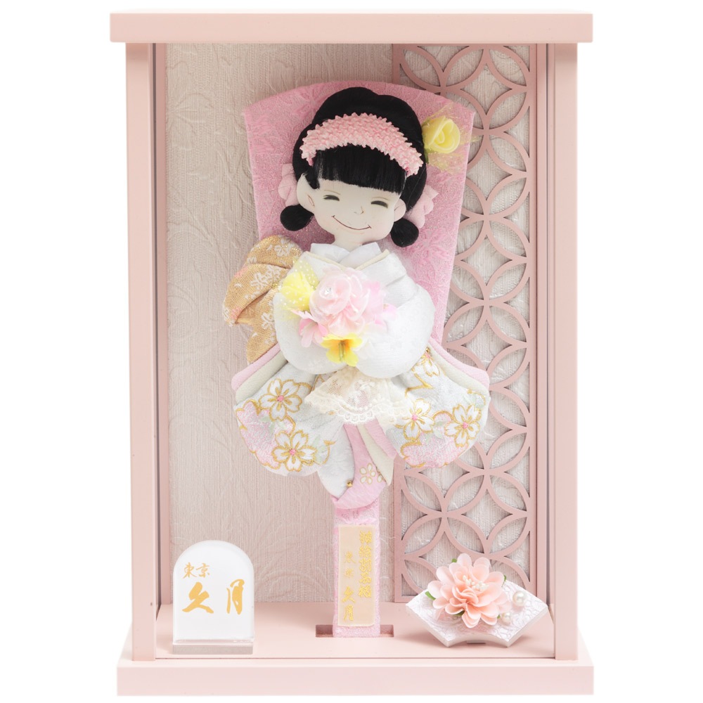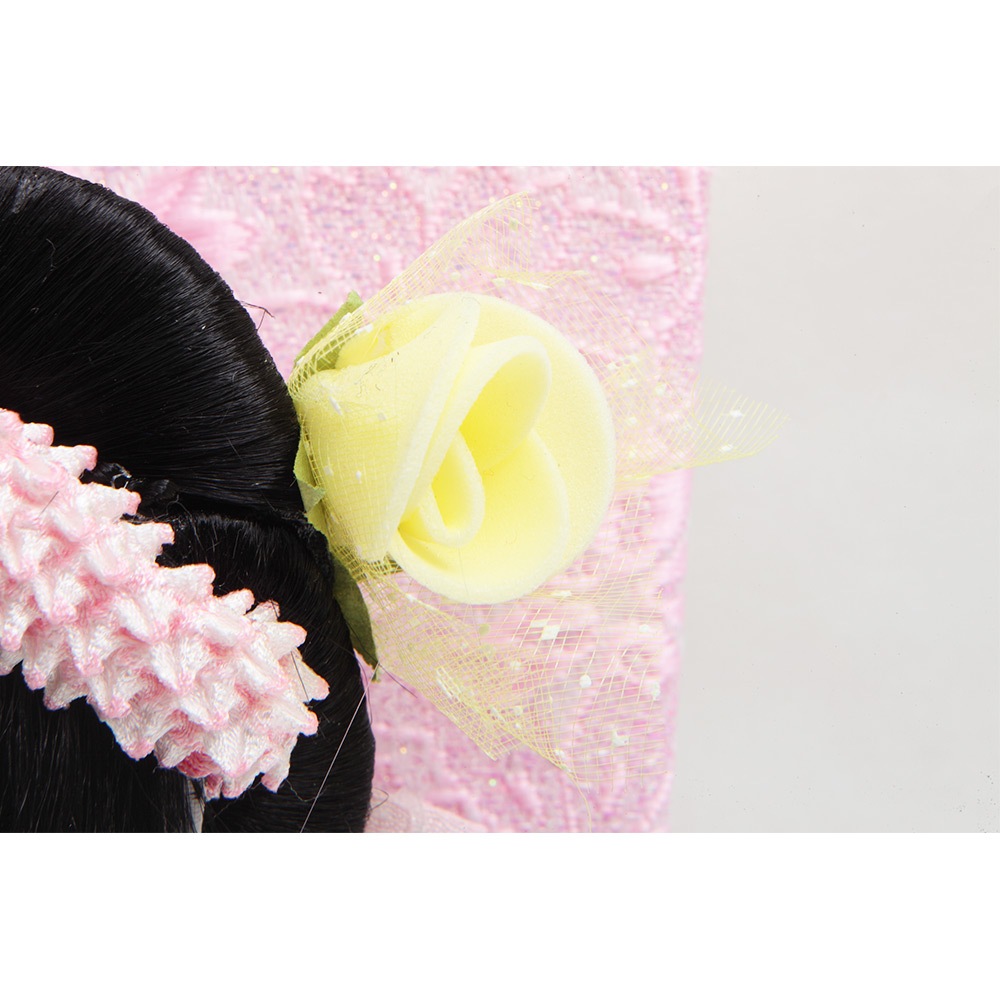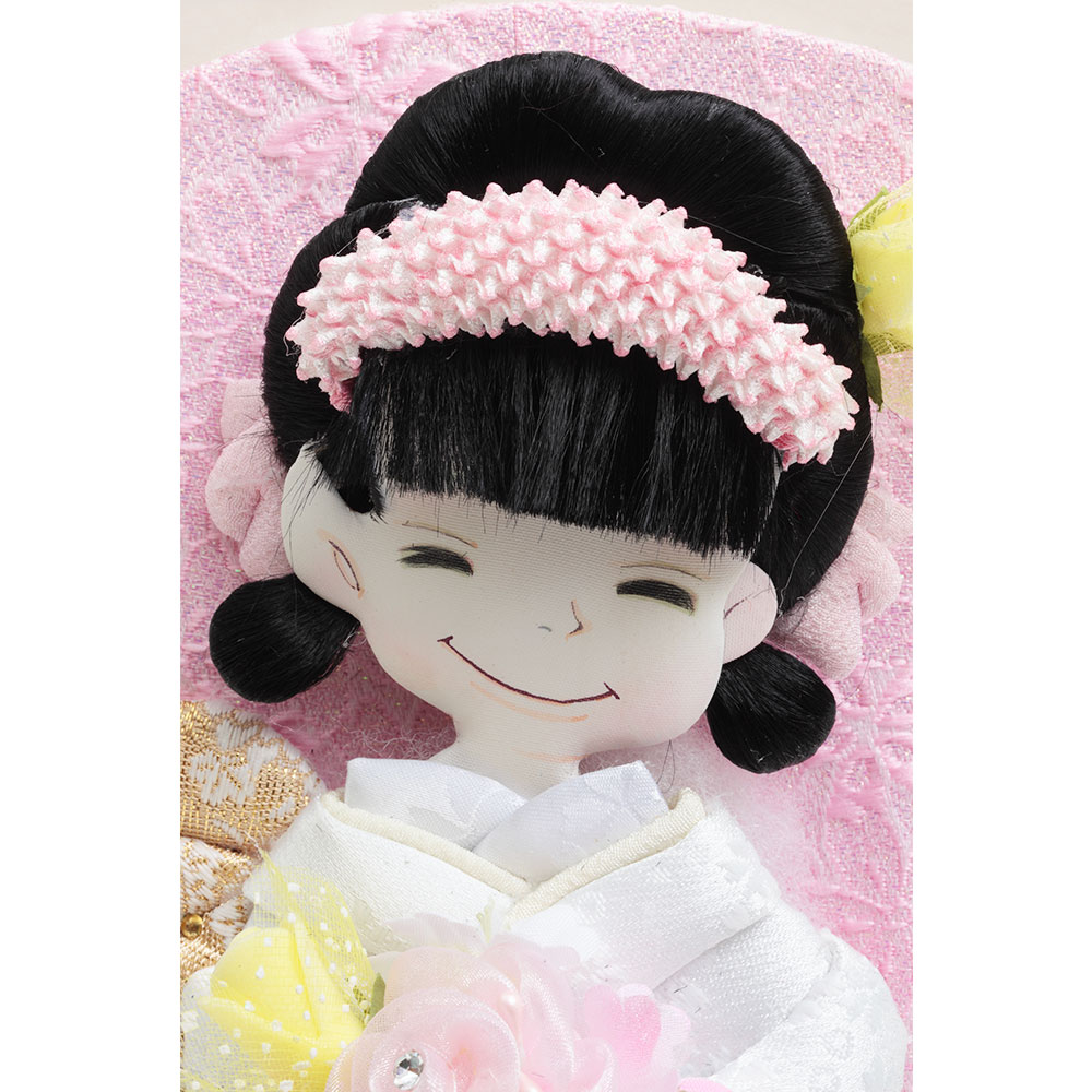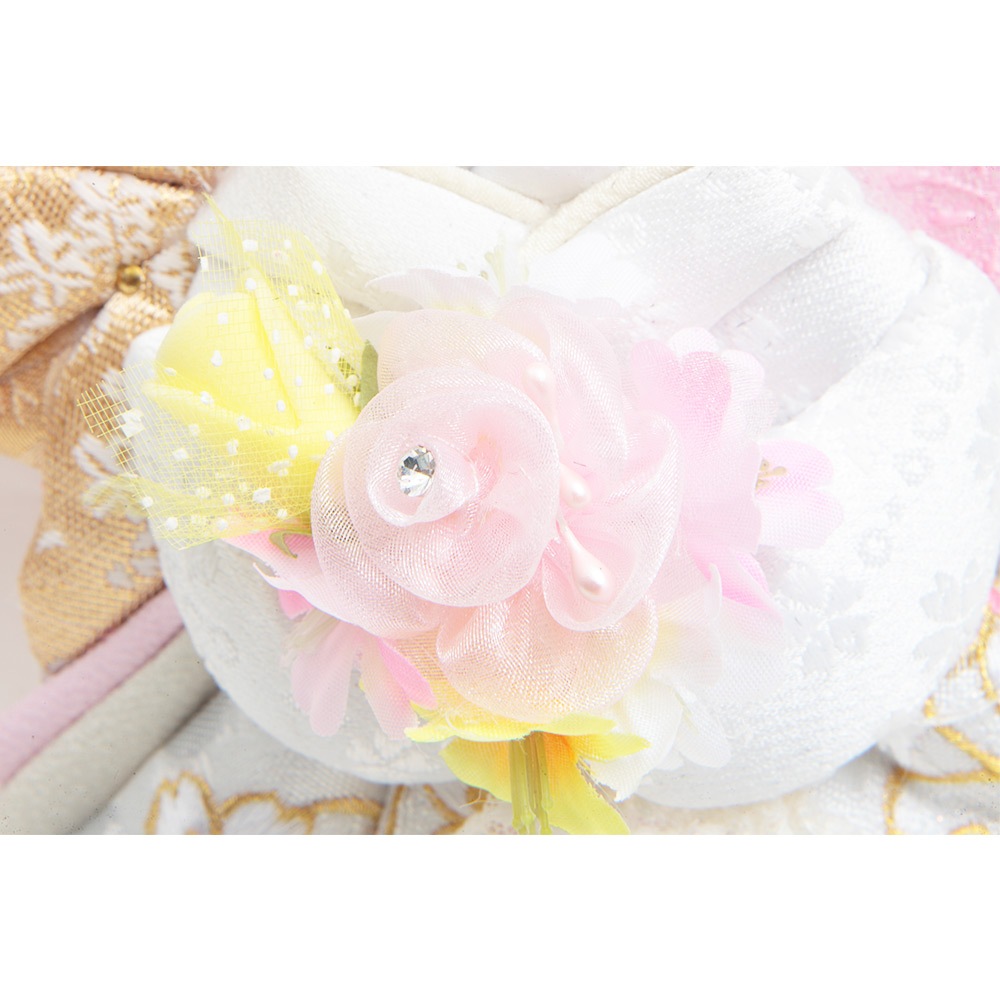 桜の刺繍があしらわれた目を引く衣裳や羽子板が、全体的に白とピンクを基調としたパステルカラーで統一され、優し気で上品な印象を感じさせます。