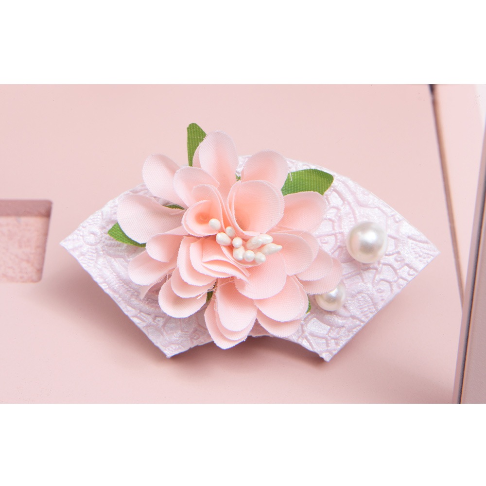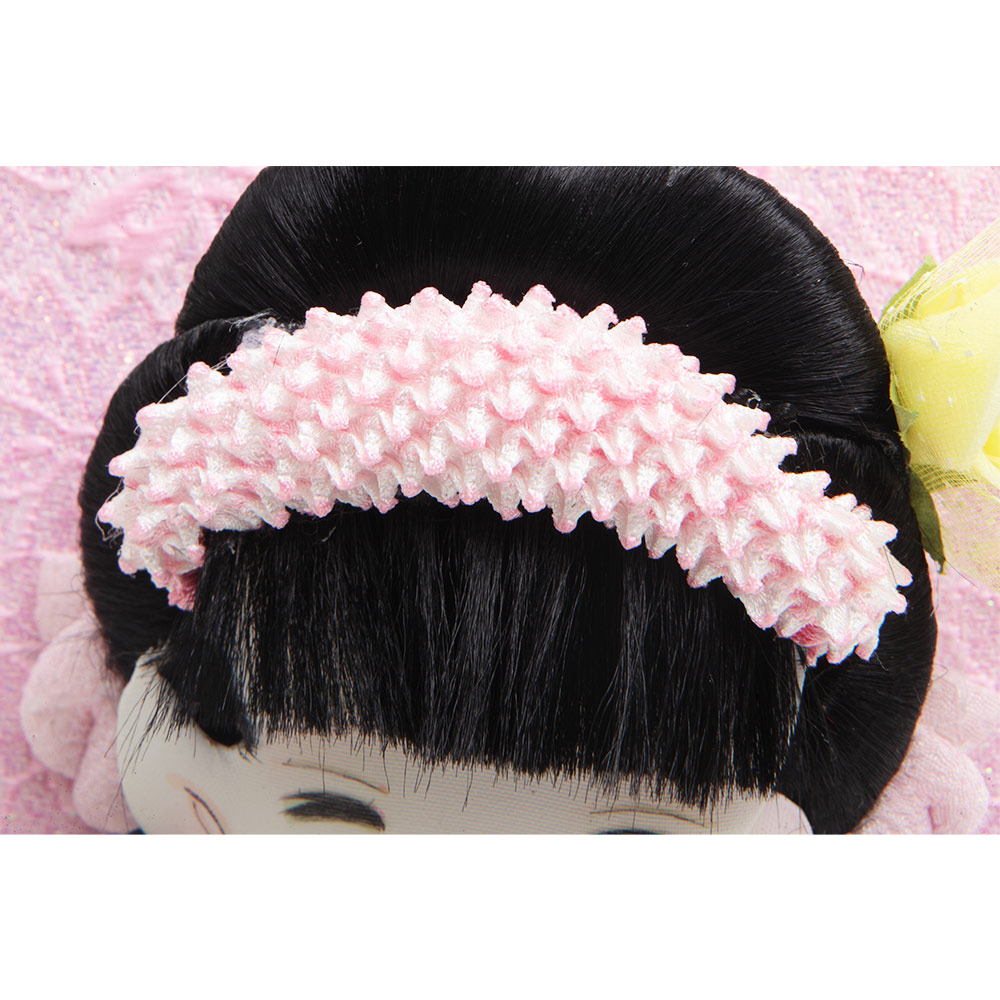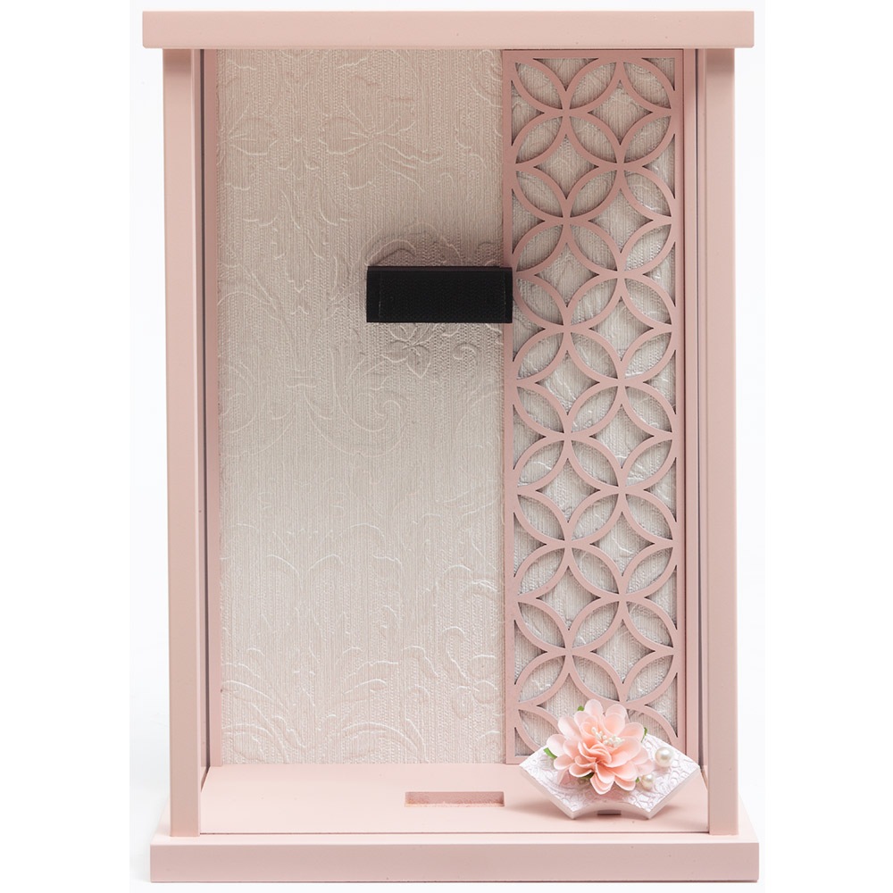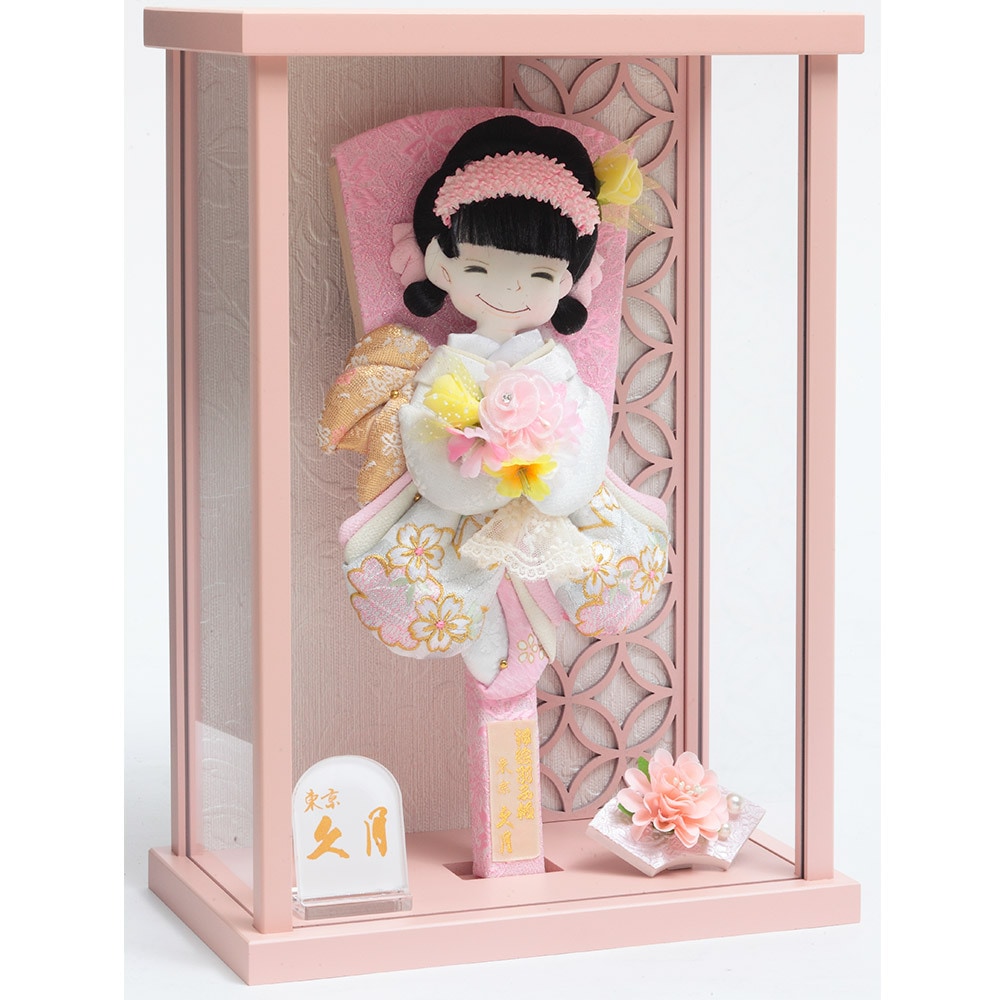 桜の刺繍があしらわれた目を引く衣裳や羽子板が、全体的に白とピンクを基調としたパステルカラーで統一され、優し気で上品な印象を感じさせます。