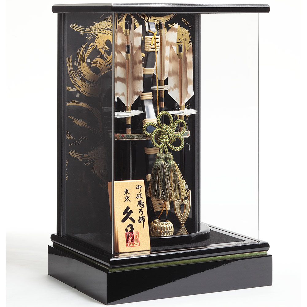 黒艶塗のケースがシンプルながらも高級感のあるデザインの破魔弓飾りです。