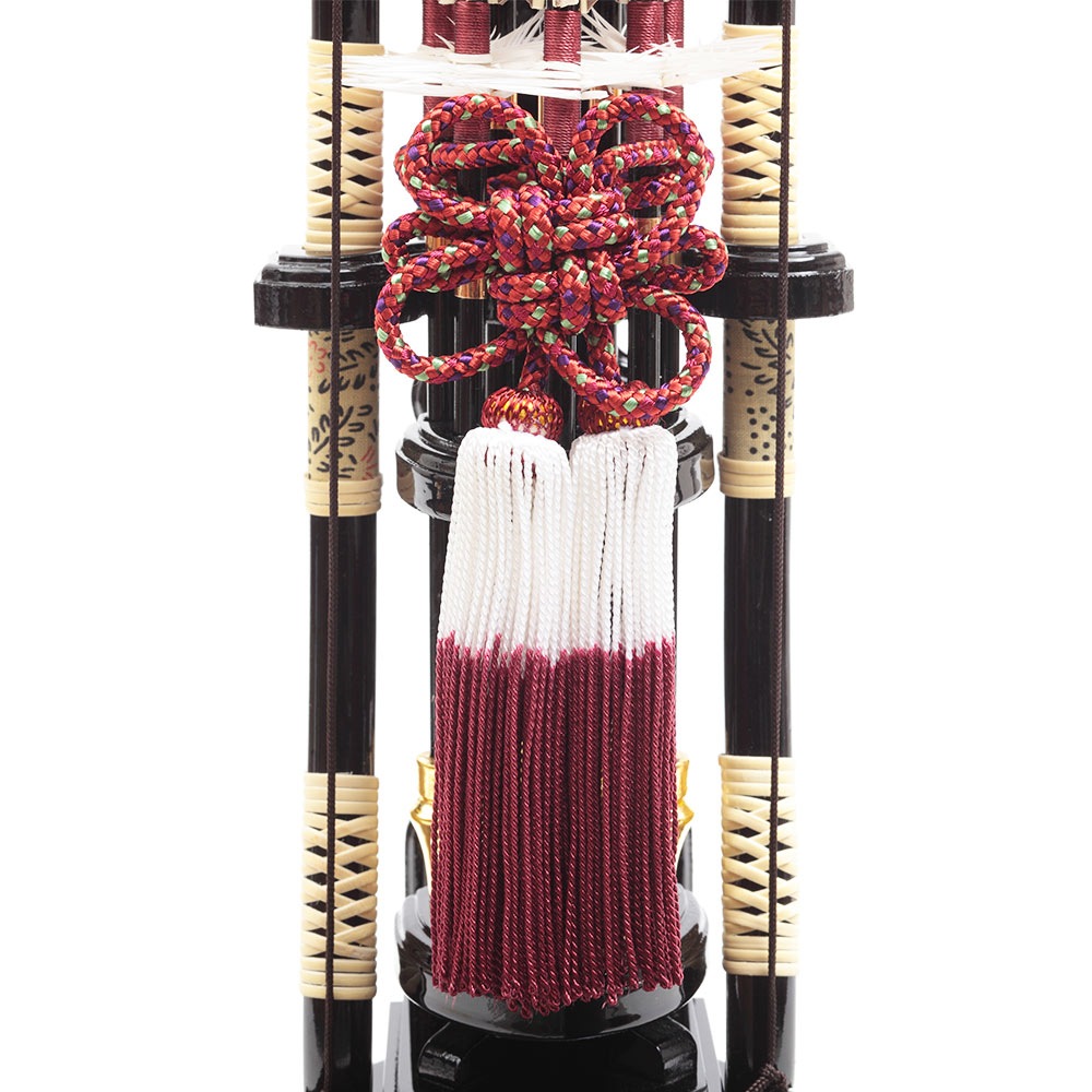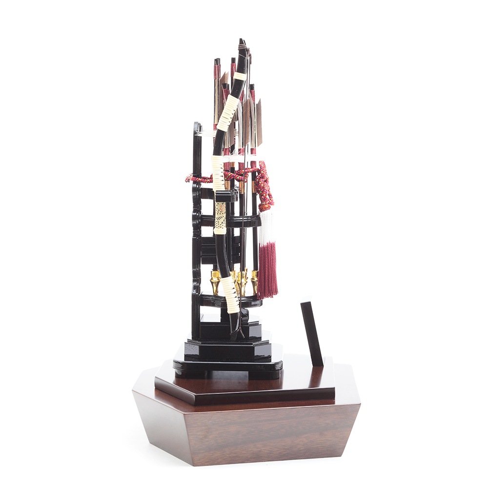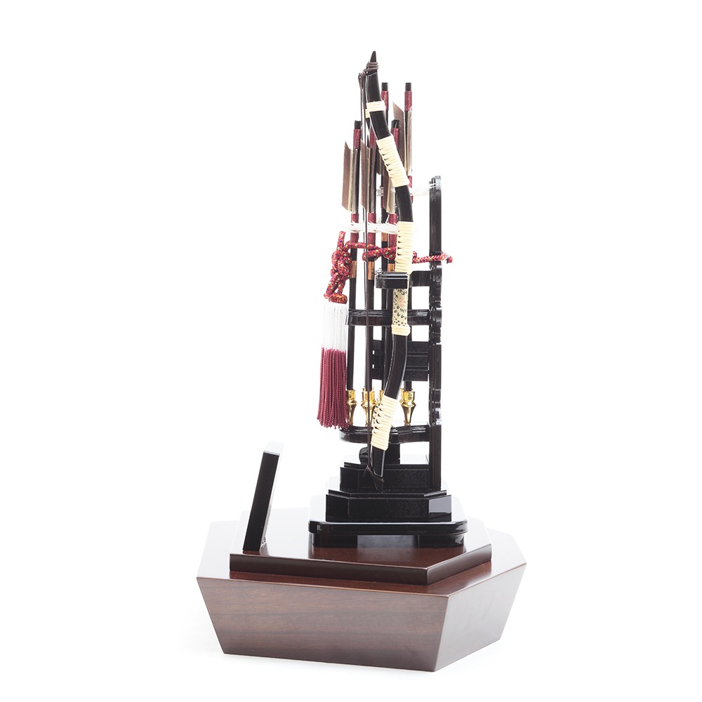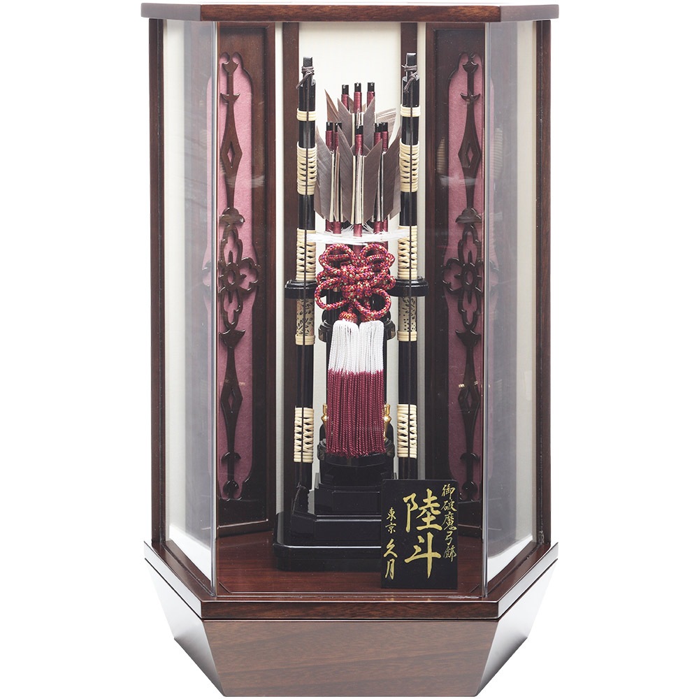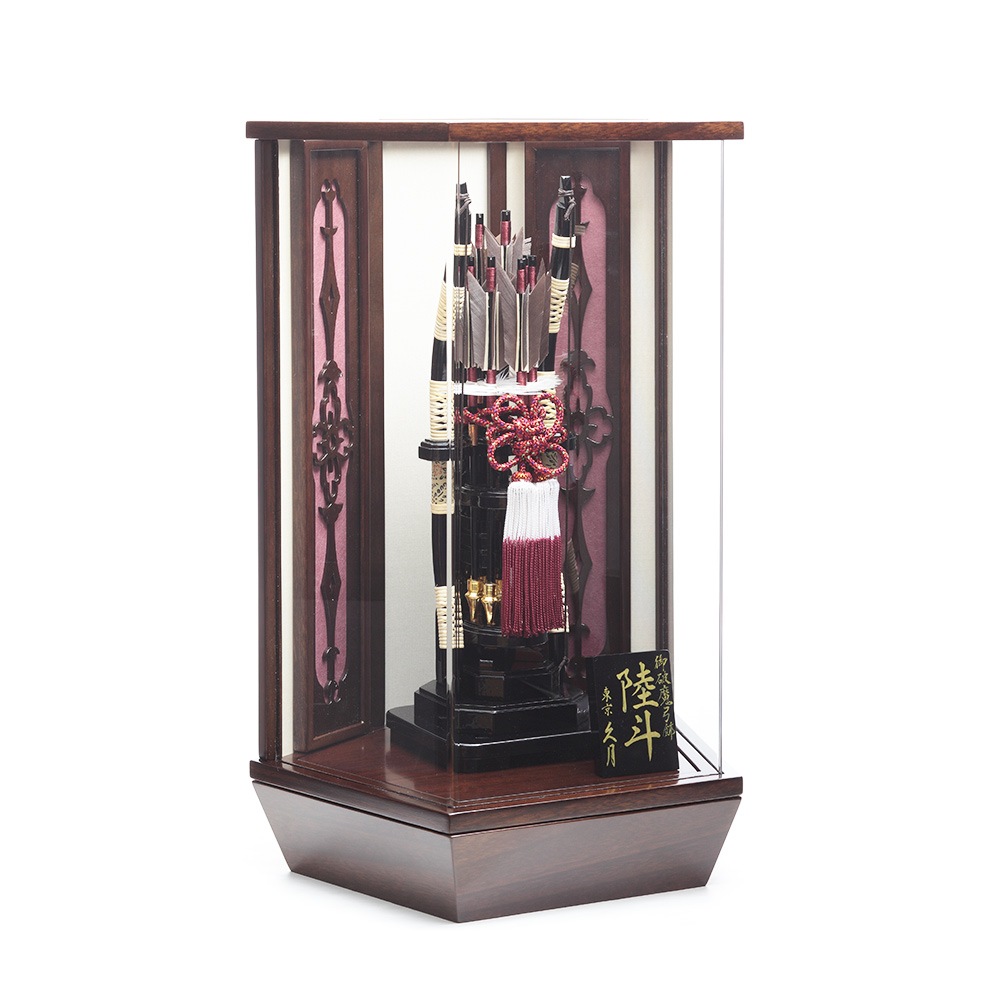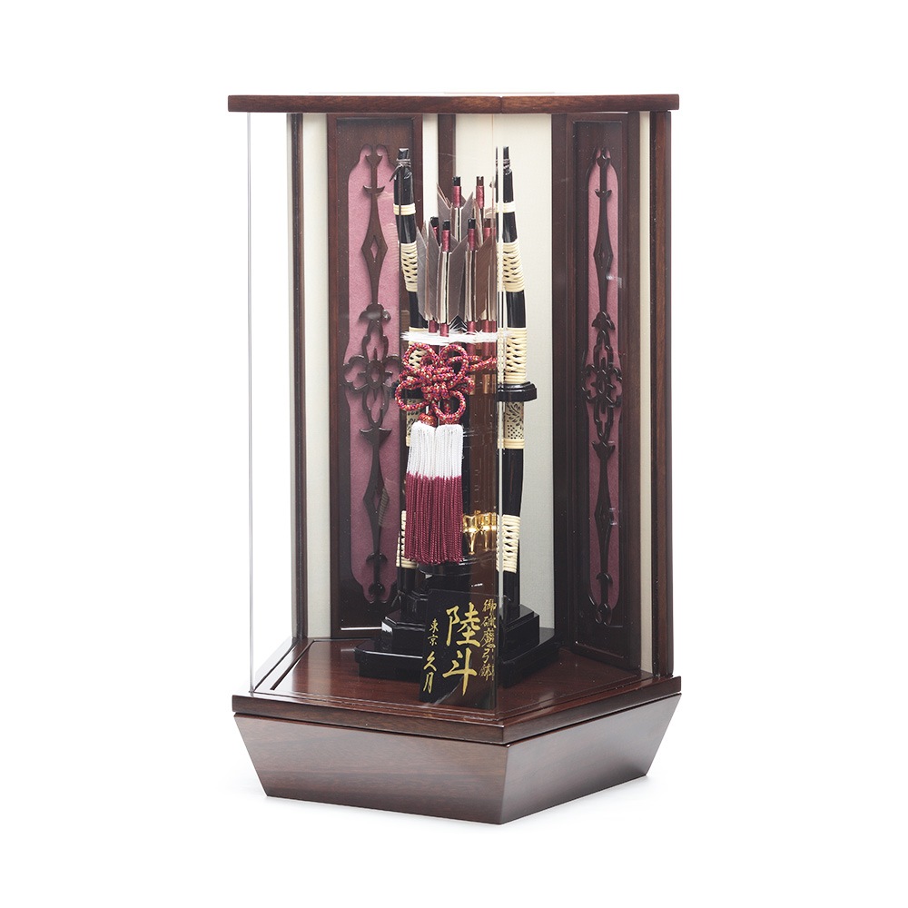 洋館を思わせるシックな色合いの木目調のケースとカシス色のケース背景にスタイリッシュな中造りが映える破魔弓飾りです。