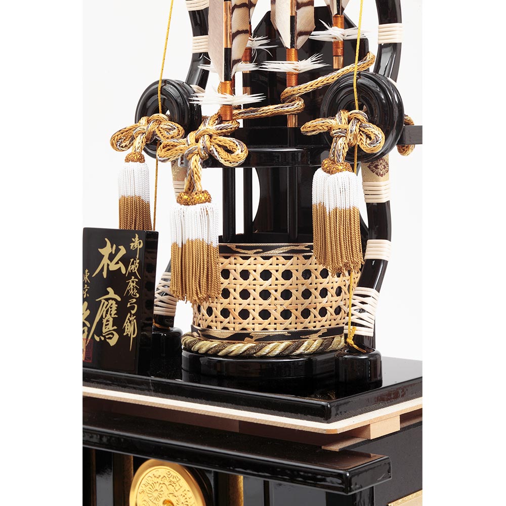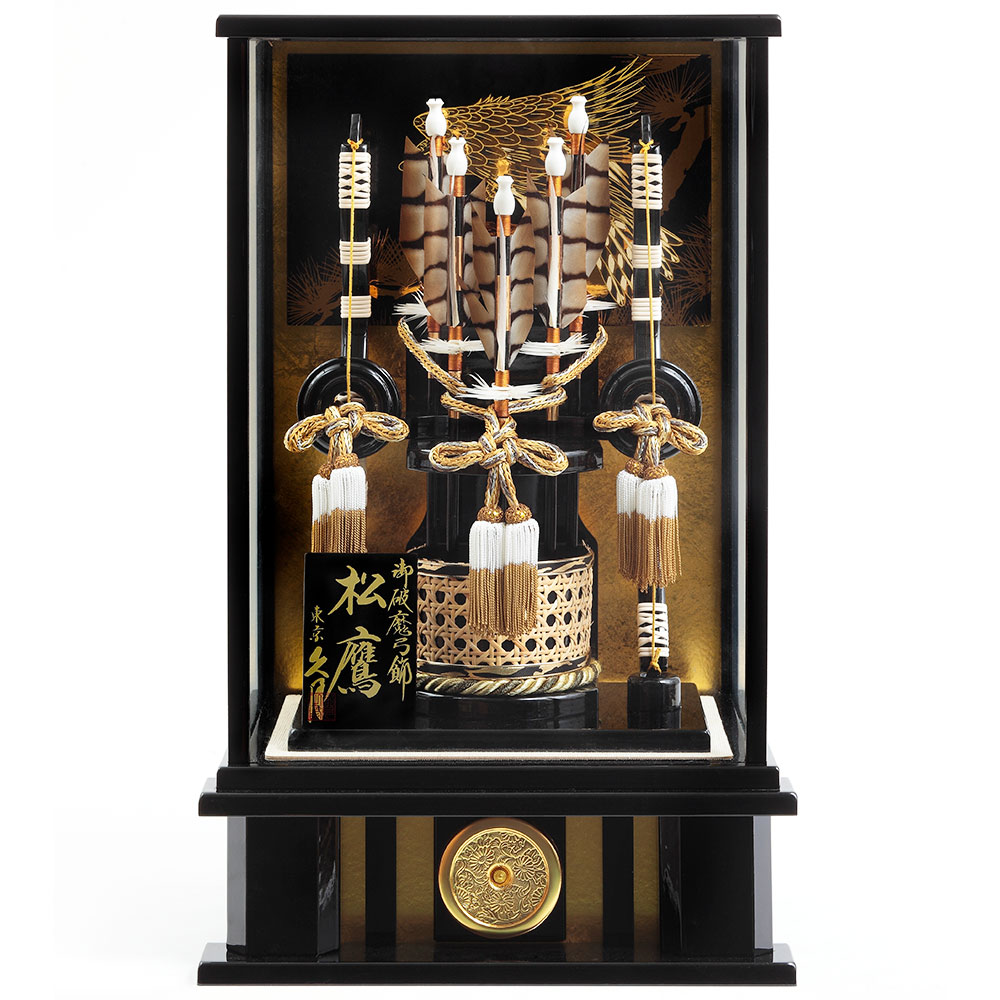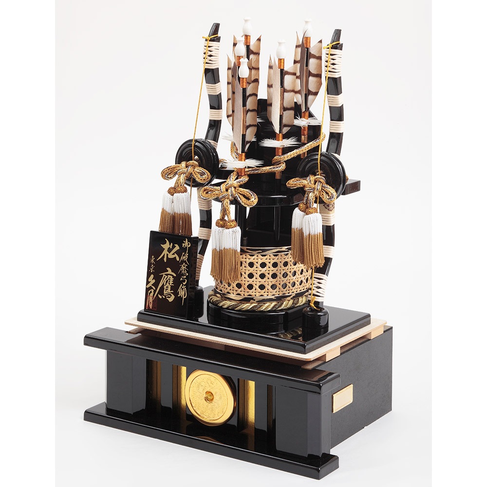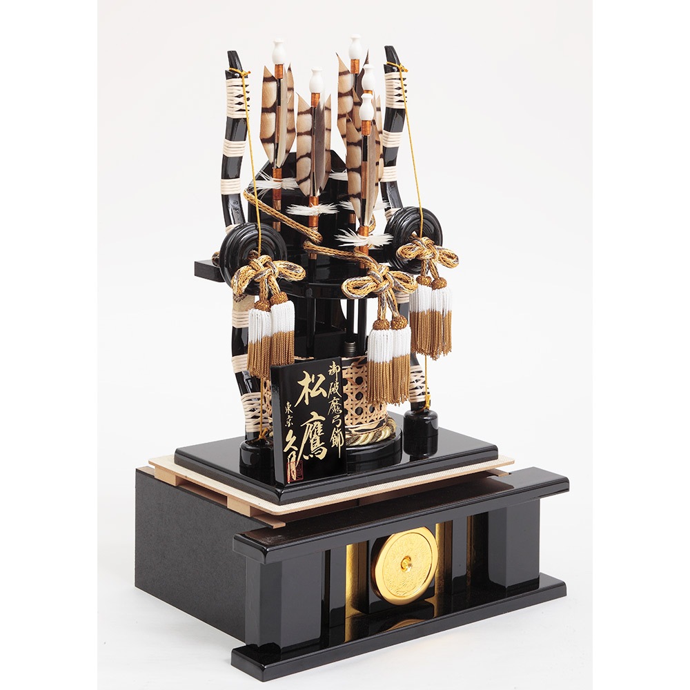 黒塗りのシックなケースが飽きの来ない魅力を感じさせる、根強い人気を誇る破魔弓飾りです。