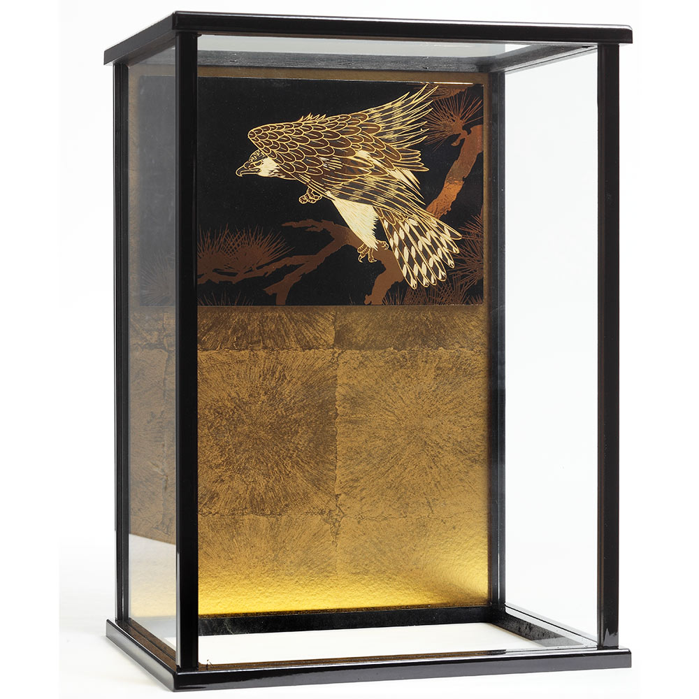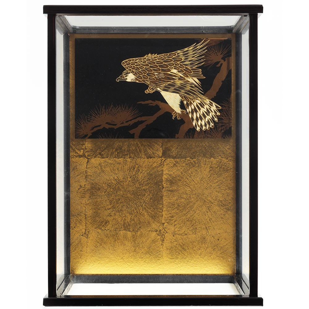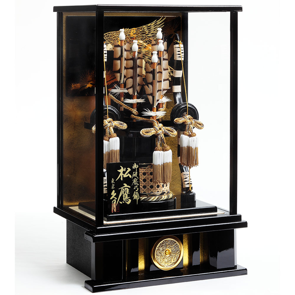 煌びやかな金色のケース背景にあしらわれた迫力ある飛躍を意味する鷹と落ち着きある中造りが見事にマッチし、趣のある縁起の良い魅力的なお飾りです。