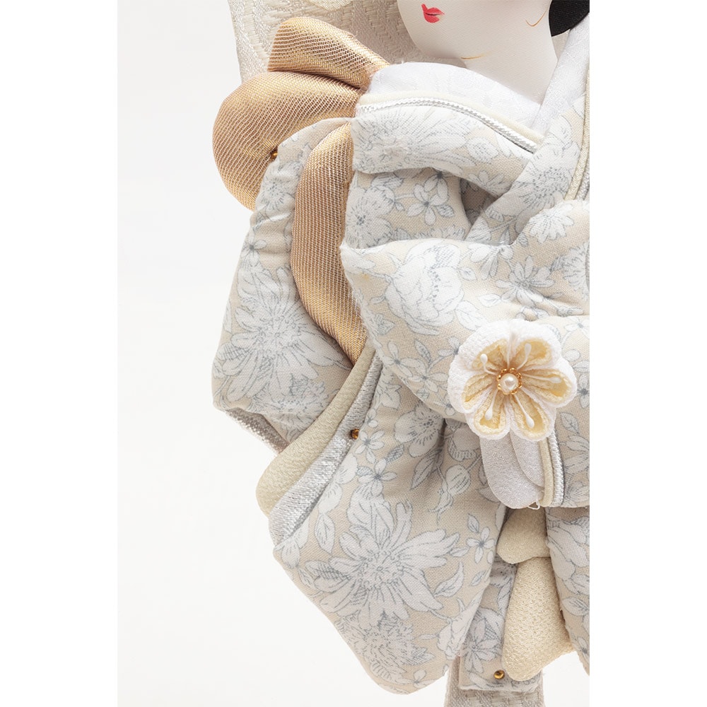 羽子板の髪飾りや手に持つお花も淡い色で合わせており、洋風な雰囲気の中にも優しい微笑みを浮かべた表情が落ち着きを感じさせます。