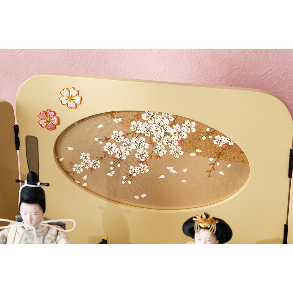 ベージュ色の柔らかな色合いが素敵な飾り台と屏風に添えた、桜を表現した愛らしい刺繍の装飾も、優し気に佇むお人形を一層引き立てます。
