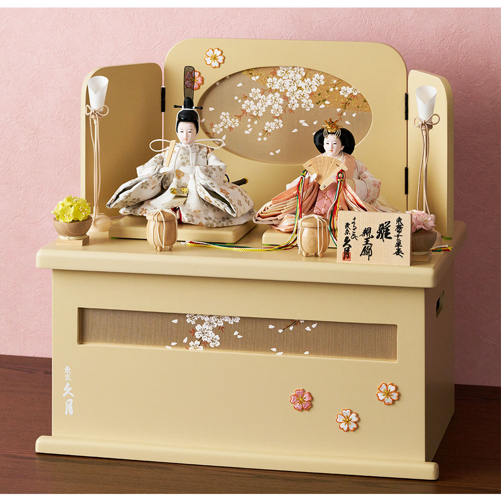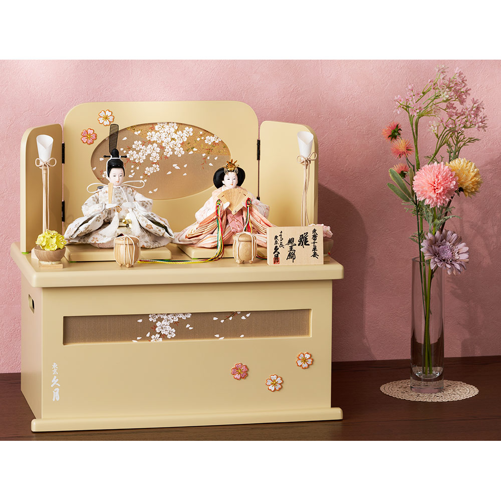 全体を春らしい暖か味のあるテイストで仕上げた、フローリングのお部屋にも違和感無く調和する、優美で可憐な雰囲気に魅せられる人気の収納タイプの親王飾りです。