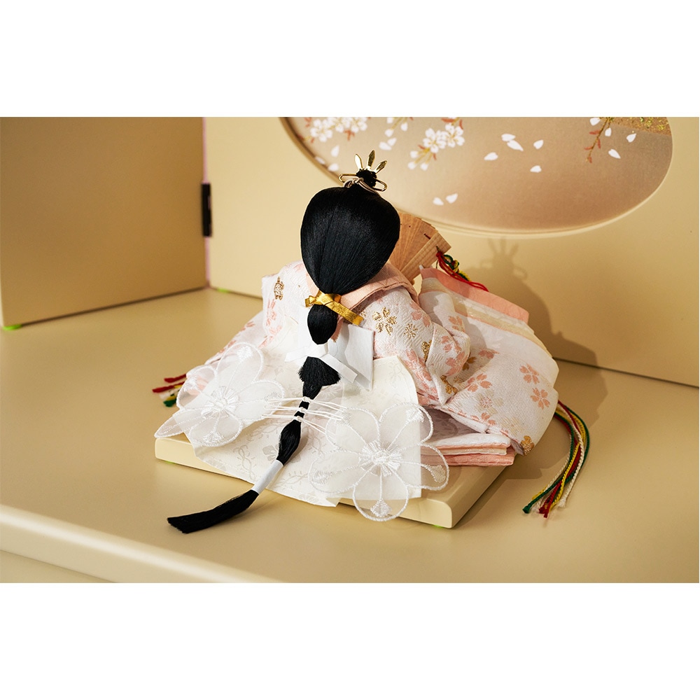 白を基調とした明るい色彩の衣裳にあしらった、優美な桜の柄も春らしさを醸し出す、女の子のお祝いに相応しいおひなさまです。