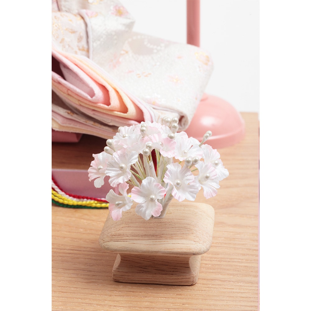 白を基調に仕上げた春らしいテイストの衣裳にも、可憐な桜の柄をあしらった、春の訪れを感じさせる暖か味のあるデザインが魅力です。