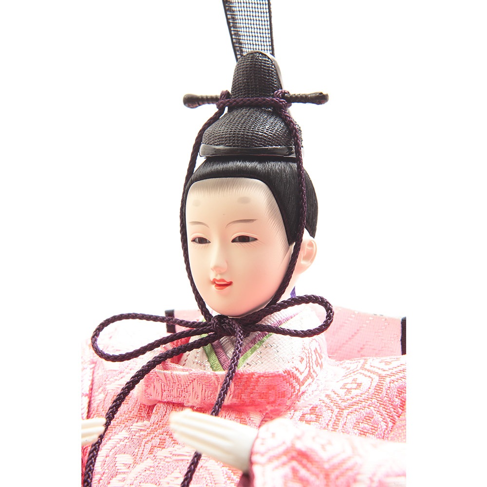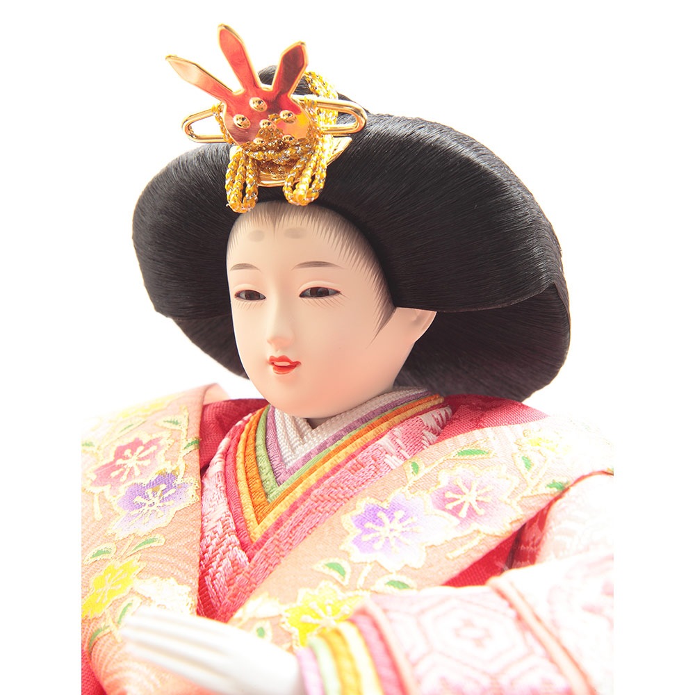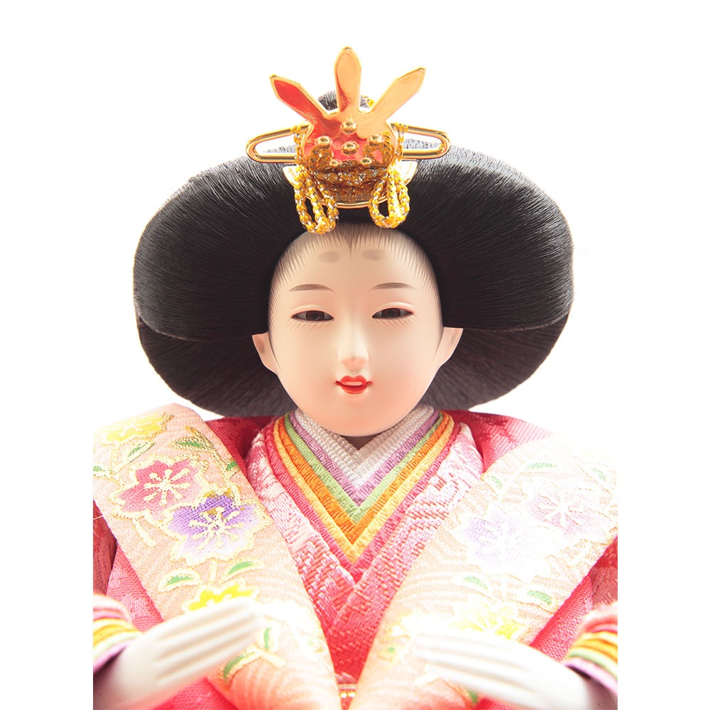 女の子の晴れの日のお祝いに相応しい、明るく優し気な色合いで全体をコーディネートした、うららかな春の訪れを感じさせるおひなさまです。