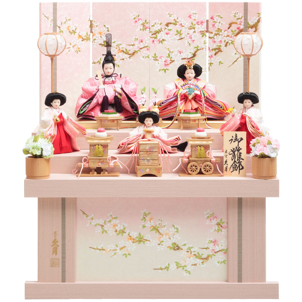 可憐な枝桜を描いた春らしいデザインが素敵な飾り台と屏風に、桃色の衣裳をまとった愛らしく微笑むお人形が見事に映えます。
