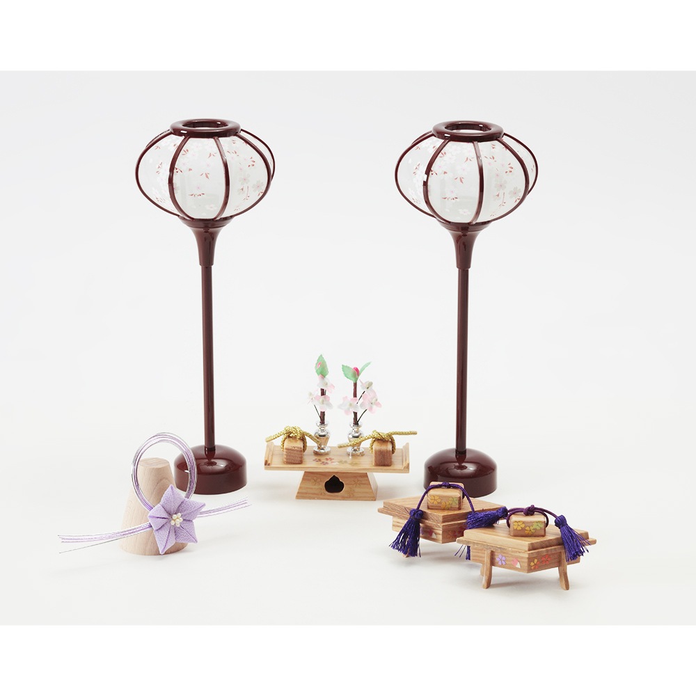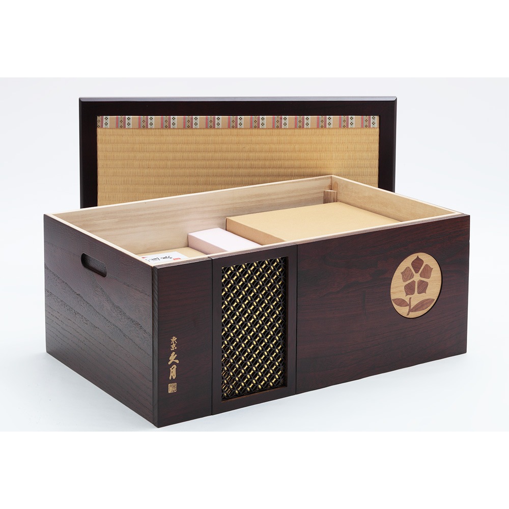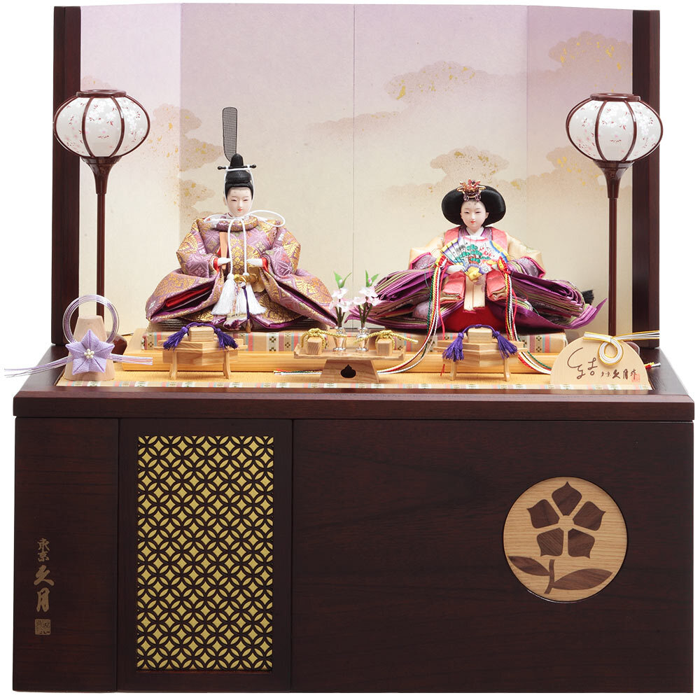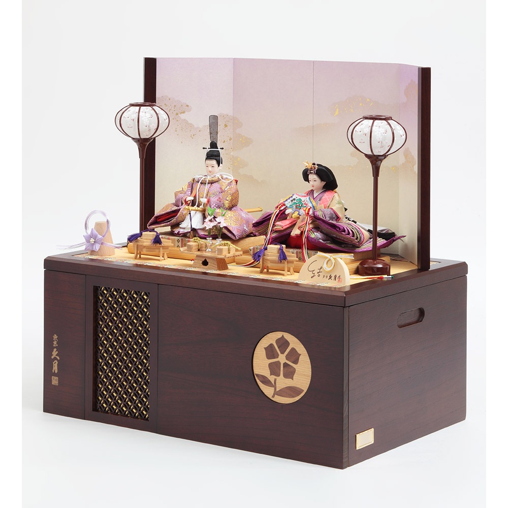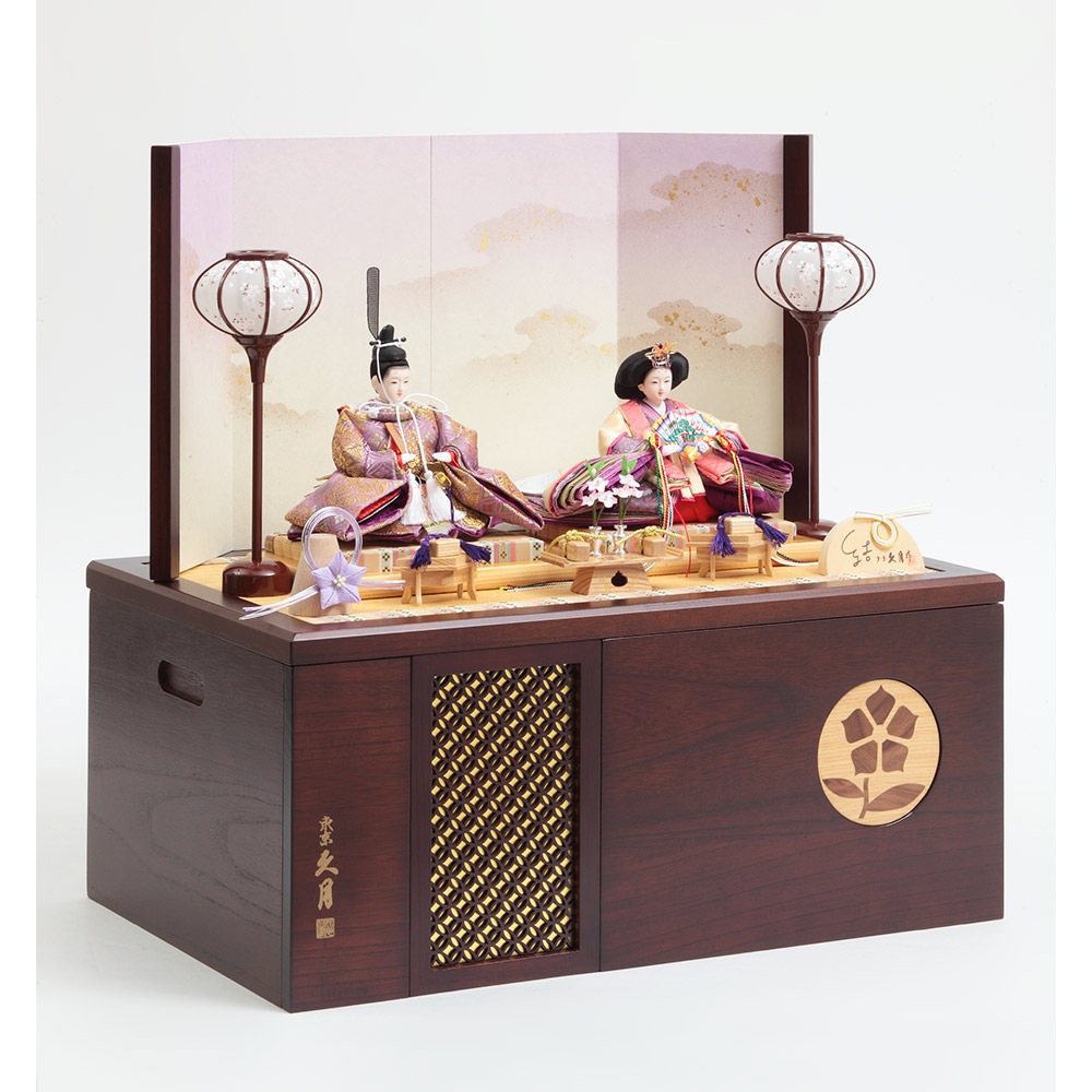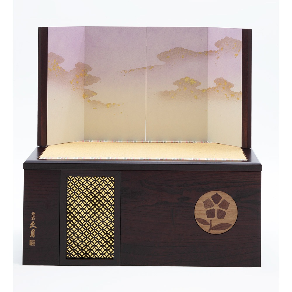 桔梗のモチーフを象嵌の装飾で施した、こだわりのデザインが魅力の飾り台は、お人形やお道具類の収納ボックスを兼ねており、省スペースに仕舞える点も特長です。