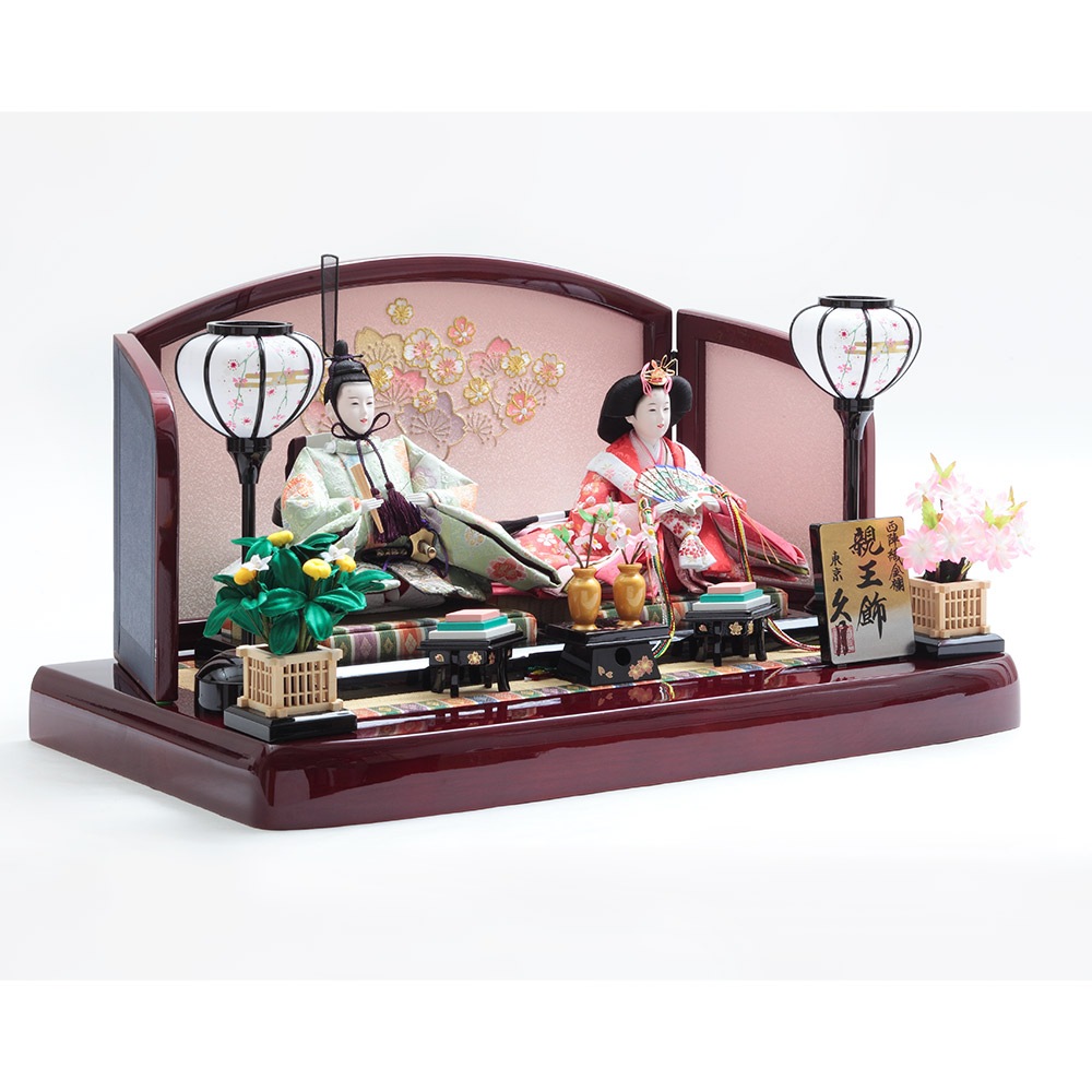 高級感のあるワインレッドの色合いが印象的な和モダンなテイストの飾り台に配した、クラシカルな雰囲気のお道具や桜橘も、上品な佇まいのお人形を一層引き立てます。