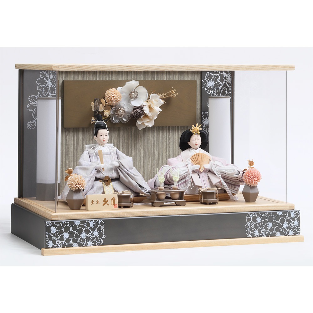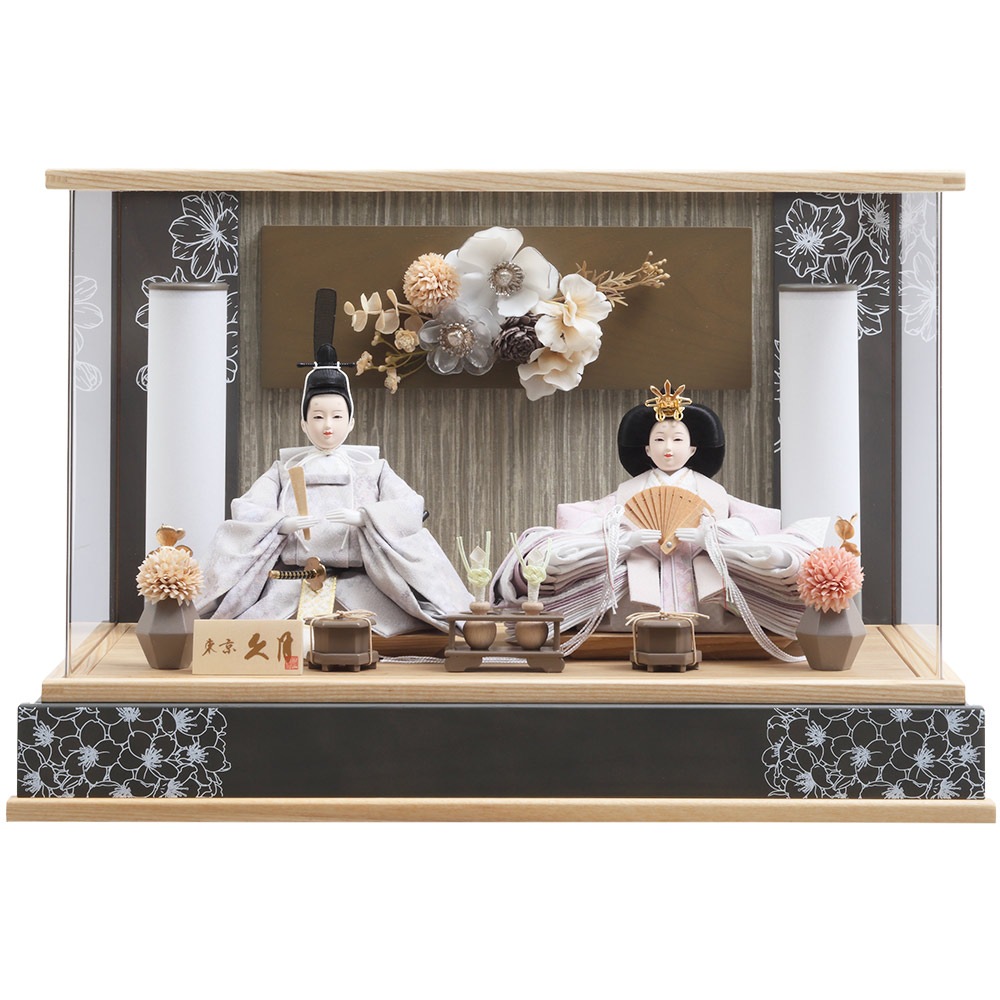 ケースの随所に描いた趣のある花の絵柄も、全体の統一感を見事に高める、フローリングのお部屋にも違和感無くマッチするケース入りの親王飾りです。