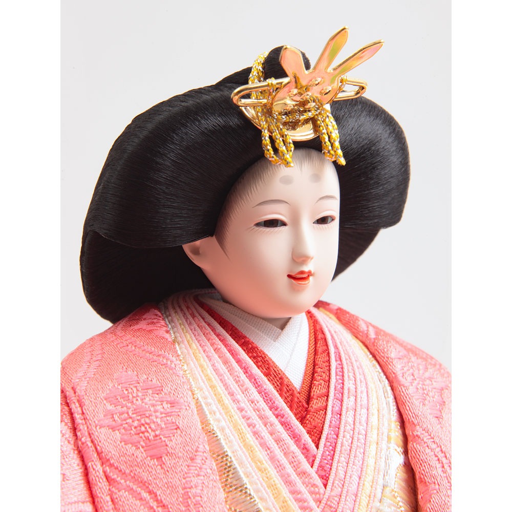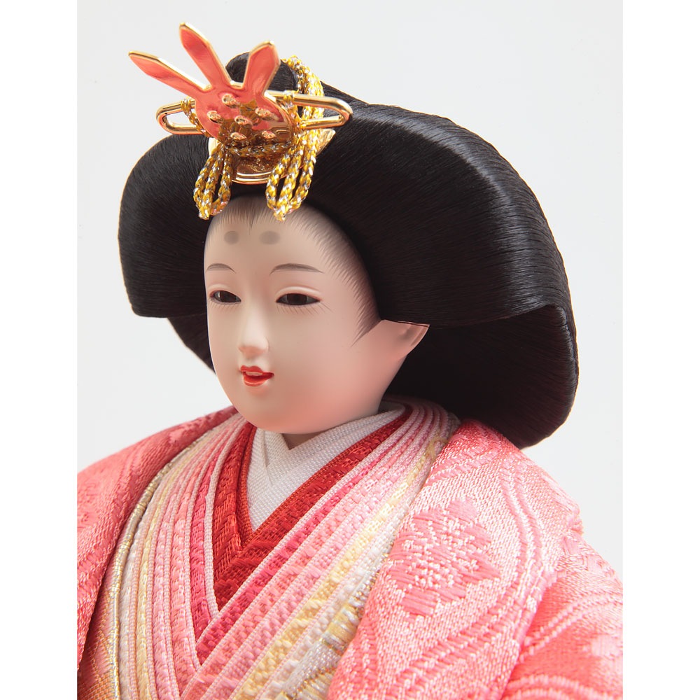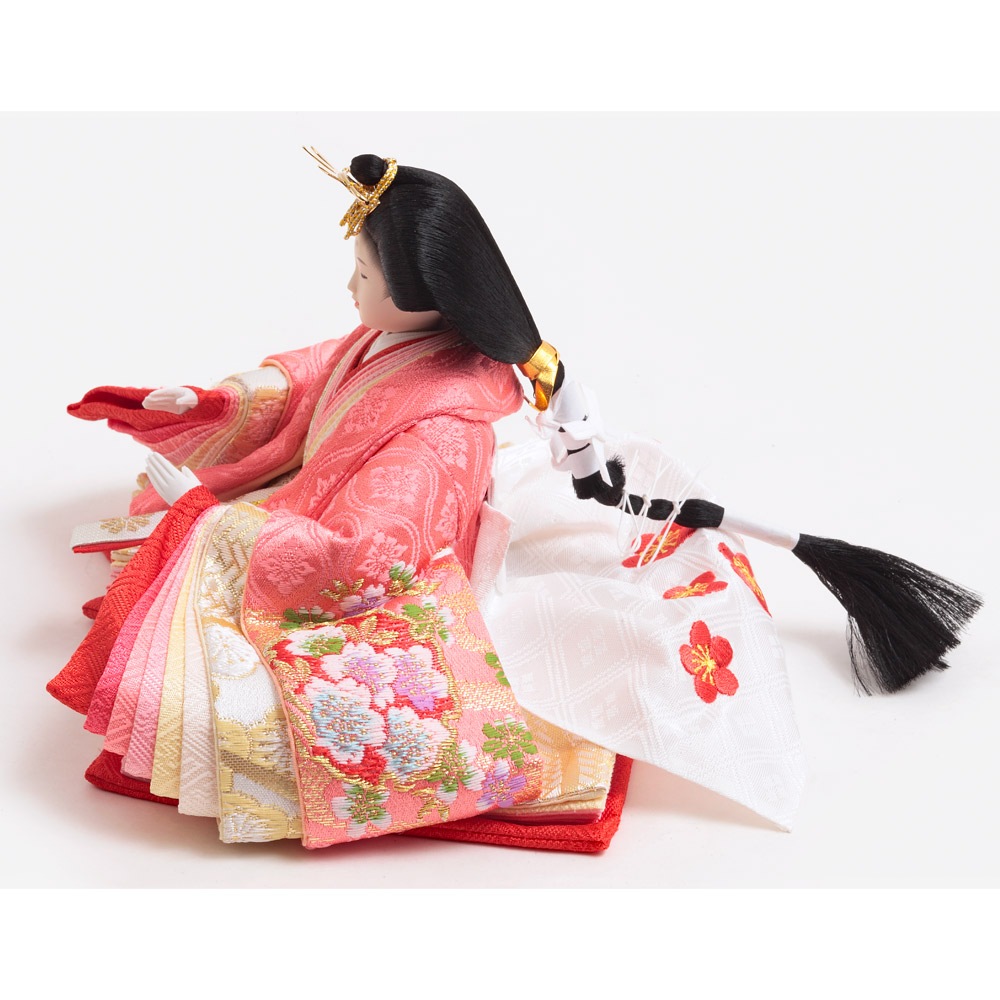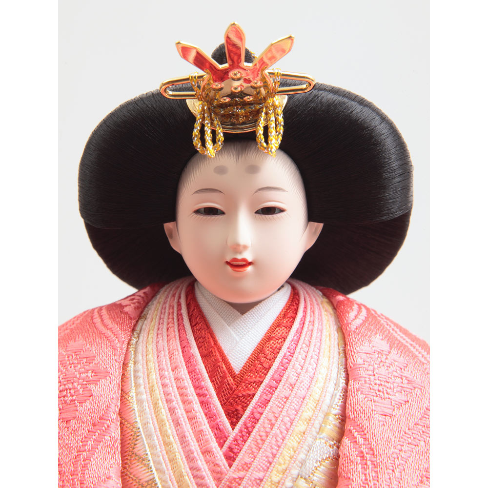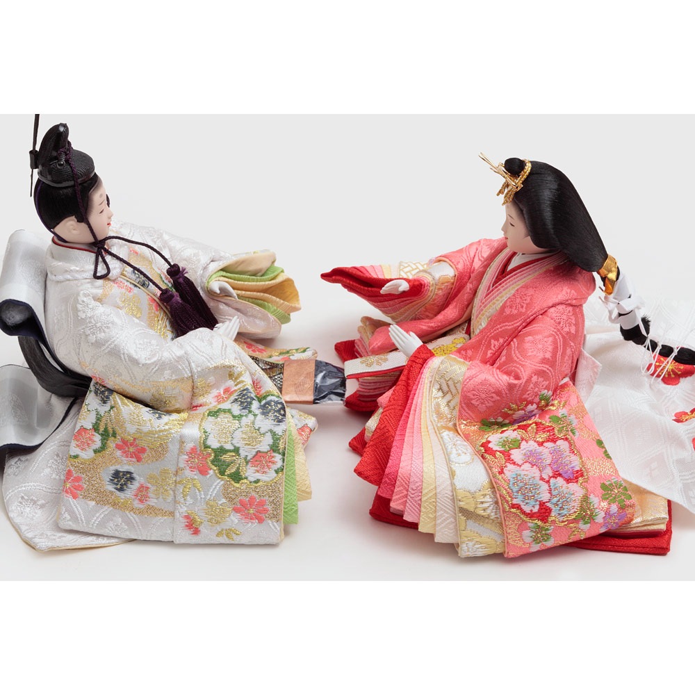 風情のある満月と流水を描いた鮮やかな茜色の屏風と、飾り台に敷いた魔除けの意味を持つ赤色の毛氈も、春らしい爽やかな色彩のお人形を一層引き立てる、和室はもちろん洋間にも違和感無くマッチする人気のおひなさまです。