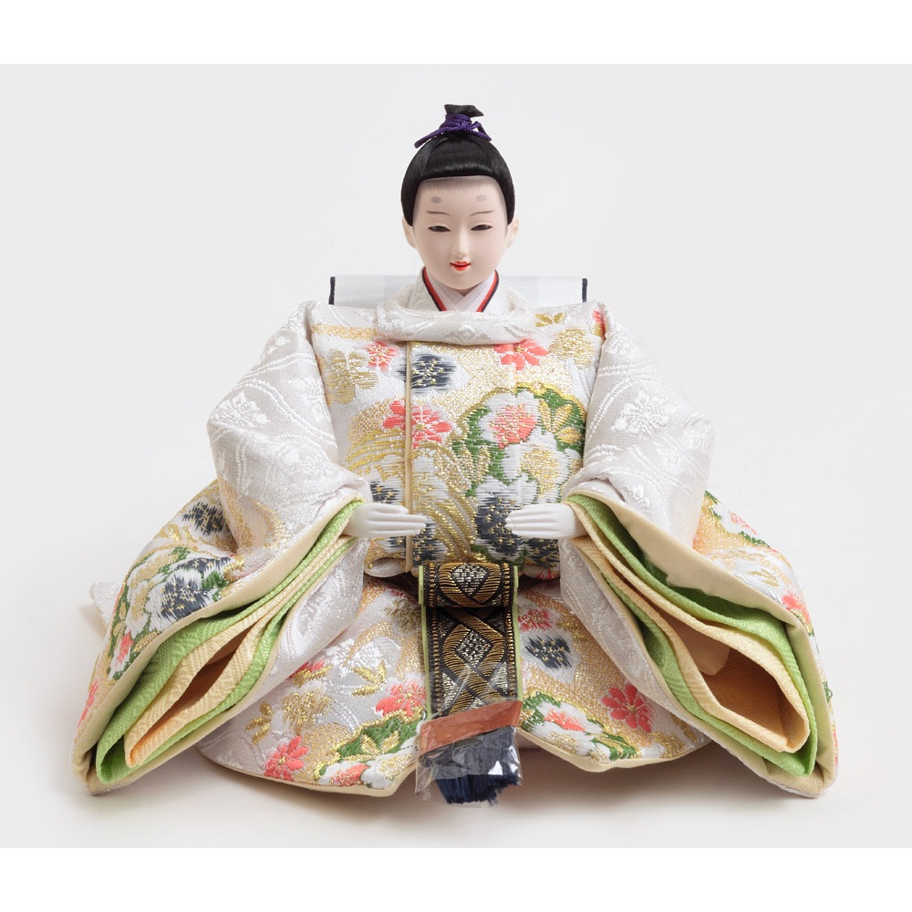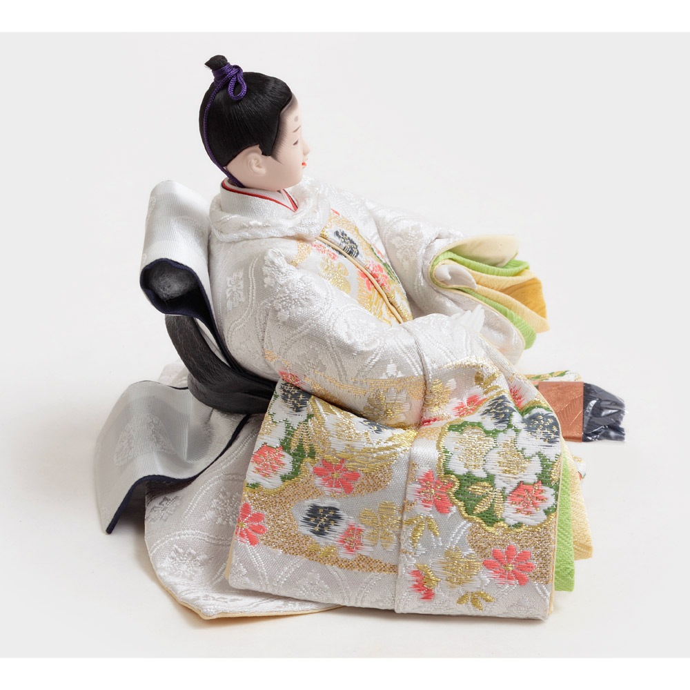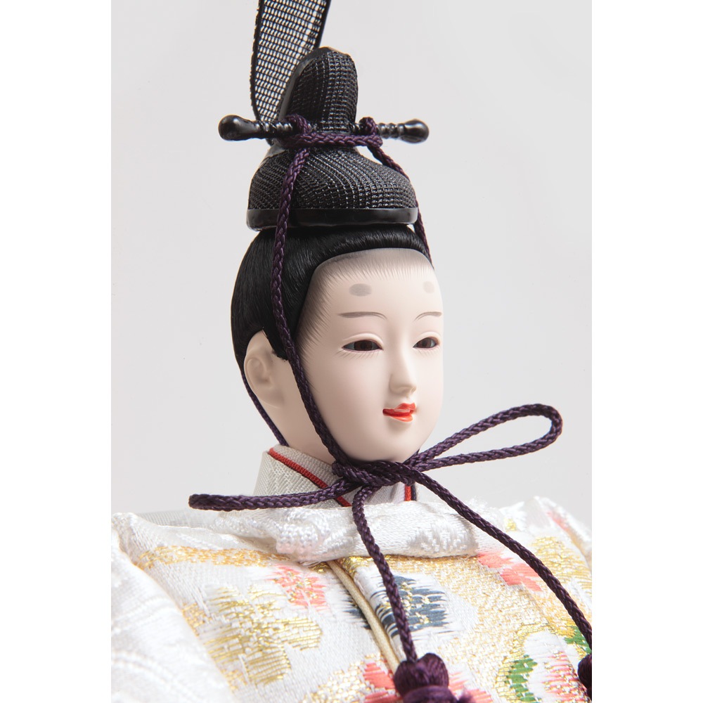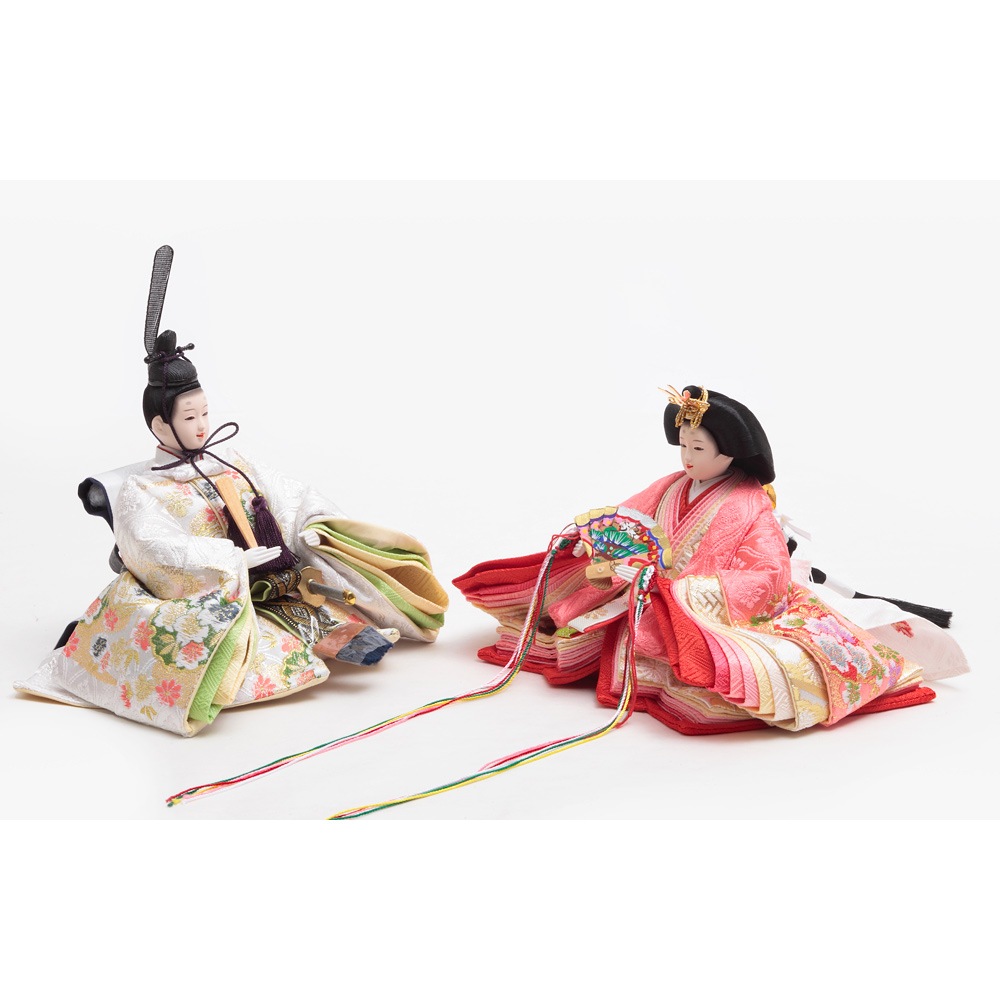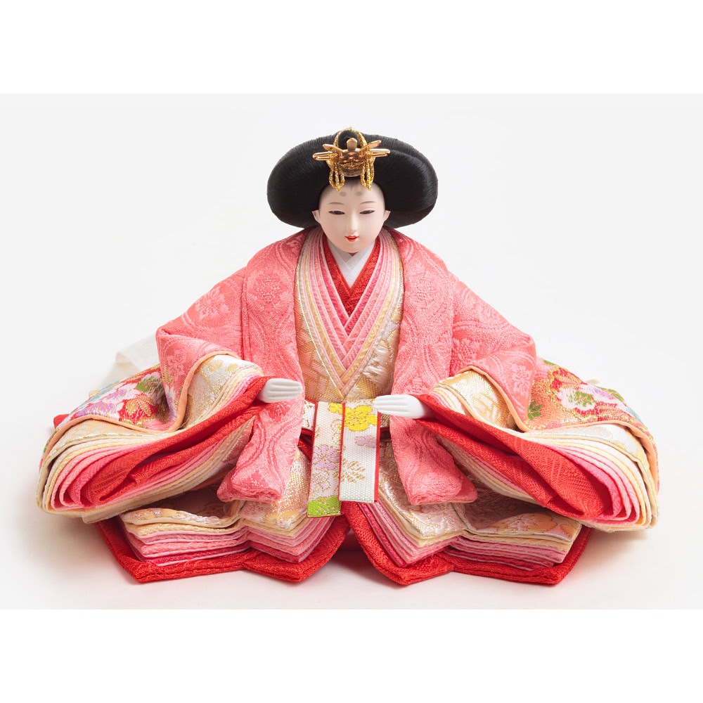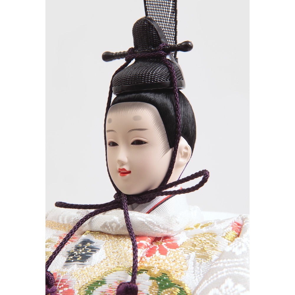 風情のある満月と流水を描いた鮮やかな茜色の屏風と、飾り台に敷いた魔除けの意味を持つ赤色の毛氈も、春らしい爽やかな色彩のお人形を一層引き立てる、和室はもちろん洋間にも違和感無くマッチする人気のおひなさまです。