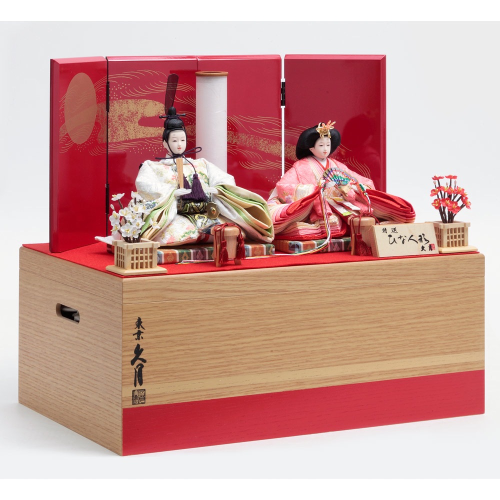 お人形やお道具類の収納ボックスを兼ねる飾り台に施した、茜色のアクセントカラーも全体の統一感をより高める、飽きの来ないこだわりのデザインが特長です。