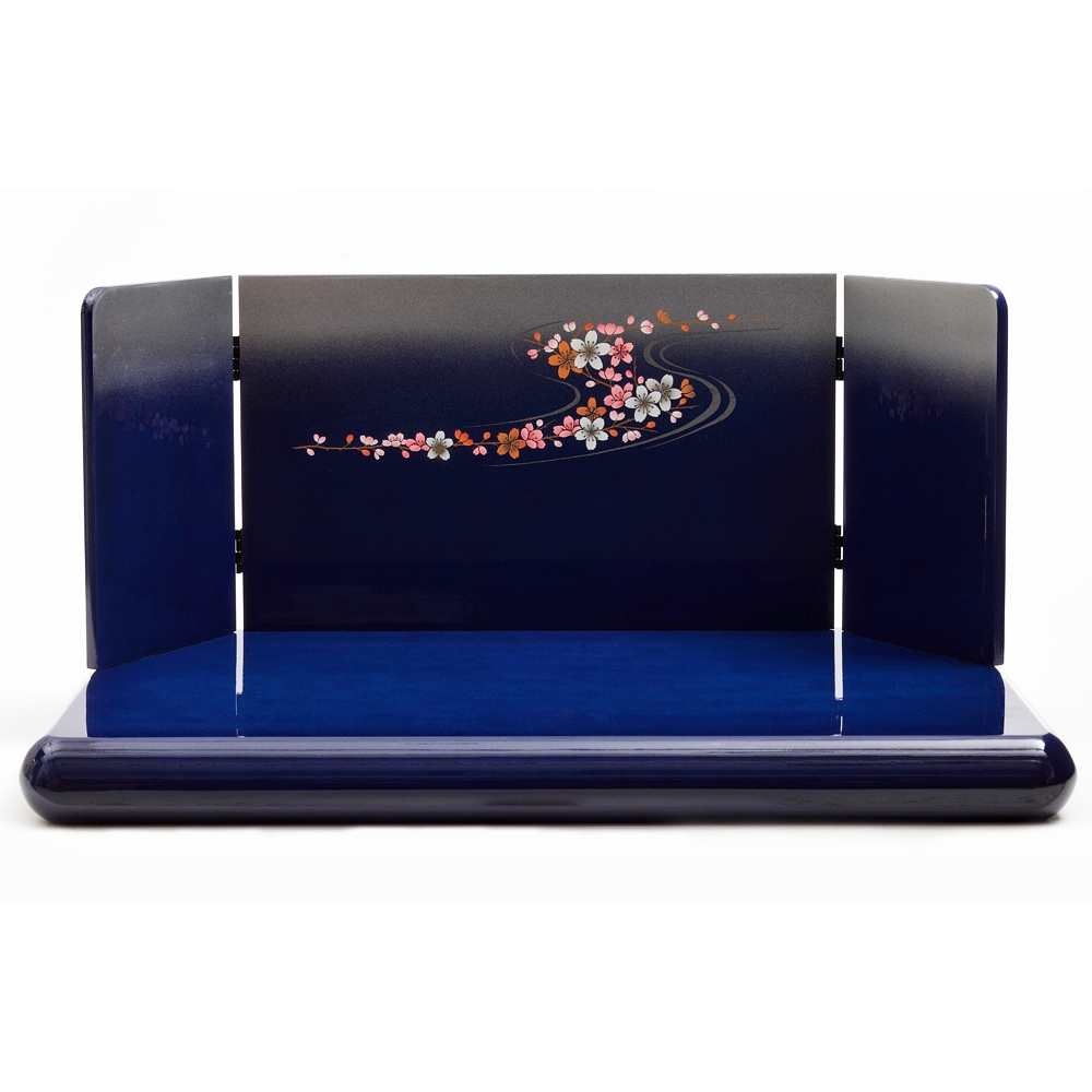 高級感のあるネイビーブルーの飾り台に、春らしい爽やかな色彩のお人形が良く映える、飽きの来ない美麗な趣に魅せられるおひなさまです。