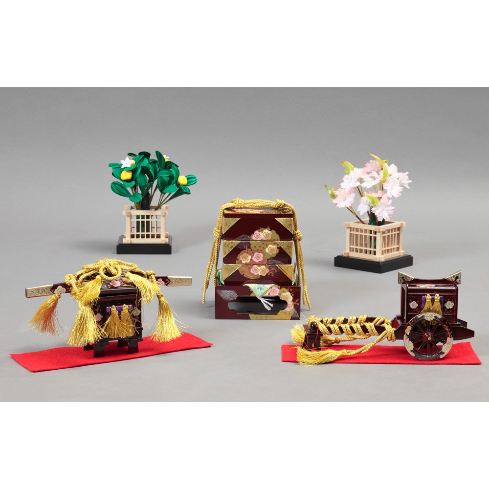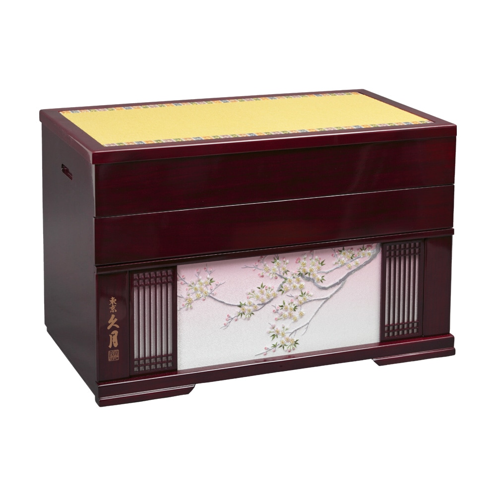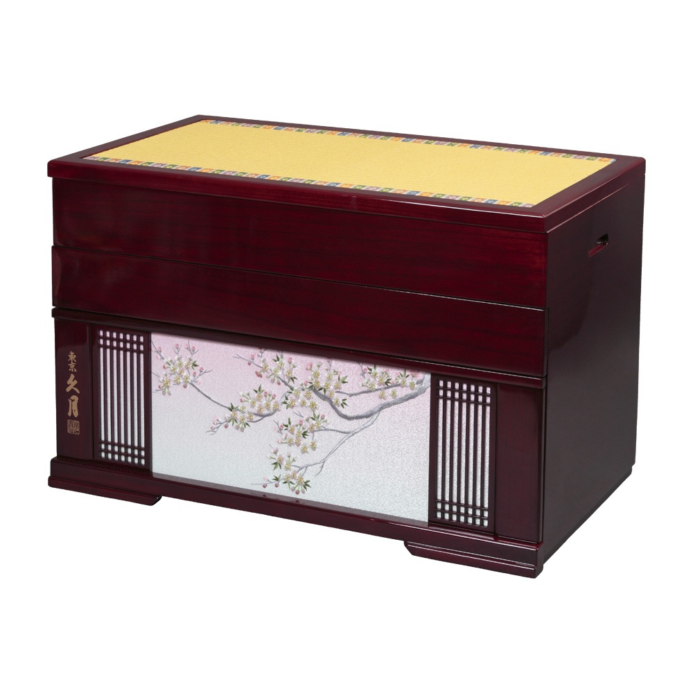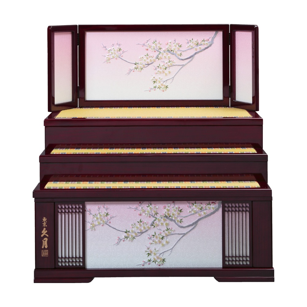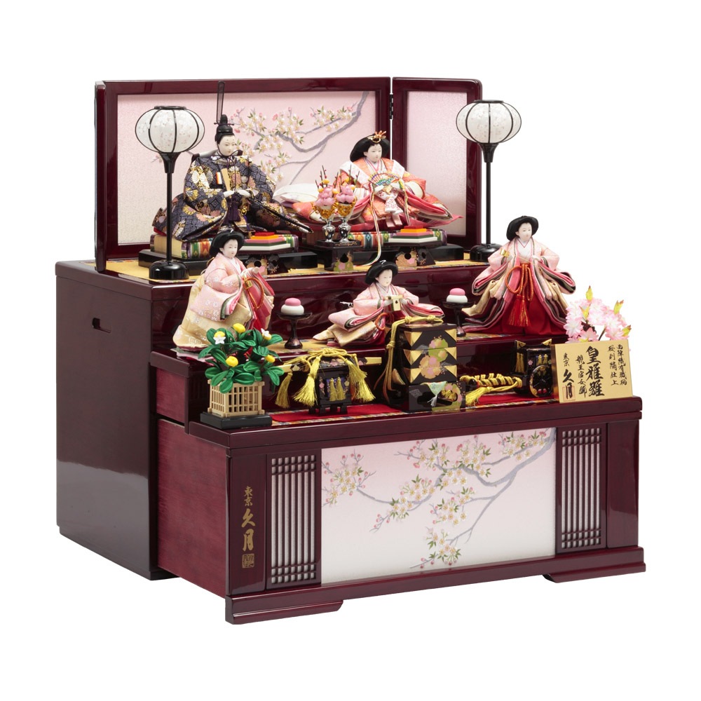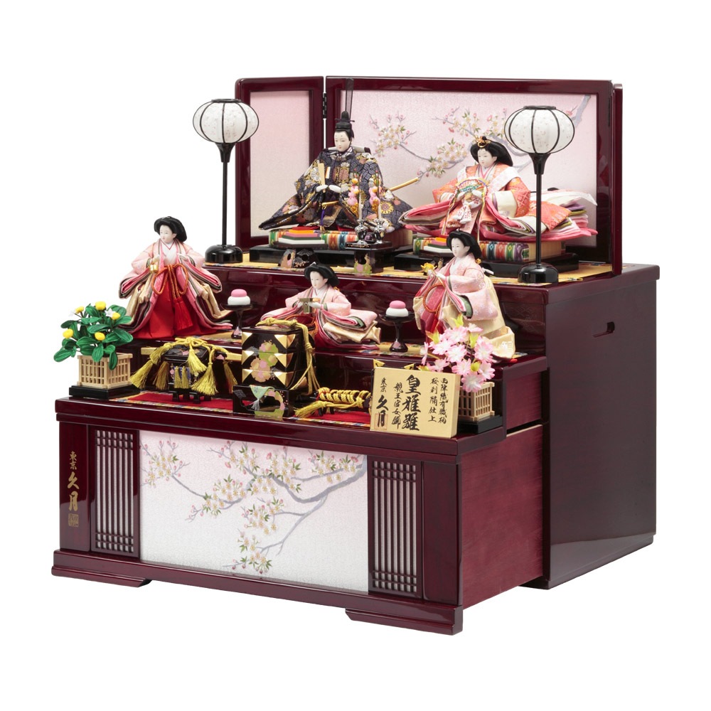 趣のある格子の装飾をアクセントに施した、高級感のあるワインレッドの色合いも素敵な引き出し式の便利な飾り台は、お人形やお道具類の収納ボックスを兼ねており、省スペースに仕舞える点も特長です。