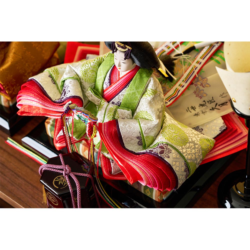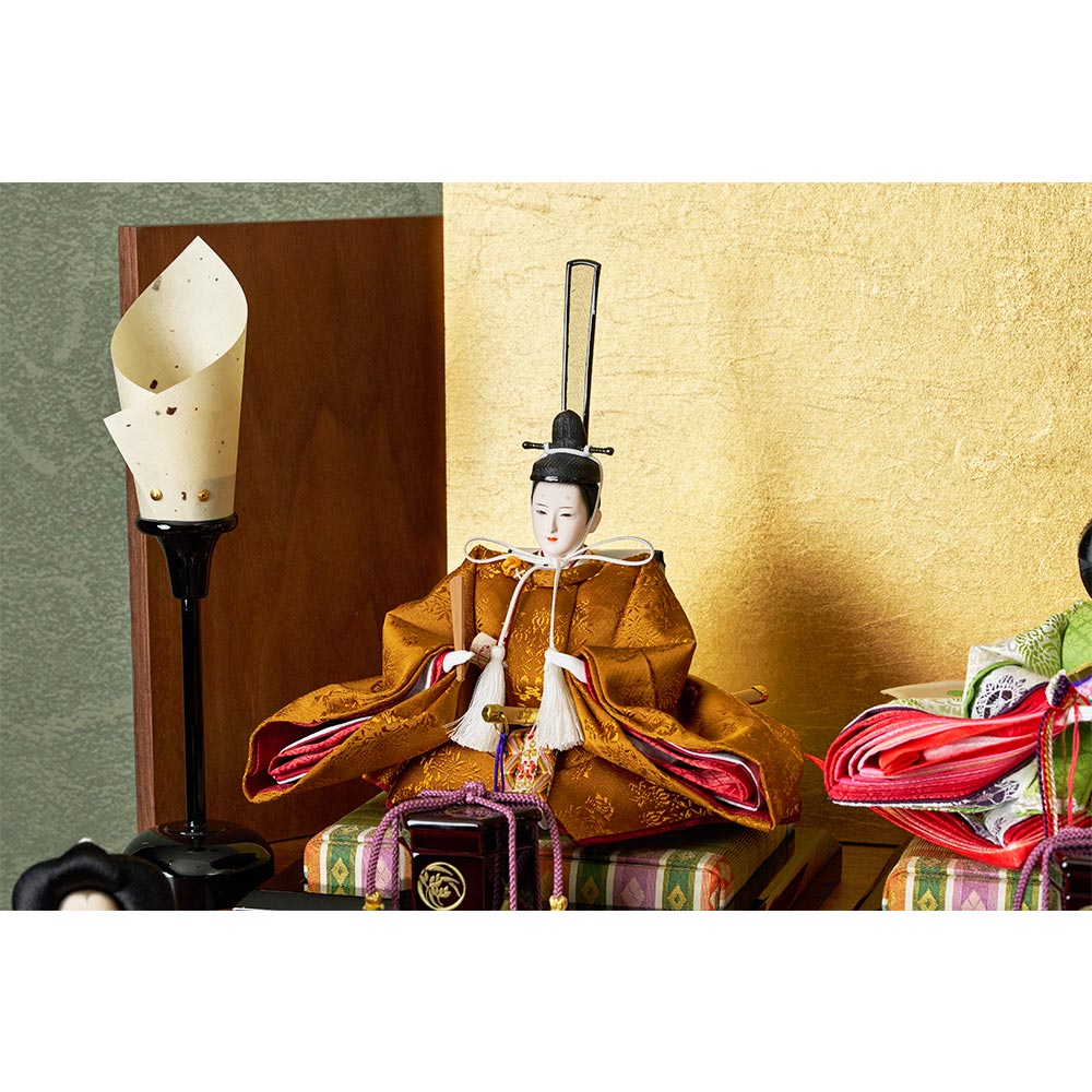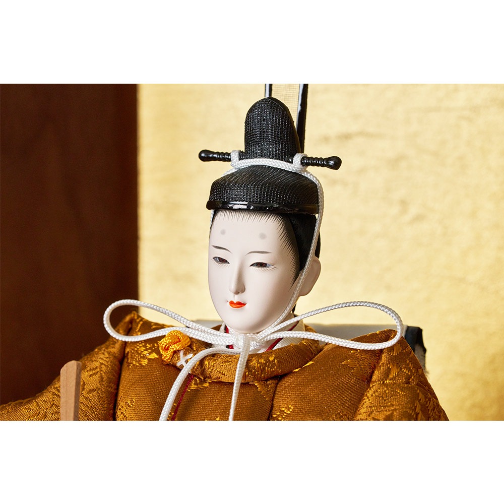 平安装束の中でも最高位として位置づけられる黄櫨染御袍(こうろせんのごほう)を再現した男雛と、向い鶴文の唐衣にハマナス御印文の表着をまとった女雛が、洗練された和モダンなスタイルが魅力の飾り台と屏風に見事に映えます。