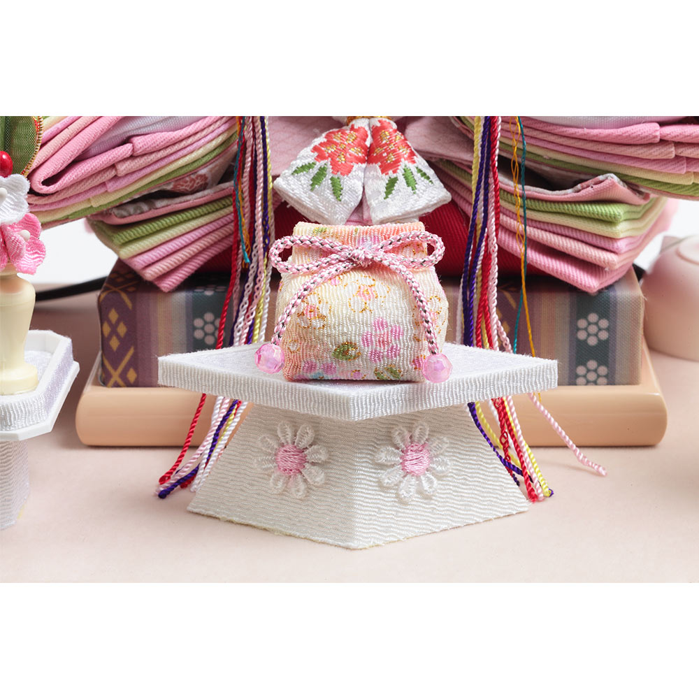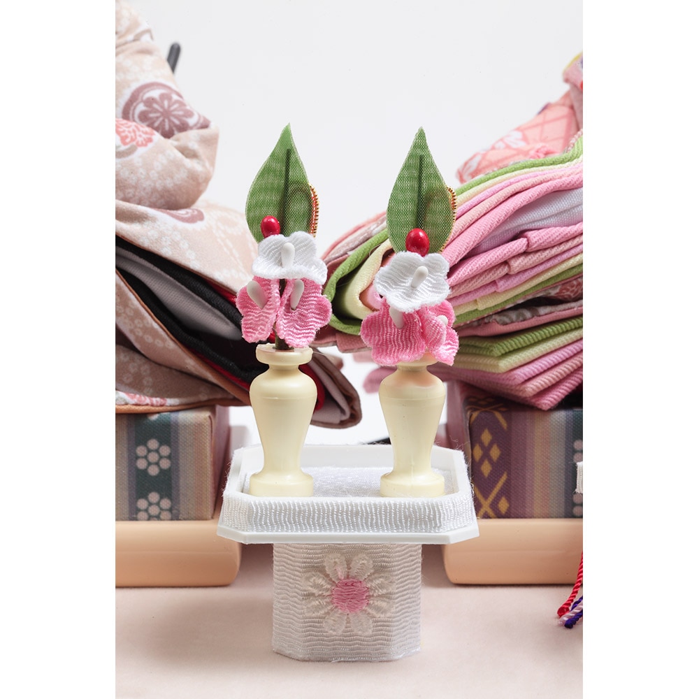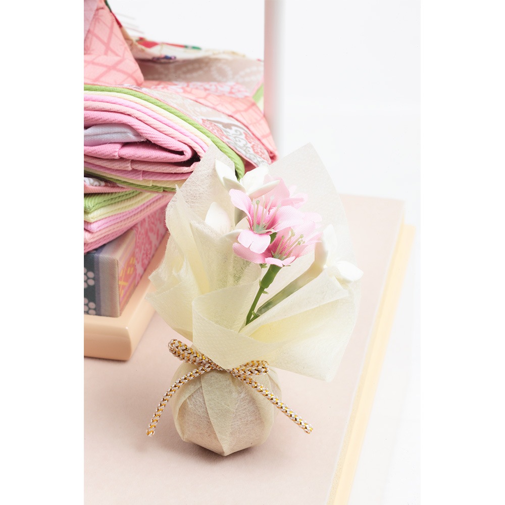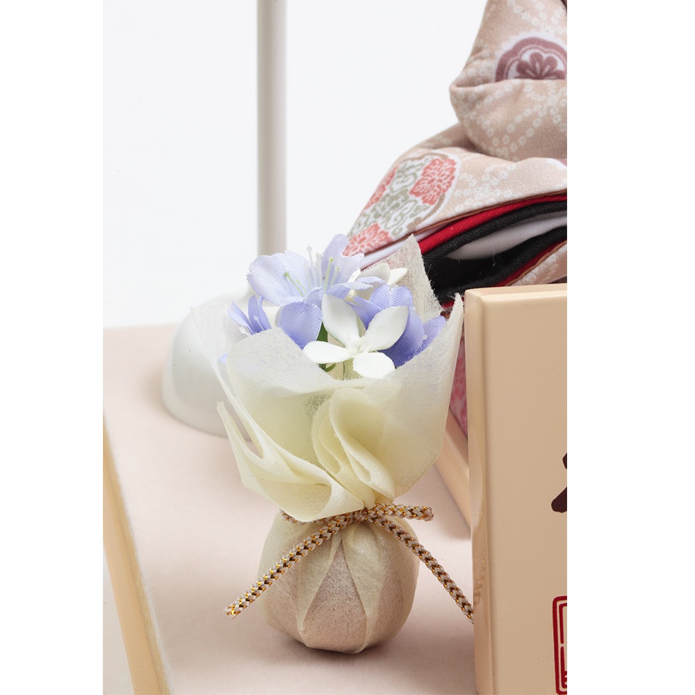 優美なアイボリーカラーのケースに配した、ちりめん仕立てのお道具やモダンなテイストの洋花飾りも全体と良く調和する、統一感のあるこだわりのコーディネートも素敵です。