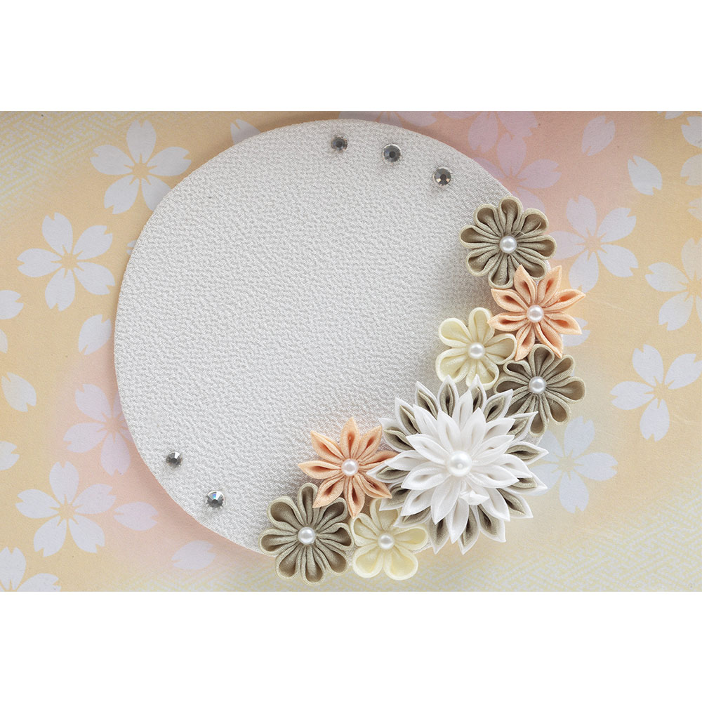 ケース背景に添えたつまみ細工の花飾りも、可愛げな佇まいのお人形を一層引き立てる、うららかな春の訪れを感じさせる優しさ溢れるデザインが魅力のお飾りです。
