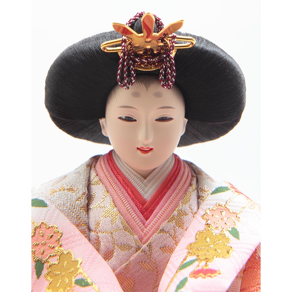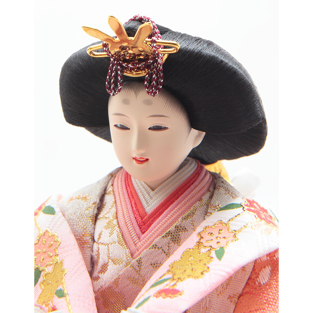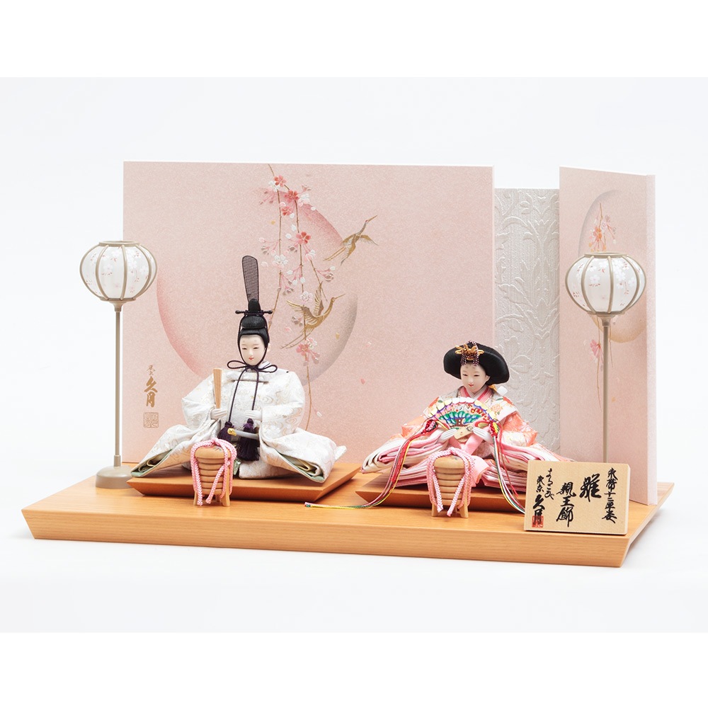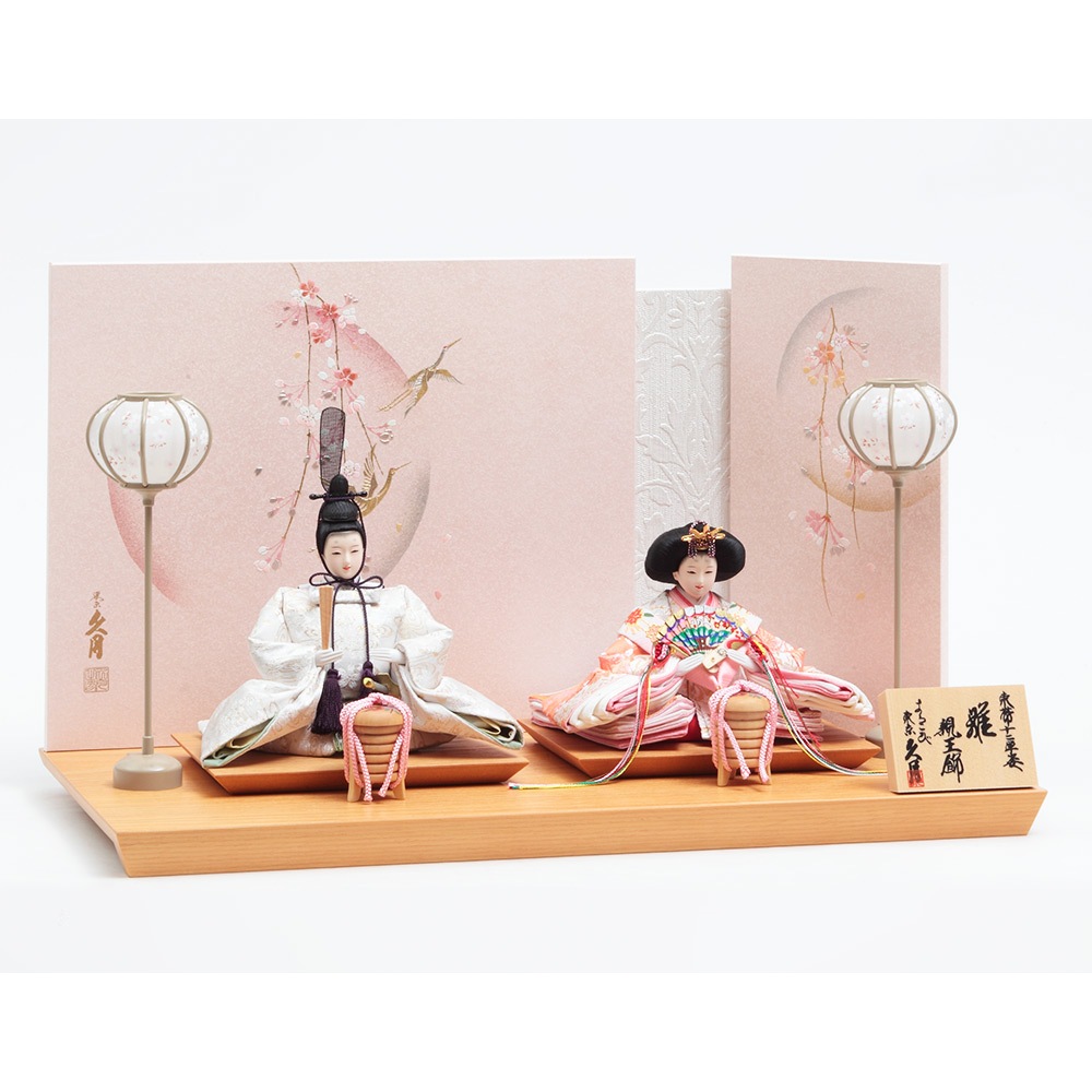 桜と鶴の絵柄をあしらった優美な色彩が魅力の屏風に、色合いを合わせた明るく可憐なお人形が見事に映えます。