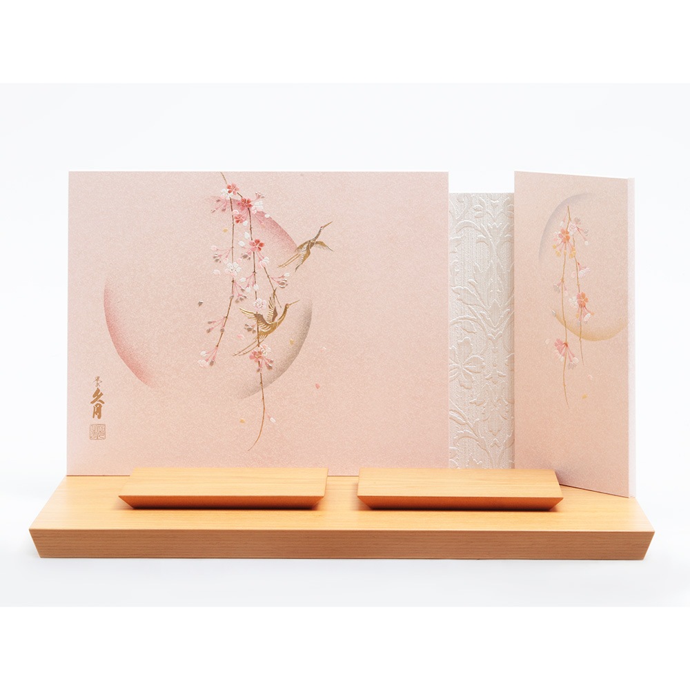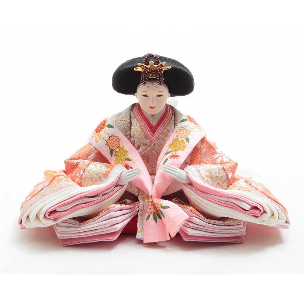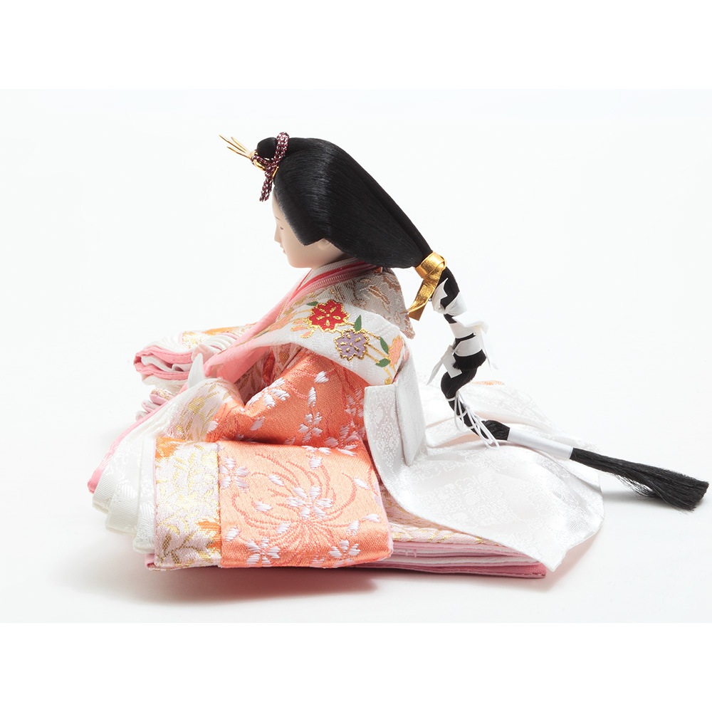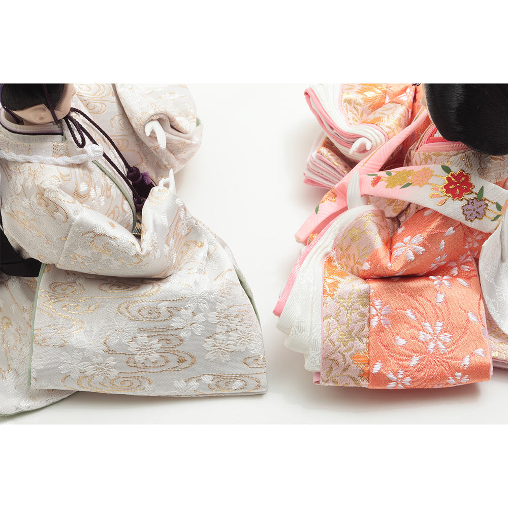桜と鶴の絵柄をあしらった優美な色彩が魅力の屏風に、色合いを合わせた明るく可憐なお人形が見事に映えます。
